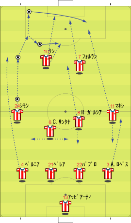 「ビジャレアル対アトレチコ・マドリー」 「注目の一戦はビジャレアルの完勝に終わった」 「内容も結果もというやつやな」 「ビジャレアルはいまやリーガの良心と呼ばれつつある」 「レアル・マドリーもバルサもアトレチコも今ひとつの世の中で、チームとしてきちんと設計されたチームではあるな」 「今回は、その設計の一部を見ていこう、とまあそのようなわけや」 「よかろう」 「先発は以下のようになっていた」 「アトレチコの左がシモンでないことを除けば、いつものみんなという感じやな」 「この試合で、誰がすごかったかというとピレスがすごかった」 「抜群の働きやったな」 「ビジャレアルの1点目と2点目は、まさに彼が起点になっていて、最初は左からドリブルで中央に持ち込んだボールを左に流れるロッシにパスしたところから始まった」 「2点目も崩す流れとしては、同じ形やった」 「ビジャレアルの動きを見ると、明らかに左のピレスが中心で、模式的にあらわすと下のようになる」 「ピレスが中に入ってロッシが外に逃げる、カプデビラが外側からフォロー中にセナが入って、ニハットとカソルラがゴール前、右のベンタはあまり深いところまで上がらず、組み立てに重点を置くと」 「そのような感じやな」 「ここで最近よく思うことがあるのだがな」 「なんや」 「リーガの上位というのは、左利きのチームばかりではないかね」 「左利きか」 「左サイドを中心に崩していくチームを左利きとすると、このビジャレアルは正に左利きやろ」 「まあそうやな」 「普段のアトレチコ、つまり、左にシマオがいる時は、これまた左利きやろ」 「シモンな」 「図でいうと下の感じや」 「シモンがサイドでボールを受けて、ざっと縦に押し込んで、そこから縦か中の二択か」 「シモンはドリブルのスピードでピレスに勝る代わりに、パスでは劣るのであまり複雑な攻めはできない」 「キャラクターの違いというやつやな」 「アトレチコがいい形で攻める時はこれが多く、いうたら左利きや」 「そうかね」 「そんで、バルサも左利きやろ」 「アンリやな」 「左にボージャンでもいいけど、相手をより崩せるのはアンリの方や」 「とーんとーんとすこし跳ねるようにドリブルをして、ぎゅっと縦に抜けるか、そのフェイクから中にいくかが得意技やな」 「縦にいったらクロス、中に入って逆サイドへのシュートか上がってくるイニエスタ、シャビにパス」 「アンリ・パターンというやつやな」 「右から有効に崩す場面というのはほとんどない」 「エトーは中に入るし、ザンブロッタが上がってもさして効果的ではないしな」 「つまり、バルサも左利きや」 「さよか」 「2年前、ロナウジーニョがいたころはさらに極端な左利きやったしな」 「過去形にしたらあかんで」 「そして、去年の12月頃、勝っていたころのマドリーも左利きやったやろ」 「ロビーニョか」 「ロビーニョやな」 「シモンと似たような特徴やけど、中に入っての細かいパスがよりうまい」 「相手を引き付けてからのプレーもうまいな」 「つまりは、以上のみなさんすべて左利きなわけや」 「ほほう」 「システムこそ違え、左の前にサイドからゲームを動かす選手を置く、というのは一つの形やと思うんやな」 「その形の強いチームは多いな」 「デコのいたポルトとかやな」 「セードルフのミランもその変形やな」 「昔はロベルト・バッジョのいたインテルも同じような手段を使っていた」 「リーガに関係の深いところでは、リケルメのいたビジャレアル、ジダンとチャンピオンズリーグを取ったレアル・マドリーなんかがそうやな」 「まあ、強いチームを作る一つのパターンであることは確かやろ」 「今のマドリーとバルサはお世辞にも強いとはいえんけどな」 「それは言わないお約束や」 「なんにしても、このタイプの設計では、その鍵になる左前の選手をいかすために、色々な条件が必要になる」 「そうやな」 「ここでは、その中でも特に重要な一点だけに絞ってチームを見てみようと思うんや」 「もったいぶらんでもええがな」 「話は単純で、下の図やねんけどな」 「なんやこれは」 「要するに、後方からどの形でボールを入れるのが一番いいか、という話や」 「ほうほう」 「まず、右から見ていくと、右サイドバックから、左の中盤に出るパス、これが一番いい」 「いいというか、効果的ということやな」 「これが決まれば、ほぼ間違いなく左前の選手はフリーでボールを持つことができる」 「ディフェンスの移動が間に合わへんからな」 「ディフェンスはボールがあるサイドによる習性があるからな」 「ただ、これは難しいな」 「それはある」 「まず、この距離を正確に蹴れる選手が少ないし、ボールスピードが足りなければ前に出るサイドバックにカットされてカウンターを喰らってしまう」 「悩み深いところや」 「ベッカムやゼ・マリアとかなら可能かもしれんが、まず人材が見つからない」 「