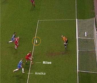 「プレミア対決の第一ラウンドは引き分けに終わった」 「引き分けということは、アウェーゴールを決めたチェルシーが有利やな」 「そうやな」 「ちなみに、そのゴールが決まったのは94分」 「なんともドラマティックやったな」 「おまけに、オウンゴール」 「リーセが、自分のゴールに完璧なヘディングシュートを決めた」 「ショックやったやろな」 「そらそうやで」 「チャンピオンズリーグの準決勝やしな」 「ところで、この得点に関しては二つ派閥があるように思われる」 「二つとはなんや」 「オウンゴールに対して、”あれはしょうがない”と思う派閥と、”足ならクリアできた”と思う派閥の二つやな」 「しょうがない派と足で行け派か」 「果たして、そのどちらが正しいのか、決着をつけてみようというのが今回の狙いやんやな」 「そうなんか」 「まずは、下の写真から見ていこうかと思う」 「もとの絵はエル・ムンド紙からやな」 「そうやな」 「これは、リーセがヘディングのモーションに入った瞬間か」 「そして、ヘディングの瞬間は次のようになる」 「ふむ」 「上の二つの写真で、カメラ位置はまったく変わっていないから、大体のボール軌道がわかる」 「ゴールに近づくボールなわけやな」 「逆にいえば、リーセからは離れていく」 「こういう状況でのクリアは難しい」 「ボールを追いかける状況では、そもそも足に当てるのも難しくなるしな」 「ブロック崩しと同じ原理やな」 「下手な人はボールを後ろから追いかけることが多く、上手い人ほどボールに向かって板を動かすからな」 「ゲーセンにあるエア・ホッケーでも同じことやな」 「ついでに言うと、この状況では、リーセが触る前にボールはワンバウンドしていてたので、クリアはさらに難しい」 「まあそうやな」 「実に厳しいシチュエーションなわけや」 「確かに、ディフェンスにとって厳しい状況ではあるが、なぜ足ではなく、頭で行ったのか、という疑問は残るやろ」 「それはこういうことやな」 「足か」 「足やな」 「これだと、右足を出すのは無理やな」 「この状態から右足を出しても、軌道に届かない。かといって、右足を地面に着いてしまうと、次には左足しか出せない」 「左足でのクリアは厳しいな」 「届くのは届くだろうけど、クリアボールの方向と強さをコントロールするのは難しい」 「これを右足でクリアしようと思うと、足を一回変えないとあかんな」 「すると、ボールはもう目の前を通り過ぎてしまう」 「下の感じか」 「そうなると、後ろのアネルカに叩かれて終わる」 「つまり、リーセは頭で行くしかなかったと」 「まあそういうことになる」 「しかしや」 「なんや」 「それなら、走りこむ前の段階で、右足でクリアできるように足を整えておけばよかったという話にならんかね」 「それは無理やろ」 「まあな」 「クロスに対して動き出す前は、アネルカをマークしなければならないから、動きはアネルカに対して良いポジションを取ることで決まる。そこで、クロスのコースを完璧にイメージして足の動きまで調整できるとしたら、それはすごいで」 「不可能かね」 「不可能ではないかもしれんが、神様にしかできんのとちゃうかね」 「つまり、結論は頭でいくしかないと」 「少なくとも、右足でのクリアは不可能やな」 「それにしても、これでチェルシーは大分有利になったな」 「後はホームで守り倒しても大丈夫やからな」 「果たして結果はどうなるか」 「お楽しみというところで」 「また次回」 「ご機嫌よう」 おまけ:先発