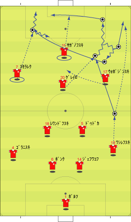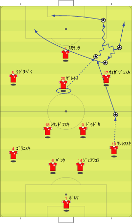 「優勝候補の一つやな」 「その噂に違わず、完封勝利を収めたのではあるがだ」 「なんだ」 「負けたポーランドが実にいいチームだった」 「それは言えるな」 「今回はその辺りを見ていこうかと思うわけや」 「よかろう」 「まず、先発はこう」 「ドイツは1-4-4-2、ポーランドは1-4-2-3-1」 「開始直後は、確かにこの配置だった」 「しかしながら、ポーランドはすぐに下の図に変わる」 「最初は、トップに9番のジェラフスキ、その下に8番のクジヌベク、左に7番のスモラレクだったものが、時計回りに一つづつずれた」 「これは、どいういう意図やったんやろな」 「この後の交代から判断すると、スモラレクではラームをマークしきれないので、クジヌベクを当てようという意図だったと思われる」 「ちなみに、このクジヌベクという選手のポジション移動がこの試合の鍵を握る」 「まさにキーマンだったので、8番、クジヌベクの名前は覚えておかれるとよろしいかと」 「それはさておき、ポーランドの攻撃における構造はこうなっていた」 「下から上に攻めているわけやな」 「まず最初に目を引くのは、ボランチ、18番のレワンドフスキからのサイドへの展開やな」 「あまりにもキックが上手すぎて目が飛び出そうだった」 「そんなおおげさな」 「いや、あれだけの速度と精度で蹴れる選手は今のリーガにはいない」 「1-4-2-3-1や、1-4-3-3のようなシステムは、サイド前方の選手に長い斜めボールが通らないと意味がないから、その点では選手とシステムの相性はええな」 「もう一つの特徴は、左サイドバックから右サイドバックへの矢のようなサイドチェンジで、そこから早く縦に送ることで相手を崩す」 「4番のゴラニスキから13番へのワシレフスキへのボールやな」 「ちなみに、ゴラニスキは右利きや」 「ポーランドの攻撃が上手く行くのは、主にこの二つのパターンからになる」 「ただ、少々残念なこともある」 「第一のパターンで、レワンドフスキのボールを受ける、サイドの両選手やな」 「右が17番のウォボジンスキ、左が上でも出てきた8番のクジヌベク」 「この二人は、長いボールのコントロールに難がある」 「せっかくいいパスが来たのに、トラップが流れる」 「ワンコントロールで詰めてくる相手と正対して、そこから仕掛けていけばなんぼでもええ形が作れるのに、コントロールに手間をかけるもんだから、せっかくパスで得た時間的な余裕を無駄にしてしまう」 「もったいないオバケが出るな」 「さらに、左のグジヌベクはラームとの1対1でまったく勝てない」 「右のウォボジンスキは、どうにかコントロールした後の仕掛けではいい働きを見せていた」 「仕掛けていける選手なだけに、トラップの粗がなんとも惜しい」 「なんにしても、前半は、1-0とドイツのリードで終わる」 「開始後にドイツが攻めて、その後ポーランドが押し返す流れだった」 「そして、後半は、これまた面白い展開だった」 「リードを奪われたポーランドは、後半開始からゲレイロを投入する」 「トップ下やな」 「ゲレイロとはスペインっぽい名前であるな、と思っていたら、ブラジル人らしい」 「スペイン系やとゲレーロやろ」 「この選手が非常にいい味を出していた」 「下の形やな」 「中央から右に流れて、ワシレフスキからのボールを受けると、とにかくグニャグニャと左足でボールをキープする」 「その場で足踏みをするようにドリブルができるのは、ポーランドで彼一人やな」 「そこから、真っ直ぐ縦に突破したり、逆サイドに展開したり、相手を引きつけて周囲にスペースを作ったりする」 「ポーランドに足りなかった要素を一人で追加した感じだった」 「彼の活躍もあり、ポーランドは非常にいい時間を迎えた」 「ところが、65分にピシュチェクを入れてから様相が一変する」 「ゲレイロを左に置き、8番のクジヌベクを左のトップのような場所に置いた」 「これはどうしたことかと」 「クジヌベクは、ゲレイロと比較して狭いスペースでボールを扱える選手じゃないから、ぼろぼろとボールを失くす。おまけに、ゲレイロは後ろに走ると対した選手じゃないからラームに対する左サイドにも穴が空く」 「どう見ても、いいことなしやな」 「実際に、この後の時間はドイツに流れが移って、追加点まで奪われる」 「監督のベーンハッカーの意図が非常に気になる」 「右に流れすぎて、右の中盤と重なっていたから、それを解消しようとしたのかもしれん」 「結局、73分に点を取られた後、75分の交代ではポジションを元にもどしていることからも、非常な謎が残る」 「まあ、単純に失敗だったということちゃうかね」 「相手を一点から崩している時は、それを変えずに、むしろ補強する形の方がいいということやな」 「右で重なるなら、むしろ右の選手を中に入れて、逆サイドでは8番のクジヌベクよりもボールを受けて勝負できる選手、シュートまでいける選手、例えばスモラレクを入れる形とか