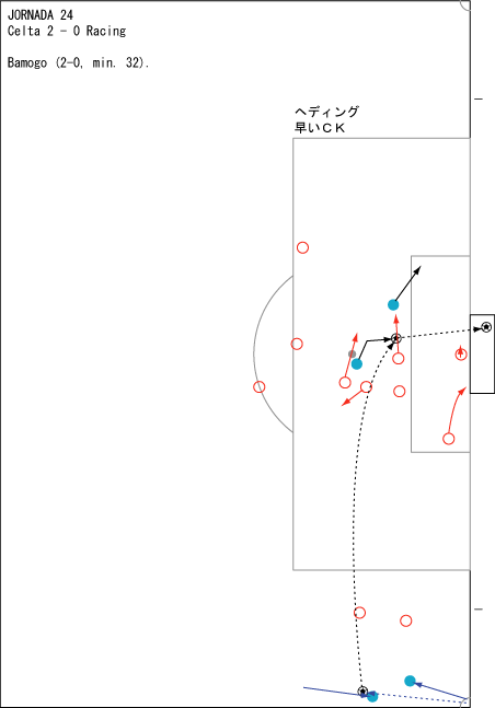 「今日のテーマはショートコーナーやな」 「ショートコーナーというのは次のようなものを指す」 「普通の直接ペナルティーエリアに入れる赤い線よりも手前に短く出すからショートと呼ばれるわけやな」 「そうやな」 「例えば、実際にはこんな感じかね」 「なんか線がごちゃごちゃしておるな」 「いきなりこれを見てもなんのことやらわからんな」 「見方がわからんとどうにもならんしな」 「基本的に、青い丸が攻撃、赤い丸が守備をあらわしている」 「中央に黒い五角形が見えるのはボールやな」 「とりあえず、図を見やすくするために守備を削るとこうなる」 「ほうほう」 「少しは見やすいやろ」 「点線がボールの動き、実線が選手の動きをあわらしているわけか」 「ちなみに、ボールの動きだけを取り出すとこうなる」 「ペナルティーエリアの手前に出された後、ファーポストの前にセンタリングが上がって、それをさらに折り返してゴールが決まっている」 「ちなみにあれやな」 「なんや」 「少し見にくいけど、一番下の点線が青くなっているのは下のような意味がある」 「ボールの青い点線と、選手の青い実線はシンクロしていて、ボールがその軌道を動く間に、選手がその道筋を動いたことを示している」 「この場合、ショートコーナーを受けた選手がボールを受けてから、センタリングを蹴る瞬間の選手配置が記入されているわけやな」 「ここから、センタリングが上がった後の動きは次のようになる」 「ボールが上のように動く間に、選手が矢印のように移動する」 「そして、センタリングに味方選手が触れた瞬間の配置が薄い水色の丸印であらわされている」 「濃い水色と薄い水色の丸は、それぞれ同じ時間の選手配置を示すわけやな」 「いわゆるスナップショットというやつやな」 「上の図の後の動きは下のようにあらわされる」 「上側の薄い水色の選手が下にパスを送り、下側の薄い水色の選手がゴール前に飛び込んで決める形か」 「ついでにいうと、ペナルティーエリアの上の”ヘディング”という文字は最後の選手がどのようにゴールを決めたかをあらわしている」 「そうか」 「そしてこれらを全部重ねると次のようになる」 「ショートに蹴られたボールに対して、中央の選手が一度ファーに下がってからファーポスト前に出て折り返し、それをニア側に走り込んだ選手がヘディングで決める、という話やな」 「そして、上の図の濃い水色の時の守備選手の配置が下の図になる」 「敵味方を重ねると」 「次のようになる」 「これを見ると、ショートコーナーが蹴られた後、ディフェンスのマークが甘くなっていることがよくわかるな」 「そうやな」 「図の見方は以上かね」 「実はあと1つ注意点がある」 「なんや」 「これからの話では、上側、つまり、攻撃側から見て左サイドから蹴られたコーナーは反転させて、右サイドから蹴られたものとして扱う」 「どういうことや」 「例えば下のようなキックがあるとするやろ」 「ほうほう」 「これを次のように反転させるんや」 「ピッチの縦の中心軸に対称にひっくりかえすわけか」 「こうしておけば、左から蹴られたものも右から蹴られたものも同じように扱えるので便利であるし、反転によって何かを見失う危険は小さいだろうという話だ」 「ほほう」 「ショートコーナーのデータは全部で6つあり、下のようになる」 「押すと拡大する仕掛けであるな」 「この中からパターンなり、なにか役立つ情報なりを見つけ出すわけだが」 「時間のある方は、6つを見比べた後に以下を読まれると面白いと思われますので」 「ぜひお試しを」 「時間のない方は即刻下を読まれても面白いと思われますので」 「こちらもぜひお試しを」 「というわけで」 「分析に入るか」 「よかろう」 「ここでは3つのパターンに分けてみようと思う」 「どの3つや」 「まずはこのパターン」 「ショートから横、ゴールエリアとPKスポットの間に入れて、直接シュートを狙う筋か」 「これには次の2つが該当する」 「このパターンは理屈に合ってはいるな」 「それはそうやな」 「上の図で最終的に狙われる、ゴールエリアとPKスポットの間というのは、コーナーキック全般においてよく狙われる場所で、一番得点につながりやすい場所でもある」 「つまり、この場合は、一度ショートに蹴って相手の虚を突き、その上で最も点になりやすい場所を狙っていることになる」 「最初のショートを奇襲とすると、次のセンタリングは正攻法で、いわば奇の正と呼べるような攻めになっている」 「それはなんとなくかっこええな」 「かっこいいか?」 「まあなんにしても、次のパターンはこうなる」 「該当するのは次の2つやな」 「これは、パターン1よりも大きく戻してファーポストの前、そこからニアポストの前に折り返してゴールを決めるパターンになる」 「これもまた理にかなってはいる」 「そうやな」 「まず、大きく戻すことでディフェンスの注意を