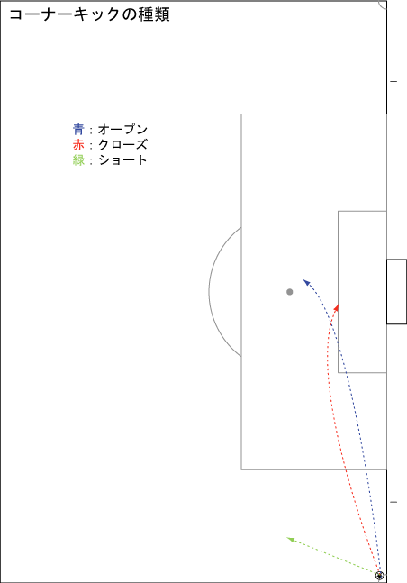 「さて」 「どうした」 「最近おもうんやけどな」 「なにをや」 「サッカーの中で、コーナーキックというのは寂しい立場にある気がしてならんのや」 「それまた奇妙な思いつきやな」 「例えば試合を録画したとするやろ」 「ふむ」 「すると、再生する時にプレーが止まっているところを早送りしたりするやろ」 「選手が怪我した時とかは特にそうやな」 「コーナーキックも、ボールが外に出てから蹴られるまでわりと時間がかかるからよう早送りされるわけや」 「確かにそうやな」 「そこで、早送りをし過ぎることがよくある」 「そりゃ、あるわな」 「しかし、止めそこなってコーナーキックが蹴られたとしても、ゴールが入らない限り巻き戻さない人が多い」 「多いのか?」 「非常に多い」 「誰が調べたんや、そんなこと」 「これに加えて、流れの中から決まるゴールには興味を引かれるが、コーナーキックからのゴールに関心の薄い人も非常に多い」 「まあ、今週のベストゴールにコーナーキックが選ばれることはまずないしな」 「さらには、試合場で見ている時も、コーナーキックの合間にビールを取ろうとして見逃したり、焼きそばを食べるのに夢中で見逃したりする人が非常に多い」 「だからそれを誰が調べたのかと」 「そんな寂しい立場に置かれたコーナーキックに対してなんとか興味を持てないものか、というのがこの企画のそこにあるわけだ」 「それにしても、なんでそんなにコーナーキックに愛を感じているのかがよくわからんのやけどな」 「そりゃ愛は理屈で理解できたらあかんものと相場が決まっている」 「深いような深くないような」 「まあ、要するに、コーナーキックの時、そのチームが何を狙って、そのために何をしようとしているのかがわかれば、試合を見る楽しみが1つ増えて、また1つサッカーが楽しくなるんちゃうか、ということやねんけどな」 「最初からそういうたらええねん」 「それに、コーナーの構造を理解すれば、色々とお得なんやで」 「お得かね」 「まず、見る人は試合が楽しくなるやろ」 「それはさっき聞いたな」 「次に、プレーする人はコーナーでどう動けば点になるかわかるわけやから、迷わずにすむやろ」 「まあそうかね」 「おまけに、相手コーナーに対してどこを押さえればいいかわかるから失点を防ぐことができる」 「それはかなり重要やな」 「さらにいえば、いきなりコーチをすることになっても、自信をもって教えることができる」 「いきなりコーチをするとはどういう状況かと」 「まあ、仮に今コーチをしているとしても、コーナーキックの研究というのはわりと抜けがちなところやから、役に立つと思うわけや」 「それはまた色々と盛りだくさんやな」 「盛りだくさんかつお得なわけや」 「お得感にもなにかこだわりがあるのか」 「そういうわけではないけどな」 「さよか」 「まあ、前振りはこのぐらいにしてそるそろ始めてもええか?」 「別にかまへんで」 「まずは、用語の定義からいこか」 「えらく真面目な方面から入るんやな」 「まずは、コーナーキックの軌道に関して、オープン、クローズ、ショートという単語がある」 「この感じか」 「オープンとはゴールから遠ざかる軌道で蹴られるもの」 「クローズはゴールに近づく軌道で蹴られるもの」 「ショートは短く蹴られるもの」 「大きく以上の3つがある」 「右サイドのコーナーキックからオープンに蹴られる場合、右足を使うことが多く、クローズに蹴る場合は左足を使うことが多い」 「多いというか、ほぼ常にそうやな」 「たまに例外があるけどな」 「とにかく、この3種類について知るためには、データを集めるしかない」 「そのデータがどこから出てくるのかというのが問題やな」 「それは、2006-07シーズンのスペインリーグにおける20節から38節までの全ゴールのデータからコーナーキックだけを取り出して議論するわけやな」 「なぜそれを選んだのかね」 「EL MUNDO という新聞社がその時期の全ゴールを動画データとして公開していて便利だから、それをありがたく使わせていただくわけや」 「そのデータは、日本からのアクセスが制限されているのが問題やな」 「確かに」 「それでまず何のデータからいくのかね」 「上で3種類の軌道が出てきたから、その割合からいこか」 「うむ」 「コーナーキックから決まった全ゴールは、文末の表のように48本あり、軌道別の割合は次の図のようになっている」 「オープンが33%、クローズが54%、ショートが13%か」 「ちなみに、これは”蹴られた全体の数での割合”ではなくて、”ゴールにつながったコーナーキックにおける割合”なのでそこは注意していただきたいかと」 「要するに、外れたコーナーについては、どの割合で蹴られたかわからないということやな」 「そういうことや」 「やっぱり、クローズから決まる数が一番多いな」 「そうやな」 「しかし、例えば、クローズに蹴られた回数が200回で決まったのが26