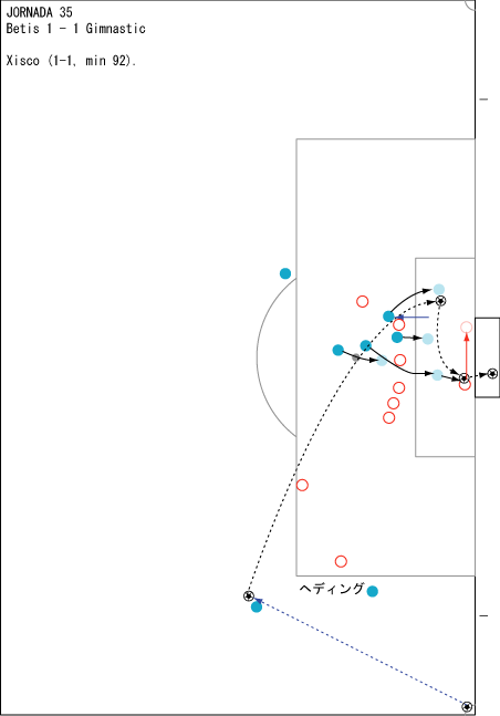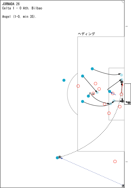 「今日のテーマはショートコーナーやな」 「ショートコーナーというのは次のようなものを指す」 「普通の直接ペナルティーエリアに入れる赤い線よりも手前に短く出すからショートと呼ばれるわけやな」 「そうやな」 「例えば、実際にはこんな感じかね」 「なんか線がごちゃごちゃしておるな」 「いきなりこれを見てもなんのことやらわからんな」 「見方がわからんとどうにもならんしな」 「基本的に、青い丸が攻撃、赤い丸が守備をあらわしている」 「中央に黒い五角形が見えるのはボールやな」 「とりあえず、図を見やすくするために守備を削るとこうなる」 「ほうほう」 「少しは見やすいやろ」 「点線がボールの動き、実線が選手の動きをあわらしているわけか」 「ちなみに、ボールの動きだけを取り出すとこうなる」 「ペナルティーエリアの手前に出された後、ファーポストの前にセンタリングが上がって、それをさらに折り返してゴールが決まっている」 「ちなみにあれやな」 「なんや」 「少し見にくいけど、一番下の点線が青くなっているのは下のような意味がある」 「ボールの青い点線と、選手の青い実線はシンクロしていて、ボールがその軌道を動く間に、選手がその道筋を動いたことを示している」 「この場合、ショートコーナーを受けた選手がボールを受けてから、センタリングを蹴る瞬間の選手配置が記入されているわけやな」 「ここから、センタリングが上がった後の動きは次のようになる」 「ボールが上のように動く間に、選手が矢印のように移動する」 「そして、センタリングに味方選手が触れた瞬間の配置が薄い水色の丸印であらわされている」 「濃い水色と薄い水色の丸は、それぞれ同じ時間の選手配置を示すわけやな」 「いわゆるスナップショットというやつやな」 「上の図の後の動きは下のようにあらわされる」 「上側の薄い水色の選手が下にパスを送り、下側の薄い水色の選手がゴール前に飛び込んで決める形か」 「ついでにいうと、ペナルティーエリアの上の”ヘディング”という文字は最後の選手がどのようにゴールを決めたかをあらわしている」 「そうか」 「そしてこれらを全部重ねると次のようになる」 「ショートに蹴られたボールに対して、中央の選手が一度ファーに下がってからファーポスト前に出て折り返し、それをニア側に走り込んだ選手がヘディングで決める、という話やな」 「そして、上の図の濃い水色の時の守備選手の配置が下の図になる」 「敵味方を重ねると」 「次のようになる」 「これを見ると、ショートコーナーが蹴られた後、ディフェンスのマークが甘くなっていることがよくわかるな」 「そうやな」 「図の見方は以上かね」 「実はあと1つ注意点がある」 「なんや」 「これからの話では、上側、つまり、攻撃側から見て左サイドから蹴られたコーナーは反転させて、右サイドから蹴られたものとして扱う」 「どういうことや」 「例えば下のようなキックがあるとするやろ」 「ほうほう」 「これを次のように反転させるんや」 「ピッチの縦の中心軸に対称にひっくりかえすわけか」 「こうしておけば、左から蹴られたものも右から蹴られたものも同じように扱えるので便利であるし、反転によって何かを見失う危険は小さいだろうという話だ」 「ほほう」 「ショートコーナーのデータは全部で6つあり、下のようになる」 「押すと拡大する仕掛けであるな」 「この中からパターンなり、なにか役立つ情報なりを見つけ出すわけだが」 「時間のある方は、6つを見比べた後に以下を読まれると面白いと思われますので」 「ぜひお試しを」 「時間のない方は即刻下を読まれても面白いと思われますので」 「こちらもぜひお試しを」 「というわけで」 「分析に入るか」 「よかろう」 「ここでは3つのパターンに分けてみようと思う」 「どの3つや」 「まずはこのパターン」 「ショートから横、ゴールエリアとPKスポットの間に入れて、直接シュートを狙う筋か」 「これには次の2つが該当する」 「このパターンは理屈に合ってはいるな」 「それはそうやな」 「上の図で最終的に狙われる、ゴールエリアとPKスポットの間というのは、コーナーキック全般においてよく狙われる場所で、一番得点につながりやすい場所でもある」 「つまり、この場合は、一度ショートに蹴って相手の虚を突き、その上で最も点になりやすい場所を狙っていることになる」 「最初のショートを奇襲とすると、次のセンタリングは正攻法で、いわば奇の正と呼べるような攻めになっている」 「それはなんとなくかっこええな」 「かっこいいか?」 「まあなんにしても、次のパターンはこうなる」 「該当するのは次の2つやな」 「これは、パターン1よりも大きく戻してファーポストの前、そこからニアポストの前に折り返してゴールを決めるパターンになる」 「これもまた理にかなってはいる」 「そうやな」 「まず、大きく戻すことでディフェンスの注意を