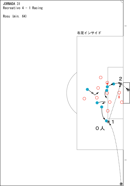 「なんだ」 「前回、オープンなコーナーキックでは、1回で決めるなら前に2人、2回以上で決めるなら前に0人を入れるといいという結論に達した」 「1回で決まり、前に2人が入るパターンはこう」 「2回以上で決まり、前に0人が入るパターンはこうやな」 「そこで、今回はそれを詳しく見ていこうという話であるな」 「うむ」 「まず、1回の場合から始めるとする」 「ええで」 「とりあえず、シュートが打たれた場所を眺めるとこうなる」 「なかなか集まりのいい図やな」 「ゴールエリアとペナルティースポットの間。ピッチの縦の中心軸からややファーサイド寄りとニアサイド寄りに集中している」 「大まかにゾーンを書くとこんな感じやな」 「そのゾーンは、どうやって決めたんや」 「本当は、真面目に計算して求めるといいんだろうけど、余裕で目分量だ」 「目分量か」 「うむ」 「それまた適当やな」 「サッカーは数学ではないから概略がわかれば十分なんや」 「ほんまかいな」 「ほんまや」 「そうか」 「次に、シュートを打つ位置がわかったとしたら、シュートを打つ選手がどこから走って来たのか気になるところやな」 「こうやな」 「横はペナルティースポットとファーポストの間、縦はペナルティースポットとペナルティーエリアの端の間に分布してると思ってええな」 「まあそうかね」 「ついでに言うと、最初位置からシュートを打つまでにどう動いたのかも気になる」 「となるとこれか」 「ファーに逃げたりニアに来たり真っ直ぐ動いたり、顕著な特徴は見られないように見える」 「そうやな」 「これで、シュートを打つ人間に関しては、最初の位置、走る軌道、シュートを打つ位置がわかったことになる」 「そうなると、次は囮の動きやな」 「シュートを打つ選手の前入る2人の動きやな」 「ごちゃごちゃいうのも面倒だから、結論を急ぐとこうなる」 「それはまた急ぎすぎやな」 「これから先ほどと同じようにしてゾーンを求めると、動き出しの位置は次のようになる」 「要するに目分量ということやな」 「結構分布が広い」 「なかなか表現が難しいところやけど、ペナルティースポットから45度に線を引いて、その左右3mに分布していると思えばそう外れへんな」 「ペナルティーエリアの端では大分ずれるけどな」 「それは脳内で補正しせなしゃあないで」 「そして、囮が走り込んだ後の最終的な位置はこうなる」 「これは要するに、シュートが打たれた瞬間にいる位置やな」 「ゴールエリアの縁の左角から中央までの線、その前後3mくらいに分布していいて、特にニアポストの前あたりに多い」 「以上を総合するとこういうことになる」 「なかなか面白いな」 「まずシュートが打たれるエリアが実はかなり限定されている点が興味深い」 「コーナーキックがオープンに蹴られる時は、まずこのゾーンに注目やな」 「そして次に誰がそこに走り込むかを考える」 「赤のゾーンにいて、一番ヘディングの強い奴が犯人になる確率が高い」 「犯人ってなんや」 「つまり、試合観戦中、”このコーナー、一発で決まるとしたら、あの選手があの辺りで決めるよ”とでも言っておけば、当たった時にヒーローになれるということか」 「ヒーローかね」 「それは色々ともてて人生ハッピーになれそうやな」 「自分もかなり妄想力の強い人やな」 「それにしてもだ」 「なんだ」 「赤と緑の重なりが大きいから、ニアに入る選手とシュートに行く選手の見分けは難しそうやな」 「そこが簡単にわからないから、守備は苦労するわけやけどな」 「それはそうやな」 「次に、オープンで2回以上のタッチで入り、エリア内で最初にボールを触る選手の前に誰も走り込まなかった場合を考える」 「うむ」 「これは4個しかないので、最初から1つの図にまとめるとこうなる」 「青い丸が最初にボールを触る選手で、赤い丸がシュートを打つ選手のものやな」 「その通り」 「ところでだ」 「なんだ」 「データは、4つあるはずなのに、シュートを打った印が3つしかないのはどういうことや」 「それは残り1つはオウンゴールだったから外してある」 「そいうことか」 「そうや」 「それにしても、サンプルの少なさは否めないところやな」 「そうではあるが、1回で決まるものと重ねてみると意外といい」 「確かに意外とええな」 「重なっている部分が多いから、同じ配置から両方に変化できそうでええやろ」 「1回で決めるパターンの囮が、2回以上で決める場合には最初にボールに触る選手になることができるわけやな」 「そのあたりを利用して一番効率的と思われるコーナーキックを設計したいわけではあるが」 「それはまた次回というところで」 「今回はこれにて」 「また来週」 「ごきげんよう」