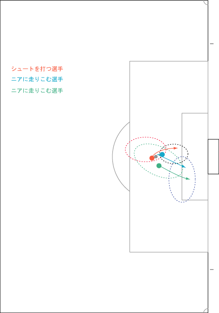 「前回でオープンのデータ整理が終了した」 「今回は遂に待望の設計編が始まる」 「待望かね」 「まず、データ的に多かったものからデザインすることにする」 「コーナーキックのあと最初のボールタッチゴールが決まるやつやな」 「ワンタッチで決まって、さらにシュートを打つ選手の前に2人走り込むパターンについて考えようと思う」 「よかろう」 「まず最初に、シュートを打つのが1人、前に走りこむのが2人で、合計3人の動きを決めるのがよかろうと思われる」 「どこから動きはじめるかが問題やな」 「どうするかね」 「例えば縦一列に並ぶパターンならこういうのがある」 「ふむ」 「ゾーンの意味としてはこちらの絵を参照していただきたいかと」 「前回の結論やな」 「それはともかく、上の図では、赤がシュートを打つ選手で、水色と緑はおとりになる」 「シュートを打つ選手の前に確かに2人やな」 「前の2人もボールが飛ぶ軌道の下に入る。こうすると高さを変えるだけでシュートを打つ場所を変えられるし、キッカーのミスで高さが変わった時に対応することもできる」 「というより、ディフェンスの目を引き付けるためにはそうせざるをえない」 「それもあるな」 「ちなみに、データを重視したら、こういう配置も可能やな」 「ふむ」 「シュートを打つ選手が最初にいるのが赤いゾーンなわけだから、そのど真ん中にシュートを打つ選手を置く。同じ理由で緑のゾーンのど真ん中に前に飛び込む選手を置く。そして、その2人の間にもう1人の前に飛び込む選手を置いて終了というわけだ」 「じゃあこんなのはどうだ」 「こりゃどういう狙いだ」 「ピックアップ狙いで、シュートを打つ選手である赤のマークを水色がブロックするのが目的や」 「その後はどうするんや」 「緑と水色がニアに飛び込んで、その裏で赤がシュートを狙う」 「つまりこういうことか」 「そういうことになる」 「ピックアップを使わないならこういう変化もありやな」 「パターンとしては単純になるけど十分ありやな」 「ほなこれで行くか」 「ええんか」 「別にええで」 「じゃあ、メインの3人の動きが決まったところで、次は、他の場所に選手を増やしていきたいところやな」 「ゴールエリアの中はどうや」 「なんの目的や」 「ここに選手を置くと、色々とジョーカー的に動かせて便利なんや」 「ほう」 「例えば、ゴールキーパーの飛び出しを防ぐこともできるし、ニアサイドに動いて最初にボールを触ることもできる。おまけに、ファーに思いっきり引けば一番後ろでボールを叩くことができる」 「ただ、そこに選手を置くか置かないかは各流派でかなり違うやろ」 「それはそうやな」 「置くのと置かないの、どっちがええんやろうな」 「わしは、1人引く選手がいると守りにくいから、置くのに賛成やねんけどな」 「ほんまに守りにくいのかね」 「ほんまやで」 「ほな信用しといたるわ」 「おおきに」 「そしたら、今は赤がシュートを打つことを考えているから、オレンジはそこにキーパーが出てこないようにキーパーの前に入る役割を負わせるか」 「こう動くわけか」 「その次は、赤の後ろに選手を置いてこう動かす」 「前か後ろかどっちに動くつもりや」 「点が欲しいときは赤の前に入ってシュートを狙う。失点を防ぎたい時はさっさと下がってこぼれ球に備える」 「ほう」 「この時、紫が前に飛び込む形はよくて、ちょうど赤と水色がクロスした間に入ることになるのでそこにスペースがある可能性は高い」 「これでエリア内に5人やな」 「コーナーで中に入る人数は、5人が一番多いからこれで一段落やな」 「あとは下の形でエリアの外に1人置いておきたいとこやな」 「抜けた球とリバンウンド対策か」 「オープンに蹴るとボールがファーに抜けることもあるしな」 「まとめると、コーナーキックでオープンに蹴る時の初期配置は、こういうことか」 「ここから下のように動いて、一番の狙いは赤がヘディング、それがずれたら紫がヘディング。バリエーションとしては、同じ球筋から手前に落として緑か水色に合わせる。もしくは遠くに落として紺がボレーシュートも考えられる」 「これがメインラインやな」 「これを基本として、それぞれの選手の動きを変えてもっとバリエーションを増やして行きたいところではあるが」 「それは次回の、”コーナーキックを好きになろう!オープンでバリエーションを増やそう編”で取り扱うというところで」 「今回はこの辺りで」 「また次回」 「ご機嫌よう」