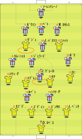 中盤の固い相手に対して、ビジャレアルにとって得意な形ではないにもかかわらず、ロングボールを主体とする攻めに切りかえた。 その理由を述べよ。 解答 一つは、単純に相手の固い部分を避けるためである。 ロングボールで中盤を飛ばすことにより、相手が網を張っている部分を避けることができる。 また、これにより、最も危険であったカウンターを避けることもできる。 前半は、パスをつなごうとするあまり、中盤の危ない位置でボールをうしなった。その場合、ディフェンスのバランスが崩れた状況であるためカウンターからピンチを招いた。 状況が厳しくなる前にロングボールを蹴ることにより、自らのバランスを崩す場面が少なくなる。 実際に、レクレアティーボは、前半のような決定的チャンスを1度もつくることができなかった。 これに加え、ロングボールには、中盤を間延びさせる効果がある。 ロングボール主体のチームに対しては、どんなに訓練を積んだチームでもコンパクトに保てなくなる。 これは、ディフェンスラインが押し下げられ、それにともない中盤のラインも下がらざるを得なくなるためである。 この二つのラインが同じスピードで下がることは不可能であり、徐々に空隙が生じる。 これは、中盤での守備が進歩した現代サッカーにおいてロングボール主体のチームが増えた一つの理由であり、それを受けることのできる大型フォワードがもてはやされる原因でもある。 この空間は、疲労のため、時間が経てば経つほど広がる。 中盤にスペースができれば、それを利用する技術で勝るビジャレアルの方が有利である。 また、途中出場する可能性の高いピレス、カソルラ、ロッシにとってスペースの多い状況はより都合がよい。 ロングボールを増やすことで、ビジャレアルは守備での落ち着きを取り戻し、52分にニハットのフリーキックから先制した。 59分に、トマソンに代えてギジェを入れた。 ギジェは、ビジャレアルのフォワードの中で、最も空中戦に強い。 65分に、レクレアティーボが交代を行った。 アイトールが下がり、ハビ・ゲレーロが入った。 システムは3バックに変更された。 これは、中盤を飛ばしてくる相手には弱い。 この形で攻めるには、サイドを上げなければならず、サイドを上げると、3人のディフェンスの横にスペースが生じる。 ここをロングボールで攻められると3バック側は苦しい。 82分にビジャレアルが追加点を決める。 これは、上図における左のスペースから崩した結果だった。 前問