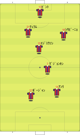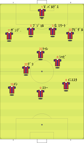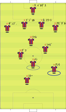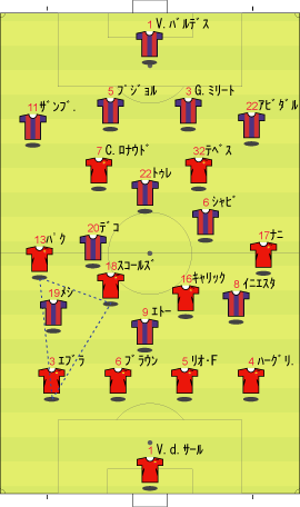 マンチェスターUに先制点を決めれられ、バルセロナは得点が必要になった。 しかし、メシへの警戒が厳しく、突破口を見出せないでいた。 後半における、バルセロナの交代と配置の変更を予想せよ。 ただし、メシは交代させないものとする バルセロナ先発 バルセロナ控え (図において、選手は起用されやすいポジションの周囲に配置されている。) 問2解答 右サイドでの守備が厳しいならば、位置を動かすことが考えられる。 このような場合、左右の選手を入れ換えることがよく行われる。 しかし、左サイドのメシは右よりも明らかにプレーが落ちる。 このため、ポジション変更では中央に配されることが多い。 シーズン中、最も多く行われたのは、下のような変更である。 この試合では、アンリを左サイドに入れ、メシをトップ下のような場所に配した。 中盤をひし形に組んだ1-4-4-2の変形に近い。 問3 バルセロナがメシを中央に配した。 これに対するマンチェスターの変更を予想せよ。 ただし、選手交代は行わないものとする。 マンU先発 問3解答 前問