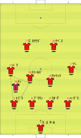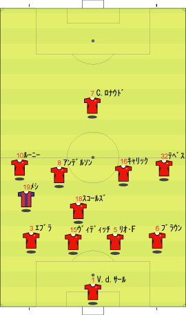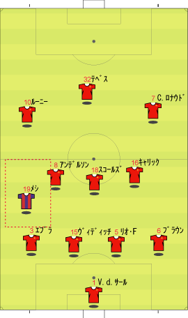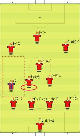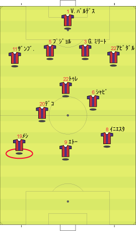 バルセロナの予想先発は、次のようである。 これに対し、新聞社は対戦相手のシステムを1-4-3-3系であると予想した。 エル・ムンド マルカ 新聞社の予想が高確率で間違っている理由を述べよ。 この試合は、ホーム・アンド・アウェーの第二戦であり、第一戦はバルセロナホームで行われ、0-0で終了した。 同点の場合、アウェーゴールを2倍して勝敗を決める。 問1解答 1-4-3-3系のシステムでは、メシへのマークが甘くなるためである。 バルサが1点を取れば、アウェーゴールの関係でマンUは2点を取らなければならない。 もっとも突破力のあるメシをフリーにすることは、失点の可能性を高める。 これを避けるためには、以下のような形でメシ周辺のスペースを狭くする必要がある。 この図と比較して、1-4-3-3系のシステムは、明らかにサイドに大きなスペースを残す。 エル・ムンド マルカ エル・ムンドの図よりも、マルカの方がメシのマークという点ではよい。 しかしながら、1-4-3-3は、中盤左の選手がドリブルでかわされるともろい。 バルセロナ対サラゴサ戦にその例が見られる。 http://shukyu-keikaku.net/partido/0708/05_bar-zar/index.html マルカの図において、サイドのフォワードを下げた1-4-1-4-1は有力である。 メシを止めるのによい。 しかし、守備に偏重した布陣であり、前線でクリスティアーノ・ロナウドが孤立する。 両チームの戦力や、ホームで戦うことを考えれば、あまりにも消極的である。 問2: マンチェスターUに先制点を決めれられ、バルセロナは得点が必要になった。 しかし、メシへのチェックが厳しく、突破口を見出せないでいた。 後半における、バルセロナの交代と配置の変更を予想せよ。 ただし、メシは交代させないものとする バルセロナ先発 バルセロナ控え (図において、選手は起用されやすいポジションの周辺に配置されている。) 問2解答 前問