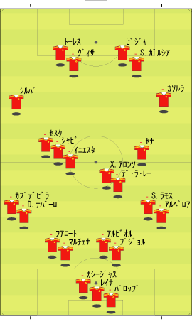 ポジション別に図示すると次のようになる。 特徴は、サイドが薄く、ボランチ系の選手が多いことである。 また、中盤に守備を得意とする選手が少ない。 監督のアラゴネスは、予選においてイニエスタをサイドで起用することが多かった。 彼を左に置くとして、下のような配置が考えられる。 しかし、シルバの右サイドがやや無理である。 セルヒオ・ガルシアが右のバックアップであるとすると、下のようになる。 ここからの動きは以下のようになる。 1-4-4-2で、左の中盤が中に入り、その外をサイドバックがフォローするパターンである。 このようなシステムでは、左からの崩しが鍵になる。 左の中盤にジダン、リケルメなどを配して成功した例がある。 イニエスタ、セスクのパフォーマンスが注目される。 左サイドバックのカプデビラは、クロスに優れる。しかし、1対1でのドリブル勝負は苦手としている。ダビー・ナバーロはなおさらである。 その点、攻撃に不安が残る。 得点を取るための変化は下のようになる。 アラゴネスは、点が欲しくなるとサイドからの突破を重視する傾向がある。 このため、1-4-3-3や1-4-2-4が勝負手となる。 左にシウバかビジャ、右でカソルラ、セルヒオ・ガルシアが予想される。 守備の変化は下のようになる。 中盤の守備は、センターバックのマルチェナとアルビオルを上げて補う。 後半の放り込み対策などで有効である。 また、1-4-1-4-1なども考えられる。 アラゴネスの好みと召集メンバーからして、キックオフからの3バック系は考えにくい。 後半、最後の勝負をかける1-3-4-3か、10人になっても攻める1-3-4-2などの状況でしか使用されないだろう。 システムについては、フランス戦のように、中盤にシウバ、セスク、シャビ、イニエスタと並べる可能性もある。 アルベルダをマルチェナなどに代えてこれが試される可能性もあるが、上手くいかないであろう。 これまで、フェルナンド・トレースは代表において満足な活躍ができなかった。 主な問題点は、体のバランスが悪さから、簡単なシュートで体勢が崩れて外していたこと、及び、相手に引かれた狭いゾーンでボールを受けることができなかったことであった。(参考:スペイン対ウクライナ、トーレスのバランスについて) 体のバランスについては改善が見られ、プレミアにおいて、以前なら外していたキーパーとの一対一を決めている。 この点については、どのようなトレーニングで修整されたのか、非常に興味が持たれる。 狭いゾーンでのプレーについては、体のバランスが改善されたにも関わらず、それほど良くなっていない。 スペースを潰してくる相手に対するプレーが注目される。 |