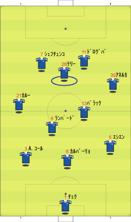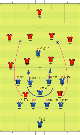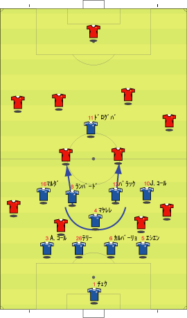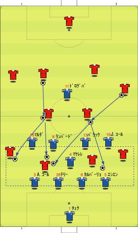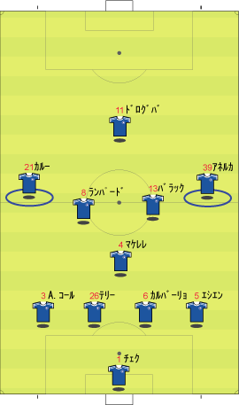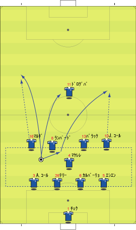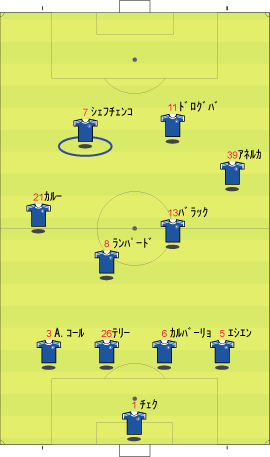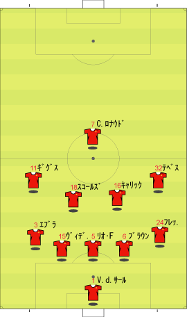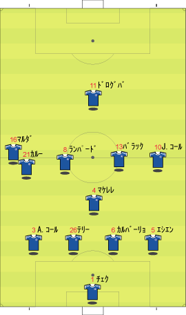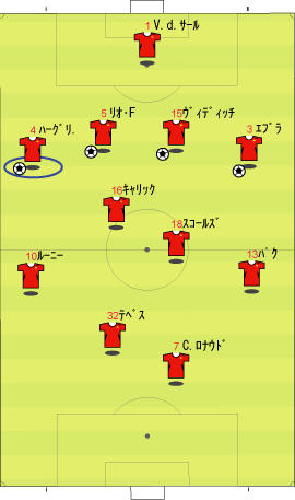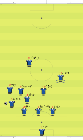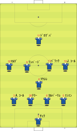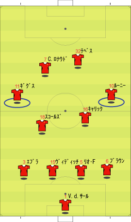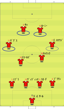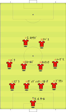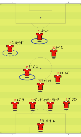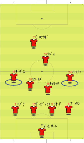 ゲームプラン チェルシーの先発は、非常に高い確率で次のようになる。 左にカルーを置けばカウンターの威力が増し、マルダを置けば守備的に安定する。 チェルシーは、下のように引いて守る。 ボールを奪った後、ドログバへ、もしくは、サイドへのロングボールからカウンターを行う。 この目的のため、押し込まれた側と逆の選手は前に残る。 左サイドを攻められた場合、右のジョー・コールが高い位置を保つ。 チェルシーとしては、マンチェスターが短いパスをつないで攻めてくる方が望ましい。 これは、1-4-1-4-1は、相手ボランチへのプレッシャーをかけやすいシステムであり、1-4-4-2のパス回しを寸断するのに適しているからである。 中盤でボールをひっかけてカウンター。 これがチェルシーのパターンである。 ユナイテッドが、あえてそれに立ち向かうなら、下のような先発が考えられる。 1-4-1-4-1に対抗するためには、プレッシャーのかかりにくいディフェンスラインからの組み立てが鍵になる。 ここのため、サイドはブラウンよりもハーグリーブスの方が良い。 しかし、このように組まれる可能性は低い。 プレッシャーのかかる試合ではミスがでやすいことを考えても、相手の得意な土俵で戦う必要はない。 チェルシーのように、中盤の守備が堅いチームに対しては、そこを飛ばすのが最も簡便な対策である。 ディフェンスや、中盤のラインも無理に上げず、相手にボールを持たせる形にすればよい。 その方が、チェルシーにとっては苦手な形である。 この場合、マンチェスターの先発は以下のようになる。 チェルシーのドログバと比較して、クリスティアーノ・ロナウド、テベスはロングボールを受けるのに適しているとは言い難い。 その不利をおしてでも、中盤を飛ばす方が良い。 前半は、相手の固い部分を避け、スペースの生じる後半に勝負をかけるのが妥当である。 交代:チェルシーが不利な場合 左にマルダを置いた場合、チェルシーの先発は次のようになる。 チェルシー不利の場合、つまり、得点が必要な場合の交代は次のようになる。 さらに時間が進んだ場合、中盤の選手を外してシェフチェンコを入れる。 これに対し、マンチェスターは、サイドの選手を代えて対抗する可能性が高い。 最終的に、テリーを上げたパワープレーも考えられる。 その場合、5バックで対抗するのが妥当である。 交代:マンチェスター・ユナイテッドが不利な場合 先発を次のように仮定する。 ここからマンチェスターが攻める場合、その変化は多岐に渡る。 例えば、サイドを代えるならば、下のような交代が考えられる。 疲れやすいサイドを、攻撃に有効な選手に代えている。 しかし、同じメンバーで、下のような配置も可能である。 相手のチェルシーは、守備において変化の少ないチームである。 ジョー・コールをカルーかマルダに代えた後は、80分過ぎまで交代を遅らせる可能性が高い。 これは、先発の状態で十分に守備を重視していることと、控えに先発以上の力を持つ選手が少ないためである。 その意味において、チェルシーの対応は読みやすい。 しかし、それに対して、上記のどちらが有効か、断言することは難しい。 ユナイテッドの攻撃における変化が多い理由は二つある。 一つは、前線で複数のポジションをこなす選手が多いためである。 もう一つは、ベンチに先発と同等かそれ以上の攻撃的才能を持った選手がいるためである。 このため、可能な組み合わせの数が非常に多い。 例えば、サハを使う場合、次のような形も考えられる。 選択肢が多い、というのは、一般的によいことである。 しかし、あまりにも多すぎる場合、迷いを生じさせる原因となる。 無数の可能性の中から、最適なものを選び出すのは常に難しい。 この試合において、戦術的に最も興味深いのは、マンチェスター・ユナイテッドがリードされた場面での交代と配置の変化である。 |