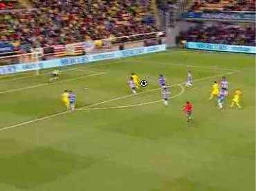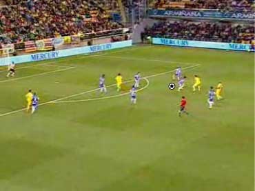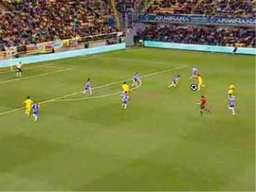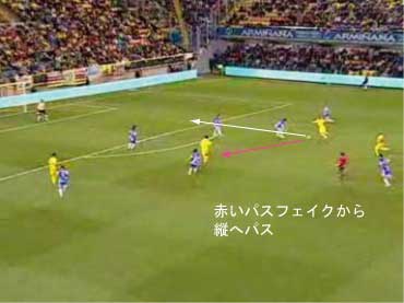 「下の状態からどのようなパスが出たかというと」 「下の形か」 「これも、中への赤いパスを見せてその裏を通している」 「メカニズムは、ペペの時といっしょやな」 「最初にパスをくれた味方にパスを戻すと見せかけて縦へパスを出す。というパターンやな」 「こっちの方が2ラインを越しているだけに難易度が高い」 「難易度は高いといっても、アイディアはまったく一緒である。というところがポイントなわけや」 「ワンツーで、横に出せるなら、そこを囮にして、もう一つか二つ裏を狙え、ということか」 「口でいうとそうなる」 「その辺りのことを、次の文で詳しく見てみたいわけやな」 |