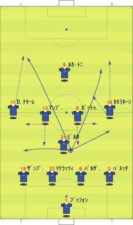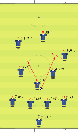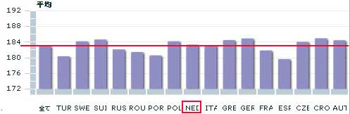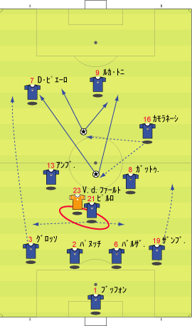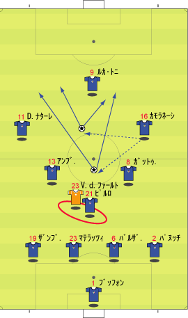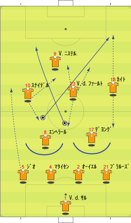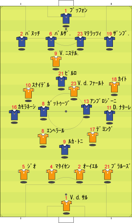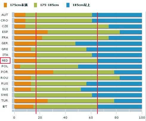 「オランダ対イタリア」 「大方の予想をくつがえす結果になった」 「オランダの3対0」 「大差やな」 「まさに」 「とりあえず先発はこうだった」 「奇策はなしというか」 「両チームともに、メンバー表だけ見ると3トップになりそうではあるが、実際にはサイドを下げるのでそうはならない」 「開始のイタリアは、完全に1-4-1-4-1やしな」 「両サイドを上げると1-4-3-3になるけど、そうはならない」 「オランダの動きは下のようになる」 「スナイデルとファン・デル・ファールトで長くボールを動かし、カイト、ジオを長く走らせる」 「それをエンヘラールとデヨングが支える」 「オランダといえばポゼッションサッカー、つまり、ボールを長く保持することから相手を崩すサッカーで有名やな」 「このチームも基本的にそれを目指している」 「しかし、なによりも、カウンターの切れが凄まじい、というのがこの試合の結論だった」 「2点目、3点目は、絵に描いたようなカウンターから決まった」 「そのビデオは、日本から見られるのかね」 「その点は、お教え願えれば幸いかと」 「次に、イタリアの方に目を移す」 「カウンターを基調にして、ピルロからのパスで崩していこう、ということで間違いない」 「しかし、それは上手くいかなかった」 「先に点を取られたこと、ピルロをファン・デル・ファールトに押さえられたことが痛かった」 「自分から攻めなければいけない状況になったし、ファン・デル・ファールトはピルロと大のお友達のようにいつも一緒にいた」 「その状態で、どのような攻めがもっとも良かったかといえば、中に入るカモラネーシだった」 「下がって組み立てを助けては、前に出てドリブルから崩しのパスを入れ」 「実にいい働きだった」 「ここで、ガットゥーゾを代えて、誰かにパスをさばかせる、というのはあかんのかね」 「いや、十分にあるというか、それが普通の手やな」 「そして、63分、デル・ピエーロが左に入る」 「後半のイタリアは、球際の激しさを前面に押し出し、中に入るカモラネーシ、左を上がるグロッソなどが良い攻撃を見せた」 「ピルロは、マンマークを外すため、中央を外れ、盛んにサイドに動いていた」 「ただ、その影響もあってか、75分を過ぎて、ファン・デル・ファールトが疲れから動けなくなってフリーになる場面が増えたものの、パスがずれる場面が非常に多かった」 「ファン・デル・ファールトは完全に止まってしまった」 「ピルロにずっとついて、攻撃ではどんどんスペースに走って、あれで一試合は難しいと思うで」 「ところで、イタリアは弱いのかね」 「カウンターが使える状況なら、強いで」 「リードされてピルロを抑えられた時にどうするか、という話か」 「そうやな」 「逆に、オランダは強いのかね」 「カウンターが使えない状態で進み、ファン・デル・ファールトとスナイデルの体力が切れたらその後は難しいはずやな」 「となると、相手は耐久作戦でくるわけか」 「この後あたる、フランスとルーマニアは確実にそうやろな」 「小さいコンビの持久力が鍵ということか」 「その小さいについてやけどな」 「なんや」 「UEFAのデータページにチームの身長についてのってるんや」 「それがどうした」 「それを見るとわりと面白い」 「これか」 「上は、チーム平均身長で、国民平均身長世界一であるはずのオランダは、それほど高くない」 「ほぼ大会平均と同じやな」 「さらに、身長の分布図が興味深い」 「左端のオレンジ色が175cm未満の選手やな」 「いわゆる、小さい選手や」 「オランダより多いのは、スペイン、フランス、ポルトガル、トルコの4カ国か」 「オランダは、国民の身長が高い国のはずなのに、小さい選手の割合が大きい」 「上の4国は、生物学にある、赤道に近づくほど個体が小さくなるの法則と矛盾していないのが面白いな」 「さらに、右の水色の部分も面白い」 「185cm以上、いわゆる大きい選手の割合か」 「これも平均でしかない」 「大きい国のわりに、大きい選手をそれほど使わないということか」 「これはつまり、オランダがポゼンッションサッカー、ボールをつなぐサッカーを標榜しているため、小さくてもテクニックに優れた選手を好む傾向があることを示している」 「とは言えへんやろな」 「まあな」 「国民平均身長が大きい、サッカー選手も大きいはずだ、あまり大きくない、これはオランダがテクニックを重視するからだ、というのはあまりにも短絡的やしな」 「国民の平均とサッカー選手の平均でどの程度の差があるのか、国民の分布と選手の分布に差異はあるのか、それが国によってどう違うのか、監督によって代わるのか、年代ではどうなのか、といったことがわからんとなんとも言えへんしな」 「その辺をきっちりやれば、修論にはなるんちゃうかね」 「題名は、”オランダにおけるサッカーフィロソフィーによる身長選別に対する影響について”とかかね」 「じゅげむじ