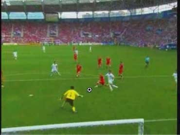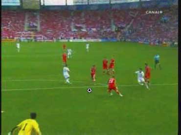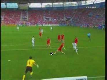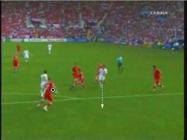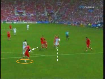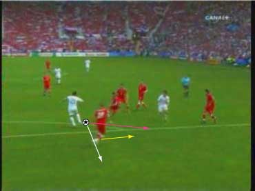 「下の流れから、どのようなパスが出たか、というのが問題であったわけだが」 「正解はこう」 「ピンクのパスをフェイントにして、ディフェンスを右につって、白い方向にパスを出す」 「その結果、キーパーとの1対1が生まれた」 「一対一をいっても、チェクの飛び出しが良く、そのまま点が決まったわけではないけどな」 「それにしても、今回のパスと、トルコ戦のパスは、まったく同じ手筋やな」 「おまけに、パスを出した選手は、同じヌーノ・ゴメス」 「そこが鍵やな」 「どこや」 「上手い選手の上手いプレーといっても、実は状況とそれを打開するアイディアは同じというところや」 「そこか」 「インサイドで出すか、スパイクの横で出すかといった技術の違いはあれ、それの根底にあるものは同じで、見方によっては、同じことを繰り返しているだけのことが多い」 「それを盗めば、我々もビューティフルなプレーができるということか」 「そうありたいところやな」 「見るのも楽しくなるしな」 「それは必ず楽しくなるな」 「見るといえば、パスが出るひとつ前のこのシーンは大切やな」 「なんでや」 「鑑賞のポイントとしては、ヌーノ・ゴメスにボールが入る前のディフェンダーの動き、つまり下の図のオレンジ丸でかこまれた赤い選手の動きが大切やろ」 「彼が、この状態で右につられているから縦に通るわけやな」 「もし彼がヌーノに詰めていたら、右に返すのが正解になる」 「そりゃそうやな」 「そのディフェンスの動きが、次のプレーを決定付けるわけだから、鑑賞側としては、ヌーノがボールに触る前にそれを見ておくと正しくプレーを味わえるわけや」 「さよか」 「ちなみに、スペインのあるマスコミで、”ヌーノ・ゴメスは、パスを半分ミスしたから上手くいった”と言っていた」 「とんでもない話やな」 「右に返そうと思ったボールを蹴り損ねて縦に出たから偶然上手くいった、ということをいいたいのだと思うが、トルコ戦から考えても、足の動きを見ても、明らかに意図的なプレーやで」 「その辺りは、こちらの動画でご確認いただければと」 「要するに、上の発言をした人は、正しくプレーを鑑賞できていない」 「ご不満のご様子やな」 「あんな発言をしては、ヌーノ・ゴメスに失礼というものやで」 「不満といえばだな」 「なんや」 「この試合でもちょっと不満なことがあってだな」 「愚痴か」 「多少そうやな」 「よろしくないな」 「分けて書くか」 「その方がええな」 「では、愚痴編はこちらというところで」 「また次回」 「ご機嫌よう」