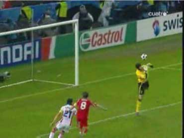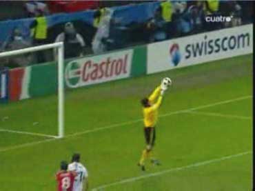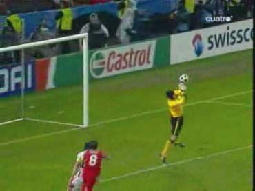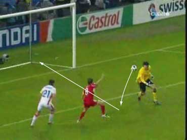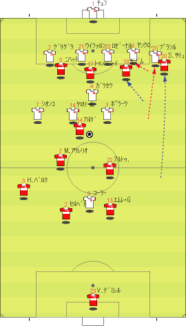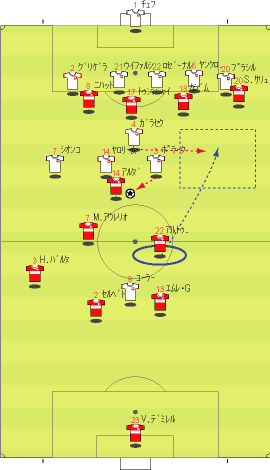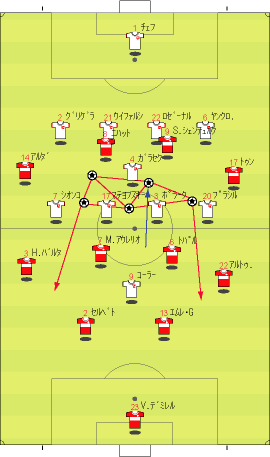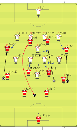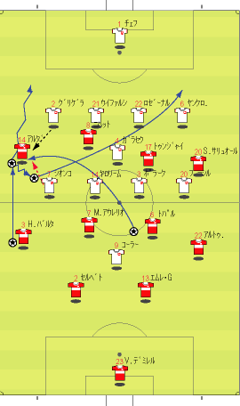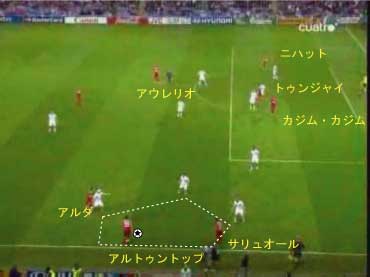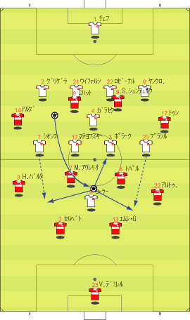 「イスタンブールは狂喜乱舞らしい」 「そりゃそうやろな」 「先発はこう」 「赤い方がトルコで白い方がチェコ」 「前半は、完全にチェコの試合だった」 「トルコは、完全に相手のディフェンスにはまっていた」 「下の形やな」 「1-4-1-4-1で守られると、中盤でのプレッシャーがきつい」 「よって、ボランチでゲームを組み立てるということが非常にやりづらい」 「そうなると、それより下がったところからパスを出すことになる」 「しかし、相手の中盤が多いので、間を通そうと思ってもなかなか隙間がない」 「それならサイドから行きたいところだが、そこも寄せが早いので、なかなか前に進むことができない」 「そうなると、上の図の赤い矢印のようにどうしてもロングボールを蹴らざるをえない」 「この辺は、チャンピオンズの決勝と同じ理屈やな」 「これはトルコにとって良くない」 「トルコのフォワードと、チェコのセンターバックの高さの差は明らかで、まったく勝ち目はない」 「実際に勝てなかった」 「こういう展開が続くと、安全な場所、つまり、バックス間のパス交換が多くなる」 「とりあえずボールはキープできるからな」 「そこで、チェコは下の形で意図的に長いボールを蹴らせに行った」 「図の場合、左にいるシオンコが鍵やな」 「トルコの左センターバックのセルベトに右から遅いパスが入るタイミングを狙って、ハカン・バルタへのパスを切るように寄せていく」 「そうなると、セルベトは前に蹴らざるをえなくなる」 「赤い矢印のパスを狙ってシオンコが動くと」 「そういうわけや」 「チェコは、非常に上手くトルコを封じ込めた」 「そして、攻めるときは下の形」 「長いボールをコーラーに合わせてフォロー」 「とにかくこればっかりやな」 「今回のチェコの弱点は、カウンターができないことで、その原因は取ったボールを中盤でつなげないことにある」 「ボールを取ってさあ行こうか、という時に中盤でプレッシャーに負けてミスが出るから前にパスが出てこない」 「おまけにクロスカウンターをもらう」 「だから、コーラーの頭頼みになってしまう」 「先制点もコーラーの頭やしな」 「それは、こちらでご覧いただければと」 「ビデオではなく、ぱらぱら漫画に近いものですので、日本からのアクセスも問題ないかと」 「前半、トルコはほとんど手も足もでない状態でハーフタイムに突入する」 「後半開始から、トルコは選手を代える」 「セミフ・シュンテュルクが下がり、サブリ・サリュオールが入る」 「後半は、トルコの攻撃が明らかによくなった」 「まず、最初の要因は、左サイドのアルダにボールを集めたことだった」 「ボールを奪った後、なるべく早い段階で彼にボールをあずけ、チェコの体制が整う前にドリブルでしかけることが突破口になった」 「チェコの守備が崩れていない時でも、グリゲラを背負った状態の彼にボールを入れ、そこでデイフェンスを引きつけてからの展開を狙っていた」 「これは、一点突破型の状況打開法やな」 「アルダのキープ力とドリブル能力が鍵で、それがグリゲラに負けると一切攻撃が機能しなくなる」 「アルダが難しい役割をこなしたことで、トルコにチャンスが訪れるようになった」 「下がってくるシオンコが、彼のドリブルに弱いことも幸いした」 「それはあるな」 「そして、57分にトパルが下がり、カジム・カジムが入る」 「トルコは全体的に変な形やな」 「攻撃で、左右のバランスをわざと崩して攻めるから、守備でも変な形になるんやな」 「攻撃でなにを狙っていたかというと」 「下のようになる」 「カジム・カジムが右から中央に入り、ヤンクロフスキを引っ張る」 「その外から、サリュオールがウィングのような位置まで上がる」 「このことにより、プラシルを押し下げる」 「その結果、次のようなスペースがうまれる」 「右サイドにぽっかりと穴が空く」 「アルダを中央に入れてポラークを引き付けると、右に開くアルトゥントップを見る人間がいなくなる」 「こうなるとガラセクが対応しなければいけないのだが、中央もケアする分、どうしても遅れる」 「カジム・カジム登場後のチェコはよくここが空いていた」 「アルトゥントップにやられたのはそれが原因やな」 「その具体例が下の絵に見られる」 「サイドからアルトゥントップがクロスを上げた場面やな」 「確かにフリーになっている」 「そうやな」 「ここで、トルコの配置を見てみる」 「ふむ」 「上で説明したのと、ほぼ同じ形になっている」 「アルダがもっと右に来てるな」 「その時のチェコの配置はこう」 「プラシルとシオンコがいないな」 「この前に、カドレツ、プルチェクと交代している」 「チェコの配置は、トルコの計画通りか」 「正に」 「ここのクロスから、チェフが落球するわけやな」 「なんというか」 「ちょっと信じられんな」 「ハイボールに対するチェフというのは非常にうまいはずやけどな」 「