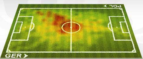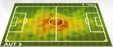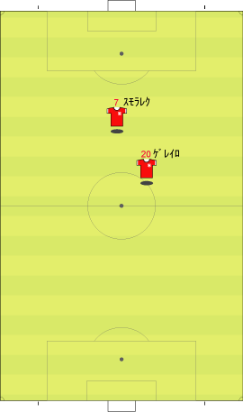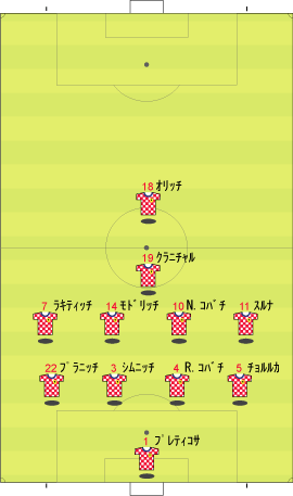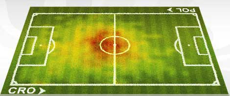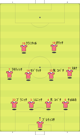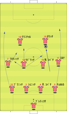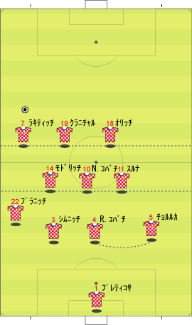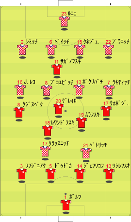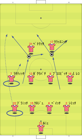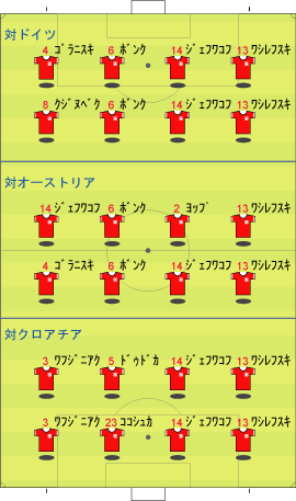 「当然、1位通過」 「この試合では、ドイツ戦から9人も入れ替えて勝利した」 「見事であるな」 「先発はこう」 「クロアチアは、はっきりとした1-4-4-2」 「ポーランドは微妙やな」 「システム原理主義を持ち込むと、1-4-2-3-1か1-4-1-4-1かでもめるやろな」 「ゲレイロとムラフスキのポジションがその間みたいなもんやからな」 「ゲレイロがブコエビッチ、ムラフスキがボクリバチにプレッシャーをかける。押し込まれたら、ムラフスキがレワンドフスキの横に戻る」 「そんな役割やな」 「ポーランドは、結局、グループリーグを突破できなかった」 「いいチームやってんけどな」 「最初の試合では、勝ったドイツよりも目を引くチームやったしな」 「グループリーグ3試合で、一つ面白い現象があった」 「なんや」 「ポーランドのディフェンスラインは、毎試合組み合わせがかわり、それも、全部の試合で先発と最終の組み合わせが違う」 「上が先発で、下が最終か」 「そうやな」 「これは、珍しいかもわからんな」 「おそらく、ドイツ戦の前半、オーストリア戦の後半の組み合わせが最もよかったと思うのだが、オーストリア戦でなぜ先発を組み換えたのか、その理由は非常に興味がある」 「オーストリア戦の前半はびっくりするくらい裏を取られてたしな」 「その辺りは、監督インタビューで聞いてみたいところやな」 「次に、ゲレイロのことがある」 「ポーランドに来たブラジル人やな」 「ドイツ戦では、途中から出場し、主に右サイドに流れて活躍した」 「それは、UEFAページのデータにも出ている」 「この絵はなんだ」 「ゲレイロのプレーゾーンを表していて、茶色が濃いほどその場所によくいたことを表している」 「ポーランドは、右から左に攻めているのか」 「絵の右上に<POLと書いてあるのが攻撃方向を示している」 「つまり、ゲレイロは、ハーフラインより前、中央より右でプレーしていたということか」 「そうなる」 「この試合でよいプレーを見せたことから、次のオーストリア戦で先発する」 「ほぼセンターサークル付近か」 「中央でのプレーが多く、ドイツ戦で見せた右に流れる痕跡はない」 「むしろ、わずかながら左に流れた形跡がある」 「そして、クロアチア戦」 「センターサークル付近、ハーフラインより前が多いな」 「ここでも右に流れた痕跡はない」 「ないな」 「これはどうだったのかと」 「ゲレイロを使うなら使うで、彼の得意なゾーン、つまり右に流して使った方がよかったのではないかということか」 「あのタイプの選手は、特徴を最大限に発揮できる場所で使った方がよい場合が多い」 「ただそうなると、右サイドも含めて、チーム全体の動きを代表に入ったばかりの彼に合わせないといけなくなるので、なかなか難しいのではないかね」 「ポーランドのパスポートを取得したのが20日くらい前らしいからな」 「そんな新しい選手のために全体を組み変えるのはなかなかできんで」 「まあそうやけどな」 「ポーランドの前線で自然にボールをキープできるのは、スモラレクとゲレイロやけど、この2人の使い方が今ひとつ定まらなかった感はある」 「この2人を、相手が疲れる後半まで取っておくような手も有効だったかもしれん」 「次のワールドカップに向けての楽しみではあるな」 「一方、クロアチア」 「この日のクロアチアは、左サイドから主に攻めた」 「特に中央でボールをキープした後、ラインの裏に出るプラニッチからチャンスを作った」 「フォワード2人にボールが入ると、ほぼ間違いなくキープできたのも大きい」 「その辺は、ポーランドセンターバックにも問題がある」 「今後のクロアチアは、まず間違いなく下の形がベースになる」 「ドイツ戦やな」 「守備では、基本的に相手にプレッシャーをかける」 「下の形やな」 「相手サイドバックがボールを持った時の図であるな」 「一部で3-3と呼ばれるプレッシャーのかけかたで、この形からボールを追い込んでいく」 「もし、先制した場合は、相手によって下のように引く」 「1-4-4-1-1か」 「この場合、相手は無理に攻めず、後ろできちんとつなぎながら崩した方がよい」 「クロアチアが攻める場合、下の形が基本になる」 「一つの特徴として、サイドバックが良く上がる」 「中盤では、モドリッチが大きく動いてパスを引き出し、味方に送る」 「相手としては、モドリッチをぜひ止めたい」 「止めるといっても、あれだけ動かれるとなかなかマークしづらい」 「守備だけを考えるなら、1-4-4-1-1か1-4-1-4-1で彼が動いた方のゾーンをどんどん狭くしていくといい」 「あとは、上がってくるサイドの裏をどのように突くか」 「流れて上手いフォワードを動かすか、サイドのスペースに後ろから速い選手を入れるか」 「そういった点が楽しみやな」 「ドイツを倒したクロアチアの今後と、対戦相手の対応が楽しみだというところで」 「また次回」 「ごきげんよう」