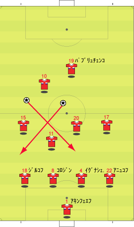 「下の流れで、プレーの間というものに関して、面白い場面があったという話やな」 「サイドから、中央に入る選手の拡大写真は、次のようになる」 「問題は、ここや」 「どこや」 「どういう状態かというと、下のようにあらわされる」 「体の正面が相手に向いて、軸がほぼ真っ直ぐな状態やな」 「これは、次のプレーで、左、つまりゴールライン方向へドリブルをすることもできるし、右、つまり中央へパスを出すこともできる」 「要するに、どっちかに傾いてないから、どっちにでも行けるということやろ」 「こうなると、正面のディフェンダーは、一度止まらざるをえないし、周囲をカバーしているディフェンダーも次にどう動くかを注目せざるをえない」 「その一瞬が間なわけか」 「瞬間的な溜めともいえる」 「そこで、ディフェンスの死角で動いたりして相手の裏を取るわけやな」 「攻撃側としては、この一瞬の間があると、動きを合わせやすい」 「この次の動きが、じゃんけんぽんのぽんになる」 「この場合は、中央にパスを出す」 「一瞬ボールを見てしまうディフェンスは、これへの対応が遅れると」 「そういうことになる」 「それにひっかからないと、バレージのような変態的なディフェンスに近づけるわけやな」 「多分な」 「なんにしても、一番近いディフェンスに正対する、ということがここでも重要なわけやな」 「ドイツワールドカップのまとめでも出てきた通りや」 「最後にちょっと、守備組織の話をしておきたいんやけどな」 「ええで」 「ロシアの中盤というのは、1-3の形になっていて、左中央が凹んでいる」 「そうやな」 「そうなると、綺麗な4人のラインと比較して、下のパスが通りやすい」 「下の1人を他の3人と同じ高さまで上げれば、そのコースは消すことができるしな」 「ここで、サイドから中央に入るパスは、ぜひ止めたい」 「それを入れられると、守備は非常にしんどい」 「そうすると、フォワードを使って遮断する、というのが思い浮かぶ」 「まあ、そうなるやろな」 「ここが問題なわけや」 「なにがや」 「中盤の構成として、一つ通りやすいパスコースが残る、これを意図的に使うことで、相手のプレーをある程度操作できるのではないか、ということや」 「具体的に頼む」 「こうしておけば、相手としては右サイドにパスを出しやすいから、そちらにボールが流れる」 「その可能性はあるな」 「ところが、相手のサイドを比較して、右の選手の方が下手だとしたら、守備側にとって都合のいい状態を作り出すことができる」 「トラップディフェンスの一種か」 「いつか試してみたいとろこではあるな」 「そんなこんなで」 「また次回」 「ご機嫌よう」 付録:ロシアの得点、サイドからのボールを逆サイドに打つ
