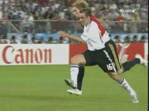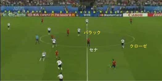 「スペインがなぜ優勝できたのか、という疑問についてやな」 「とりあえず、様々な理由を検証してみたいと思う」 「よかろう」 「まず、”スペインは、上手い、テクニックのある選手を揃えていいサッカーをしたのが良かった”というような説明がある」 「しかし、それはドイツワールドカップでもそうで、例えば、フランス戦の先発は下のようになっていた」 ![]() 「懐かしいな」 「今回の選手としての違いは、パブロ、ペルニア、ラウール、セナで、中盤より前の選手では、ラウールとセナしか違わない」 「そうやな」 「上手い選手を揃えたのが良かったというなら、なぜ前回は駄目で今回は良かったのかを明らかにしないといけない」 「ふむ」 「例えば、ラウールをイニエスタに代えたから優勝できた、というなら、その理由も知りたい」 「まあ、システムが違うというのはある」 「でも、それは理由にならんやろ」 「まあな」 「スペインは、ドイツワールドカップの予選の間、1-4-2-3-1や1-4-4-2系で戦っていて、それで上手くいかずに1-4-3-3系に変えたという経緯がある」 「それに、ユーロ予選でも、1-4-4-2系でうまくいかなかった」 ![]() 「スウェーデン戦や、アイスランド戦がそうやな」 「ドイツの1-4-3-3から今回の1-4-4-2に変えて上手くいったというなら、なぜ予選の段階で上手くいかなかったのか、さらには、それ以前から上手くいかなかったのはなぜかを明らかにしないといけない」 「そうかね」 「そりゃそうやで」 「じゃあ、個々の選手が成長したというのはどうだ」 「トーレスやセスクがイングランドで成長して、イニエスタも円熟して云々という感じか」 「あかんな」 「予選が終わったのが半年前で、そこでは嫌になるほど苦労したし、一時は出場不能じゃないかとまで言われていた。果たして、人間というのは半年でそこまで成長するのか疑問が残る」 「それに、そのような成長が可能だとするなら、どこがどう変わったかを教えてもらわないと納得するのは難しいかもしれんな」 「トーレスのボディバランスが、一年前よりよくなったのは確かやけどな」 「それでもってユーロ優勝の理由にするのはちと無理やろ」 「1人の人間の変化でチームを優勝させてしまうのは難しいかもわからん」 「当たり前や」 「それなら、一戦ごとにチームが成長したというのはどうだ」 「それを言うなら、ドイツもロシアもユーロ開始よりもよくなっているから、スペインのチームとしての成長度が他のチームを超えていたことを示さないと意味がない」 「ユーロやワールドカップのチームが、一戦ごとによくなるのは当たり前やからな」 「まあな」 「そういえば、アラゴネスの時間が残っているのに3枚使い切る、強気かつ早めの交代がよかった、とする説もあるが」 「それも眉唾か妄言やな」 「実は、アラゴネスというのは、早め早めに交代を行う傾向がある」 「例えば、ドイツのチュニジア戦もそうやな」 「56分で3人の交代が終わっている」 「つまり、残り34分は怪我人が出ないのを祈るのみ、ということになる」 「ユーロ予選のスウェーデン戦でも、59分で3人代えている」 「それに、アラゴネスが交代を行うと、どんどん攻撃的な選手が増える」 「強気かつ早めの交代というのは、彼の癖のようなもので、このユーロに限ったことではない」 「まあそうなる」 「要するに、上に出てきた理由は、一瞬もっともらしく聞こえるけど、これまでもアラゴネスのスペインが持っていた特徴を焼きなおしているに過ぎない」 「つまり、もしそれで優勝できたとするなら、なぜこれまでが駄目だったか、という疑問が残るわけやな」 「となると、この大会で今までと変化した点を考えざるをえない」 「そりゃ当然やな」 「まあな」 「というか、最初っから違いを考えろという話やな」 「思い起こせば、最初のロシア戦で奇妙な動きがあった」 「この先発から」 「先制した後、下のように引いた」 「これまでは、1点取ったからといって、自陣に引くようなことをしたことがなかった」 「アラゴネスは、切り合うのが好きやからな」 「切り合うのが好きというか、自分から試合を動かして行くのが好きというか」 「例えば、ドイツワールドカップでは、緒戦のウクライナ戦がこう」 ![]() 「中盤の右にいるセナに注目していただきたい」 「第二戦のチュニジアがこう」 ![]() 「やはりセナがいる」 「第三戦は、控えを中心としたメンバーだったので除外するとして」 「トーナメント緒戦のフランス戦はこう」 ![]() 「セナが消える」 「別に怪我をしたというわけではなく、この試合、途中から出場する」 「驚くべき攻撃精神というかなんというか」 「普通、逆やな」 「より強い相手に守備を重視してセナを入れる、というならわかるが、その逆」 「相手を崩し難いと見るや、より上手い選手をいれて無理にでも崩そうとする」 「これこそがアラゴネスで、自ら主導権を握って試合を動かそうと試みる」 「ドイツ