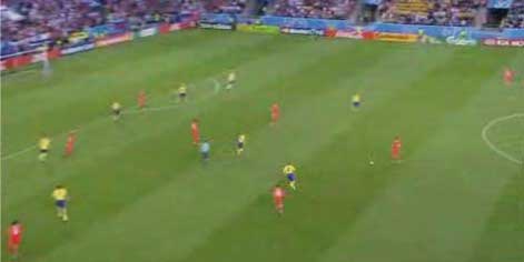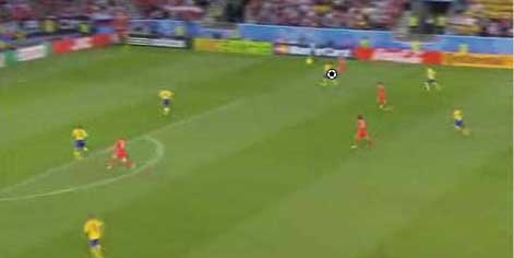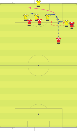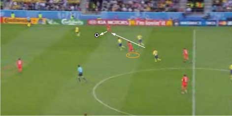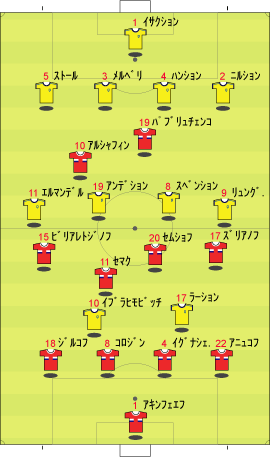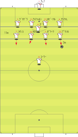「ディフェンスラインから、サイドにボールが入る」 「それをコントロールミス、ディフェンスが前に出てクリアを狙う」 「ディフェンスは、ボールに触るものの、それがちょうどロシア選手の目の前にこぼれる」 「そこで、中央の選手がサイドのスペースへ猛ダッシュ」 「ダイレクトで縦へ」 「これに対し、サイドにいた選手がクロスするように中央へ」 「そこへパスが出る」 「中央へ進路を取り」 「前方へ進むフェイントから横パス」 「フォワードが逆サイドに決める」 「正に下の形になる」 「これはあれやな」 「なんや」 「セビージャ時代のフアンデ・ラモスもこれに似た形を狙ってたな」 「サイドをへスース・ナバス、その内側に走りこむのがアウベスだとしたら、そっくりではある」 「ただし、セビージャは、一つ後ろを狙うというようなまだるっこしいことはせず、思いっきり上の図の赤いコースにクロスを蹴る」 「中で、カヌーテ、ルイス・ファビアーノ、外からプエルタといった選手が飛び込んで押し込む」 「いまとなっては懐かしい」 「それはさて置き、例えば、下の図でも同じようなパスが見られる」 「サイドでボールを持って」 「中に返す」 「上で述べた場所に選手が入ってきているのがわかる」 「ロシアとしては、前に選手をかけて、単純にクロスを上げていたわけではなく、サイドと中央のディフェンスの間にできる空間に人を入れ、それをワンクッションにすることで相手を崩そうとしていた」 「まあ、そういうことになる」 「ちなみにや」 「なんや」 「前の得点シーンで、プレーの間とか溜めと呼ばれることに関して、実に興味深い場面があったんや」 「そうなんか」 「続きはこちらまで」