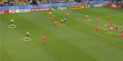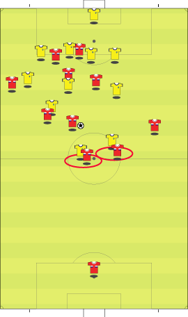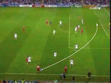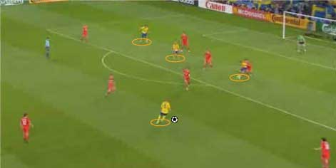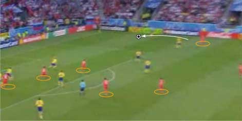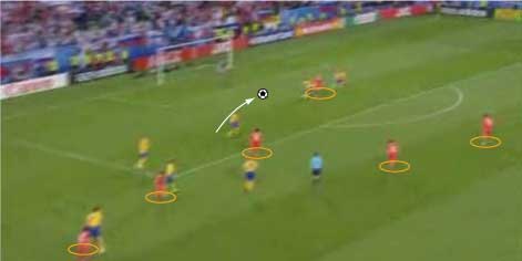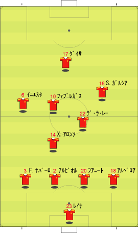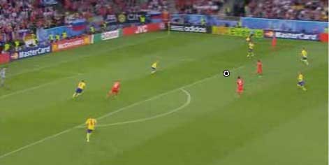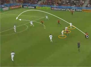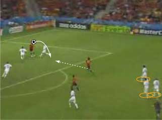 「ロシア対スウェーデンの対決はロシアが勝利」 「グループリーグ勝ち抜けを決めた」 「その先発はこう」 「その前にや」 「なんや」 「先にギリシャ戦のスペインの先発を見ておこうかと」 「なんでや」 「一応スペインがメインやからな」 「スペインは、2-1でギリシャに勝利」 「まあ、ギリシャもちょっとやる気がなかった」 「そうかね」 「下の写真を見るとその一端がわかる」 「これは、スペインの2点目やな」 「セスクが浮かせたボールをグィサが落としてデ・ラ・レーが決めた」 「これがどうした」 「ギリシャの輪で囲まれた3人の動きが酷い」 「裏を取られているのに追う気ゼロやな」 「これは、モチベーションが低い時や疲れた時の典型的な症状で、とりあえずボールには行くが、次のプレーに反応しない」 「耳が痛いな」 「スペインとしては、控えを使えてよかった面はあるが、本チームの方が固まっているとはいえないだけに、善悪は微妙なところがある」 「イタリア戦が非常に興味深いと」 「そういうことになる」 「そんなところで、ロシアとスウェーデンにいこか」 「ええで」 「とにかく見所満載で、先発はこう」 「前半は、ロシアが攻めた」 「この試合の記事を読むと、”攻撃的なロシア”とか”勇敢に前にでるロシア”といった文字が必ず入っているはずやな」 「その一端は、下の写真に垣間見られる」 「赤いユニフォームがロシア」 「ボールの前から横にかけて、8人の選手がいる」 「平面図に書き写すと、下のようになる」 「写真で、ロシアの選手は8人、スウェーデンの選手はキーパーも含めて9人だから、最終ラインは2対2になっている」 「これは、確かに攻撃的だといえる」 「後ろを薄くして、前に人数をさいている、といことやな」 「これは、ロシアとスウェーデンをクロスが上がる場面で比較してもわかる」 「1番上と2番目がロシア、3と4がスウェーデンか」 「輪で囲まれた選手が攻撃側で、明らかに人数が違う」 「スウェーデンは、ボールの後ろに5人は残すやりかたで、ロシアは、4人かそれ以下でもいい、というやりかたやな」 「確かにロシアは前に出ている」 「疑いなく」 「そうなると、前に出る、つまり、攻撃的に戦って、何を狙っていた、という点が気になる」 「気になるんか?」 「集団で何かをするには、ある狙いがないと協調して動けない、だから、ロシアの狙いは気になるとこなんや」 「そういうことにしとくか」 「一言でいうと下のようになる」 「これはなんだ」 「サイドでボールを保持したら、センターとその間にある赤い空間に後ろから入る選手を使い、そこからキーパーとディフェンスラインの間を狙うと見せかけて、その一つ後ろを狙う」 「具体的には、下のようになる」 「まず、サイドにボールが出てそれを中央に返す」 「それをダイレクトでサイドにひらく」 「この時、オレンジで囲まれた選手の動きに注目やな」 「サイドでキープ」 「この時、オレンジの選手はもうペナルティーエリアにかかっている」 「ボールと同じスピードくらいで前に動いてるな」 「いかに頑張って走ったかがわかる」 「そして、バックパス」 「この時、オレンジの選手は、サイドでボールをキープしていた選手と、中央にいるディフェンスの間に入っている」 「これは、あまり一般的ではなく、普通は、より中央、横からのクロスをダイレクトで叩くことのできる位置に入る」 「あまり一般的でないことを全力でやったということは、そこになにか意図があるということか」 「バックパスを受けた選手は、前へドリブル」 「再びサイドにパスが出る」 「キーパーとラインの間に入れると見せて、横にパス」 「惜しくも合わず、シュートはゴールをそれる」 「以上の流れから、チームとして下の形を狙っている片鱗は見える」 「走りこんだ選手にパスが出ず、バックパスにかわっている点が違うけどな」 「それはあるが、次のシーンでは、もっと純粋な形が見られる」 「続きはこちら」 「なんで分けるんや」 「ちょっと話が長くなりそうな気配やからな」 「ようわかったな」 「それでは、次のページで」