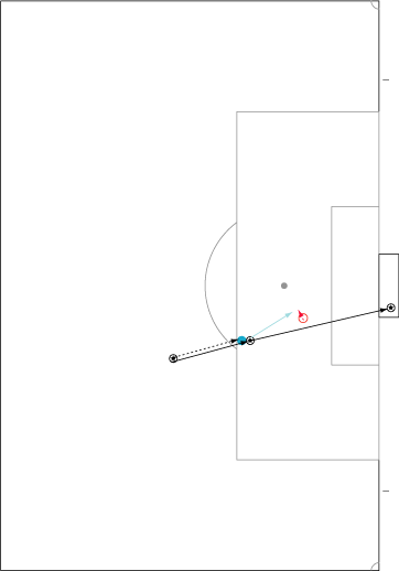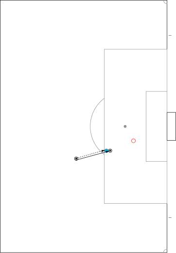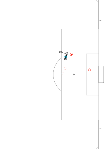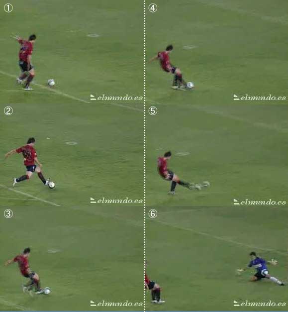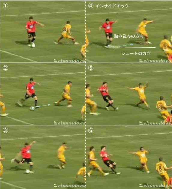 「うむ」 「具体的には次のようになるわけだが」 「簡単に言うとインステップのように踏み込み、インサイドでボールを蹴るわけやな」 「難しく言ってもそうなる」 「まず、写真1、2ではインステップで左側に蹴るように踏み込む」 「写真3で蹴り足のかかとを押し出し、4でインサイドで右に蹴る」 「こうすると写真6のようにキーパーがだまされるわけやな」 「図にまとめると下のようになる」 「この技術は実際にどのような場面で使うかというと、次の絵が典型的やな」 「いわゆる1対1やな」 「この場面で右利きの選手がステップサイドを使うとどうなるか、頭で想像してみて下さい」 「想像は頭ですると決まったもんやけどな」 「答えはこうなります」 「これは上の写真の選手が実際にステップサイドを使った場面やな」 「そうやな」 「ちなみにこの技術は逆のサイドでも使うことができる」 「下のような場面で右利きの選手がステップサイドを使うとどうなるか」 「想像してみて下さい」 「答えはこうなります」 「さっきはファーサイドへのフェイントからニアサイドにうったけど、今度はその逆やな」 「近い方にうつフェイントから遠い方にうっている」 「この場面も実戦から取ったもので、下のようになっていた」 「ステップサイドというのは便利な技術で、これさえ知っておけばゴールキーパーと1対1になった時に困らずにすむ」 「身につけるのも簡単やしな」 「練習は普段のシュート練習の時にやればいいしな」 「その時は、なるべく遅いシュートで決めるように心がけるといい」 「どういうことや」 「最初はキーパーをだますことを第一にした方がいい。遅いシュートで決まるということは、キーパーをちゃんと逆に動かしたということやからな」 「それからシュートスピードを上げていくわけやな」 「うむ」 |