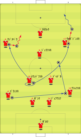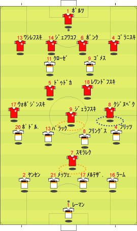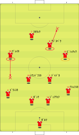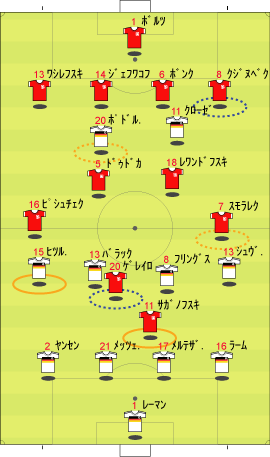 「優勝候補の一つやな」 「その噂に違わず、完封勝利を収めたのではあるがだ」 「なんだ」 「負けたポーランドが実にいいチームだった」 「それは言えるな」 「今回はその辺りを見ていこうかと思うわけや」 「よかろう」 「まず、先発はこう」 「ドイツは1-4-4-2、ポーランドは1-4-2-3-1」 「開始直後は、確かにこの配置だった」 「しかしながら、ポーランドはすぐに下の図に変わる」 「最初は、トップに9番のジェラフスキ、その下に8番のクジヌベク、左に7番のスモラレクだったものが、時計回りに一つづつずれた」 「これは、どいういう意図やったんやろな」 「この後の交代から判断すると、スモラレクではラームをマークしきれないので、クジヌベクを当てようという意図だったと思われる」 「ちなみに、このクジヌベクという選手のポジション移動がこの試合の鍵を握る」 「まさにキーマンだったので、8番、クジヌベクの名前は覚えておかれるとよろしいかと」 「それはさておき、ポーランドの攻撃における構造はこうなっていた」 「下から上に攻めているわけやな」 「まず最初に目を引くのは、ボランチ、18番のレワンドフスキからのサイドへの展開やな」 「あまりにもキックが上手すぎて目が飛び出そうだった」 「そんなおおげさな」 「いや、あれだけの速度と精度で蹴れる選手は今のリーガにはいない」 「1-4-2-3-1や、1-4-3-3のようなシステムは、サイド前方の選手に長い斜めボールが通らないと意味がないから、その点では選手とシステムの相性はええな」 「もう一つの特徴は、左サイドバックから右サイドバックへの矢のようなサイドチェンジで、そこから早く縦に送ることで相手を崩す」 「4番のゴラニスキから13番へのワシレフスキへのボールやな」 「ちなみに、ゴラニスキは右利きや」 「ポーランドの攻撃が上手く行くのは、主にこの二つのパターンからになる」 「ただ、少々残念なこともある」 「第一のパターンで、レワンドフスキのボールを受ける、サイドの両選手やな」 「右が17番のウォボジンスキ、左が上でも出てきた8番のクジヌベク」 「この二人は、長いボールのコントロールに難がある」 「せっかくいいパスが来たのに、トラップが流れる」 「ワンコントロールで詰めてくる相手と正対して、そこから仕掛けていけばなんぼでもええ形が作れるのに、コントロールに手間をかけるもんだから、せっかくパスで得た時間的な余裕を無駄にしてしまう」 「もったいないオバケが出るな」 「さらに、左のグジヌベクはラームとの1対1でまったく勝てない」 「右のウォボジンスキは、どうにかコントロールした後の仕掛けではいい働きを見せていた」 「仕掛けていける選手なだけに、トラップの粗がなんとも惜しい」 「なんにしても、前半は、1-0とドイツのリードで終わる」 「開始後にドイツが攻めて、その後ポーランドが押し返す流れだった」 「そして、後半は、これまた面白い展開だった」 「リードを奪われたポーランドは、後半開始からゲレイロを投入する」 「トップ下やな」 「ゲレイロとはスペインっぽい名前であるな、と思っていたら、ブラジル人らしい」 「スペイン系やとゲレーロやろ」 「この選手が非常にいい味を出していた」 「下の形やな」 「中央から右に流れて、ワシレフスキからのボールを受けると、とにかくグニャグニャと左足でボールをキープする」 「その場で足踏みをするようにドリブルができるのは、ポーランドで彼一人やな」 「そこから、真っ直ぐ縦に突破したり、逆サイドに展開したり、相手を引きつけて周囲にスペースを作ったりする」 「ポーランドに足りなかった要素を一人で追加した感じだった」 「彼の活躍もあり、ポーランドは非常にいい時間を迎えた」 「ところが、65分にピシュチェクを入れてから様相が一変する」 「ゲレイロを左に置き、8番のクジヌベクを左のトップのような場所に置いた」 「これはどうしたことかと」 「クジヌベクは、ゲレイロと比較して狭いスペースでボールを扱える選手じゃないから、ぼろぼろとボールを失くす。おまけに、ゲレイロは後ろに走ると対した選手じゃないからラームに対する左サイドにも穴が空く」 「どう見ても、いいことなしやな」 「実際に、この後の時間はドイツに流れが移って、追加点まで奪われる」 「監督のベーンハッカーの意図が非常に気になる」 「右に流れすぎて、右の中盤と重なっていたから、それを解消しようとしたのかもしれん」 「結局、73分に点を取られた後、75分の交代ではポジションを元にもどしていることからも、非常な謎が残る」 「まあ、単純に失敗だったということちゃうかね」 「相手を一点から崩している時は、それを変えずに、むしろ補強する形の方がいいということやな」 「右で重なるなら、むしろ右の選手を中に入れて、逆サイドでは8番のクジヌベクよりもボールを受けて勝負できる選手、シュートまでいける選手、例えばスモラレクを入れる形とか