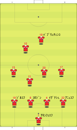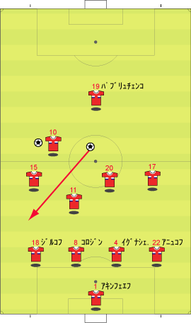 「下の流れで、プレーの間というものに関して、面白い場面があったという話やな」 「サイドから、中央に入る選手の拡大写真は、次のようになる」 「問題は、ここや」 「どこや」 「どういう状態かというと、下のようにあらわされる」 「体の正面が相手に向いて、軸がほぼ真っ直ぐな状態やな」 「これは、次のプレーで、左、つまりゴールライン方向へドリブルをすることもできるし、右、つまり中央へパスを出すこともできる」 「要するに、どっちかに傾いてないから、どっちにでも行けるということやろ」 「こうなると、正面のディフェンダーは、一度止まらざるをえないし、周囲をカバーしているディフェンダーも次にどう動くかを注目せざるをえない」 「その一瞬が間なわけか」 「瞬間的な溜めともいえる」 「そこで、ディフェンスの死角で動いたりして相手の裏を取るわけやな」 「攻撃側としては、この一瞬の間があると、動きを合わせやすい」 「この次の動きが、じゃんけんぽんのぽんになる」 「この場合は、中央にパスを出す」 「一瞬ボールを見てしまうディフェンスは、これへの対応が遅れると」 「そういうことになる」 「それにひっかからないと、バレージのような変態的なディフェンスに近づけるわけやな」 「多分な」 「なんにしても、一番近いディフェンスに正対する、ということがここでも重要なわけやな」 「ドイツワールドカップのまとめでも出てきた通りや」 「最後にちょっと、守備組織の話をしておきたいんやけどな」 「ええで」 「ロシアの中盤というのは、1-3の形になっていて、左中央が凹んでいる」 「そうやな」 「そうなると、綺麗な4人のラインと比較して、下のパスが通りやすい」 「下の1人を他の3人と同じ高さまで上げれば、そのコースは消すことができるしな」 「ここで、サイドから中央に入るパスは、ぜひ止めたい」 「それを入れられると、守備は非常にしんどい」 「そうすると、フォワードを使って遮断する、というのが思い浮かぶ」 「まあ、そうなるやろな」 「ここが問題なわけや」 「なにがや」 「中盤の構成として、一つ通りやすいパスコースが残る、これを意図的に使うことで、相手のプレーをある程度操作できるのではないか、ということや」 「具体的に頼む」 「こうしておけば、相手としては右サイドにパスを出しやすいから、そちらにボールが流れる」 「その可能性はあるな」 「ところが、相手のサイドを比較して、右の選手の方が下手だとしたら、守備側にとって都合のいい状態を作り出すことができる」 「トラップディフェンスの一種か」 「いつか試してみたいとろこではあるな」 「そんなこんなで」 「また次回」 「ご機嫌よう」 付録:ロシアの得点、サイドからのボールを逆サイドに打つ