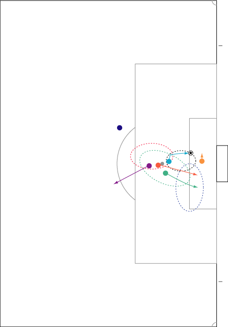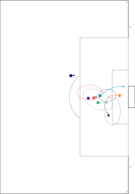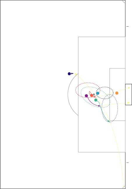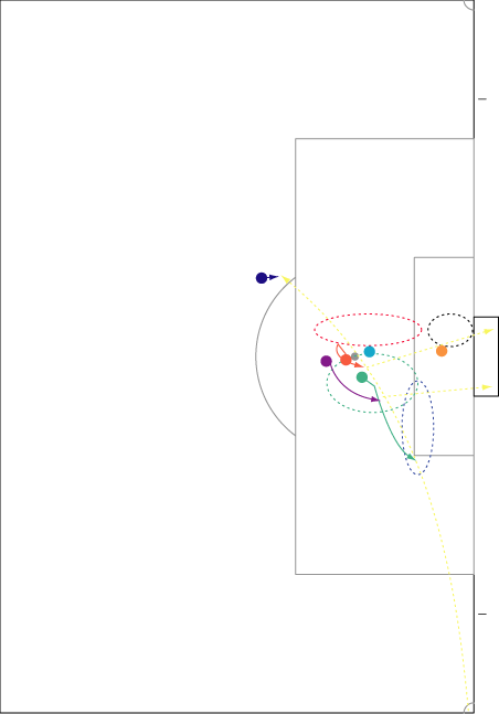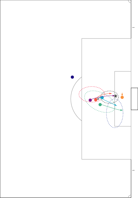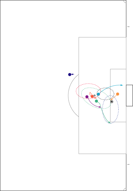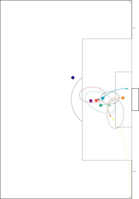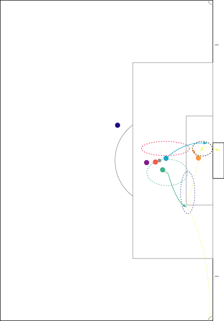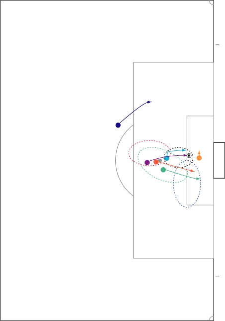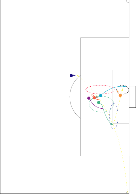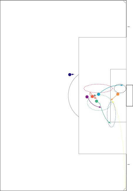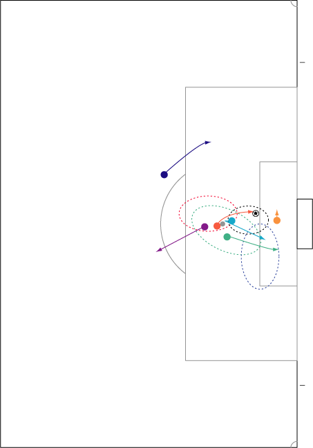 「今回は、ツータッチ以上で決まるものを考えるわけやな」 「そういうことになる」 「組み立て方は前回にならうとして、いきなり結論を描くと下のようになる」 「これまた唐突やな」 「まあそういうな」 「基本は、ゴールエリアの角でそらしてファーで決めるやつやな」 「下のようになる」 「緑がニアに走りこんでヘディング、ファーで水色とオレンジが待ち構えているわけか」 「その裏のプレーとして、直接ヘディングを狙う手もある」 「この感じか」 「緑が頭で合わせると見せて、その頭上を通過させるわけやな」 「それを紫か赤が叩く」 「ここで1つ気になることがある」 「なんや」 「前回オープンから直接ヘディングでめる時に有効なゾーンを考えてたやろ」 「そうやな」 「今考えている裏のプレーは、直接ヘディングで決めるパターンなわけで、そのゾーンとの整合性が気になるところや」 「そうやな」 「どうなるんや」 「こうなる」 「黒い点線がシュートを打つゾーンやから少しずれてるな」 「紫はずいぶんと遠いが、赤は充分に近い」 「強引やな」 「おまけに、赤がヘディングを行えば、その前に二人の囮が入るという意味でも前回の要請を満たしている」 「オープンでワンタッチは前に二人が定石ではある」 「データ的な定石やけどな」 「とにかく、このパターンでは、緑を最初に狙って、その裏で赤、最終目標が紫ということかね」 「そうやな」 「これでめでたしめでたしと」 「後はここから少しバリエーションをつけるといい感じやな」 「この上まだバリエーションかね」 「ここで、今まで眠っていたオレンジを動かすわけや」 「例えばこうか」 「斜め後ろに引いて、緑の横で合わせる手やな」 「さらにこういうのもある」 「ぐるりと回ってニアサイドか」 「これは、シュスターのもと、ラウールがたまにやっている」 「ディフェンスとしてはマークしにくい動きやしな」 「他にも、同じ初期状態から色々なパターンが考えられる」 「ただ増やし過ぎても選手に教えることはできないから、数を絞る必要があるわな」 「有効なプレーから順に優先順位をつけて練習せなあかんからな」 「まず一番最初にこれを練習すべきやな」 「データ的に一番入りやすいパターンやからな」 「次にこれやな」 「人の動かしかたを変えただけか」 「そしてこう」 「後ろから人が入るパターン」 「それにそのバリエーション」 「二番目のパターンとの組み合わせやな」 「直接狙う筋はこの辺にして、ここからはまったく別の場所に合わせる」 「ニアでそらしてファーで決める狙いやな」 「その裏であわせる」 「この場合、紫より赤にあわせる方がデータ的にいい」 「そして奇襲」 「引いて合わせるパターンやな」 「そしてさらに奇襲」 「ぐるっと回ってニアで合わせる」 「まあ、これで8通りある」 「とりあえずそれだけあれば充分やな」 「ビールと枝豆みたいなもんやな」 「なんのこっちゃ」 「この場合、全て初期配置が同じなのがミソやな」 「多少ズレても問題ないけどな」 「みなさまも、以前のデータをもとにして、色々と考えてみられると楽しいのではなかろうかというところで」 「次回は遂にクローズ編というところで」 「今回はこれにて」 「ごきげんよう」