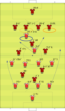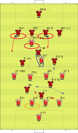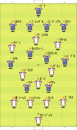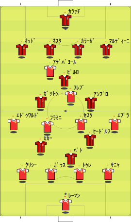 構造 6分にコロ・トゥレが負傷し、センデロスと交代した。 アーセナルは守備を重視した。特にフレブは、常にピレスを意識して動いていた。 この代償として、前線でアデバヨールが孤立した。このため、前半は攻めに力を欠いた。 ミランでは、オッドとカラーゼによくないパスが目立った。ネスタは狙いのいいパスを試みるが、コースを読まれやすい。 前半は、アーセナルが引いて守ったため、ここで自由にパスを回すことができた。 しかし、能力不足によりボールを失う場面が目立った。ここが改善されれば、中盤より前方の力が発揮される。 セードルフは、いわゆる奇兵として動いた。ゾーンの間を変えながら動き、守備を混乱させた。 パトは最前線でプレーした。 ボールキープに強みを見せたが、ラインの裏でボールを受けることができなかった。 後半開始 アーセナルは、フレブの動きを大きく変えた。 ピルロのマークよりも、中盤の裏、ディフェンスラインの前でボールを受けることを重視した。 これにより、アーセナルの攻めは劇的に改善された。 また、50分のネスタの負傷退場も攻撃を後押しした。 マルディーニでは、アデバヨールのスピードについていくことができなかった。 65分まではアーセナルが有利だった。しかし、70分前後からミランが再びペースを握った。 これは、相手の変化に慣れたためである。 85分 ミランが一度ペースを握った後、スペースを空けた攻め合いになった。 ミランは、ベテランが多く、スタミナに問題がある。 アーセナルが、前半を固く戦った主たる目的はそれを突くためである。 ミランは、85分にエメルソンを入れ、中盤の前のスペースを押さえた。 この流れは、昨年のマンチェスター・ユナイテッド戦と酷似している。 終了間際、アデバヨールがゴール前4mでフリーになった。 ウォルコットのクロスを頭で合わせたものの、シュートはバーを叩いた。 アーセナルは、勝てる試合を引き分けた。 |