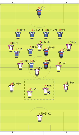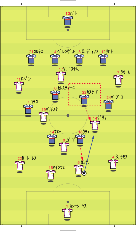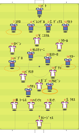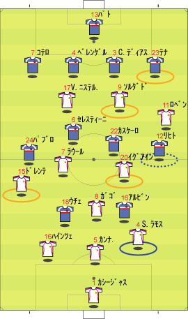 サラゴサの新監督、マノロ・ビジャノバは、1-4-1-4-1を採用した。 中盤の左サイドにセルヒオ・ガルシア、右サイドにガビを配した。 ・選手、ボールの動き 攻撃では、左サイド前方に位置するセルヒオ・ガルシアが中心となる。 ディフェンスラインからパレーデス、中盤からマトゥザレムがパスをさばく。 左から前に運んだボールを主にディエゴ・ミリートとオスカルがシュートにつなげる。 オスカルは、フォワードとボランチの中間にあたるこのポジションでもっとも能力を発揮する。 サイドバックは、右のディオゴが頻繁に上がる。 ・攻撃における平均配置 ボールを持った際、各選手の平均的なポジションをあらわしている。 右のガビの縦に出る力が弱く、このスペースを活用するためにディオゴが上がる。 しかし、この方法ではディオゴに大きな肉体的負担がかかる。 ・控え選手の具合 まんべんなくカバーされている。 セルヒオ・ガルシアが不在の場合、チームの機能が著しく低下する可能性がある。 これまで、左前方のポジションはアイマールの指定席であった。しかし、今シーズンは鳴かず飛ばずの状況であり、多くを期待することはできない。 ・結論 1-4-1-4-1に向いた選手がそろっており、チームとしての矛盾は少ない。 ただし、左サイドをセルヒオ・ガルシアが持ち込んだ後、中央が薄く得点につながらない可能性がある。 これを改善するため、右サイドでディオゴを一つ前に出し、サイドバックにチュス・エレーロなどを入れる可能性がある。