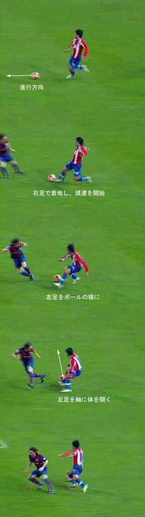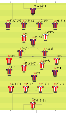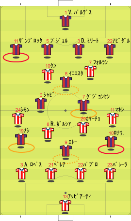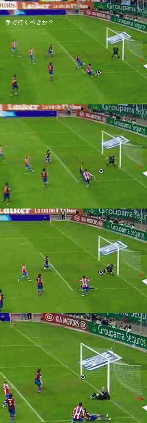 「これで、その差がまた5ポイントに開いたわけやな」 「詰めては離されて忙しいことや」 「なにはともあれ、先発はこうやな」 「なんと」 「ロナウジーニョが先発であるな」 「それも中央の前方で先発やな」 「これは、これまでの実績からしてうまくいかない」 「その理由は、こちらをごらんいただくとして」 「こう組んだバルサは大体、ボールばかり持ってチャンスの少ない展開になる」 「この日もそのまんまやったな」 「保持率は、前半20分の段階において3対7で有利やったからな」 「おまけに、少ないチャンスながら、30分にはロナウジーニョのオーバーヘッドで先制点も奪った」 「にもかかわらず、最終的に4-2で負けるとはこれいかにという話やな」 「確かに、アトレチコの1点目はプジョルのオウンゴールで、アンラッキーではあった」 「ただ、そこにいたるまでにミリートがクン・アグエロに見事にやられている」 「ちなみに、その前の段階で前線にロングボールを送ったのが、キックが下手なことで知られるパブロだというのは見逃せない」 「それにしても、ミリートを抜いたクンの90度方向への切り返しは見事であったな」 「これやな」 「ドリブルをしながら、軸足に対して体を開き、急激に方向を変えるというのは重要な技術であるな」 「重要なのは、軸足が左足だとすると、その前の右足着地の段階から減速を開始することやな」 「一発でストップしようとすると、かならず膝を痛める」 「この技は、その昔ジャウミーニャが上手かった」 「清水にいてデポルではイルレタに頭突きを喰らわせたジャウミーニャか」 「そうや」 「そのイルレタもサラゴサの監督を辞任してえらい騒ぎやで」 「まあそれはそれとして、試合の方は42分にアトレチコがマキシのシュートで逆転する」 「2-1やな」 「負けているバルサとしては後半攻めるしかない」 「ということで、56分にアンリがメシに、62分にエジミウソンがグジョンセンに代わる」 「ほう」 「これはこれは」 「まだこれをやるんかというところではあるな」 「左にロナウジーニョ、右にメシ、右サイドバックにザンブロッタを置いて、ディフェンスラインの前にイニエスタ」 「バルセロナは、去年1年を通してこれが絶対にうまくいかないことを証明したはずやねんけどな」 「それは、こちらからバルセロナに関する項目を読んでいただければおわかりいただけると思うのですが」 「この試合の後半も2-0で沈んだわけやな」 「中盤の穴が大きすぎてどうにもならんわな」 「しかしや」 「なんや」 「ここで、大きな不安が脳裏をよぎらんかね」 「よぎるかね」 「昨シーズンのバルサは、戦術的なミスを繰り返し、確実だと思われていたリーグタイトルまで失った」 「いわゆるひとつの自爆癖というやつやな」 「それをまた今年も繰り返すのではないかというのが大いなる懸念なわけや」 「まあ、ロナウジーニョの中途半端な使い方は気になるわな」 「おまけに、チャンピオンズリーグのセルティック戦で、メシが怪我をしてしまった」 「またもや筋繊維の断裂らしいな」 「残念な話やで」 「瞬発力があって筋繊維の切れやすい選手というのは、筋肉の出すパワーに繊維の強さが耐えられないから何度も怪我をするんやな」 「その昔、アルバセーテやセビージャでプレーしたアランダもそうやったな」 「バルサとしては、メシを中心としたチームを作りたいところだが、こうも頻繁に怪我をしては中心にすえることはできない」 「かといって、いまさらロナウジーニョのために再構築するわけにもいかない」 「そのための手駒はほとんど売ってしまったでな」 「これはこの先どうするのか」 「非常に難しい問題ではある」 「どうなるんやろな」 「新たに選手を買わない限り、解なしやで」 「ライカールとのアイディアに注目というところやな」 「そうやな」 「そんなこんなで」 「今回はこの辺で」 「また次回」 「ごきげんよう」 「の前にや」 「なんやねん」 「下の図はアトレチコの2点目やねんけど、このシュートに対してキーパーのバルデスは手でボールを触りに行っている」 「確かに体を縮めて手で触ろうとしている」 「キーパーの技術としてどうしてもこれがわからんのだが、この距離で体を縮めたり倒したりして止めに行っても無理やろ」 「無理かね」 「手を地面まで下ろす時間よりも、ボールが横を通過する時間の方が短いので、理論的に絶対に止められない」 「そうなんかね」 「この場合、ファーへのシュートは足で弾くように指導すべきなんとちゃうかね」 「でも、弾いたらリバウンドが残るやろ」 「手で止めようとすると、相手に正しく蹴られた場合に必ず入るわけやから、それよりは弾いてディフェンスのクリアに賭けるべきやろ」 「本当に必ず入るならそうやけどな」 「この辺りの具合を、キーパーやキーパーコーチの方にお教えいただければというところで」 「また次回」 「ごきげんよう」