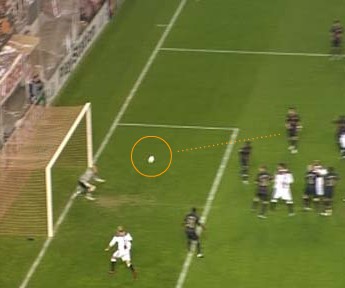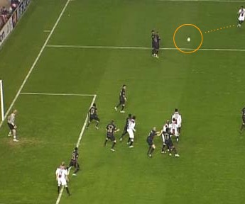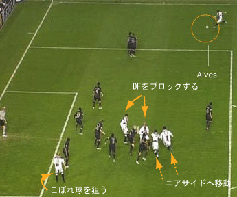 バスケットのピック・アンド・ロールに近い技術が有効に使用されている。 中央手前から2人の選手がニアサイドに走る。 この時、中央奥側にいる2人の選手がニアサイドに走る選手のマーカーをブロックする。 これにより、2枚目の写真で中央上側にフリーの選手が2人できているのがわかる。 左下にいる金髪の選手はファーサイドにこぼれた球を押し込む役割を負っている。 写真ソース http://www.elmundo.es/elmundodeporte/especiales/2007/09/liga_campeones/goles/jornada5/sevilla_arsenal/gol_2_1.html