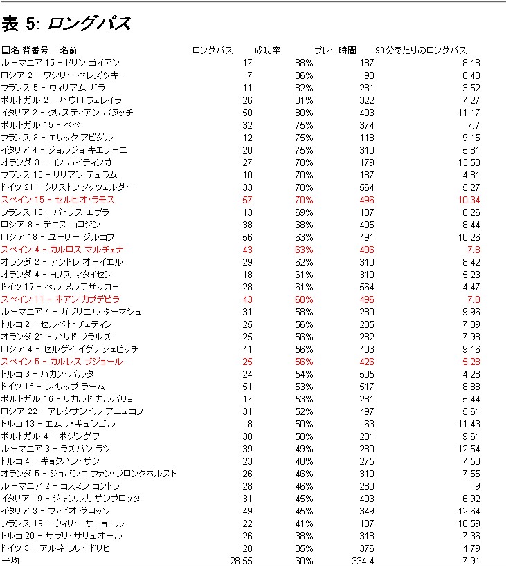 例として、 http://www.ocn.ne.jp/sports/soccer/magazine/0648.html があげられる。 この点について検討したい。 データはすべてUEFAによる。 まず、スペインの4バックのフィードの正確性について及第点とは言い難い、という主張について検討する。 フィードとは、一般的に、ディフェンスラインなどから長い距離を経て供給されるパスをさす。 UEFAのデータベースには、フィードという項目はない。 よって、ここではロングパスの精度について調べることで代用する。 フィードの精度とロングパスの精度の間には十分な相関があると考えられる。 スペインのデータは以下のようになる。 成功率、本数ともにセルヒオ・ラモスがトップである。 以下、マルチェナ、カプデビラ、プジョルと続く。 表中のプジョールは、文中のプジョルにあたる。 トップのセルヒオ・ラモスと最下位のプジョルの間には、 成功率で14%、90分あたりの本数で5本以上の開きがある。 このデータからは、4人をひとくくりにして、”スペインの4バックはフィードの正確性について及第点とは言い難い”との主張するのは無理であることがわかる。 このデータを、他の国と比較する。 ベスト4、すなわち、準決勝に残った国と比較する。 平均成功率は、58%、90分あたりの平均本数は7.39本である。 プジョルを除く、セルヒオ・ラモス、マルチェナ、カプデビラの3名は、平均以上の数値を残している。 ここからスペインの4バックのフィードが及第点以下であることを読み取ることはできない。 特に、セルヒオ・ラモスは成功率において、2位の成績を残している。 及第点以上だといえる。 上の表を、90分あたりのロングパス数で並べかえる。 セルヒオ・ラモスは再び2位である。 成功率、本数ともに十分の成績を残している。 話をセンターバックのみに限る。 ここでも、マルチェナは平均以上であり、プジョルは平均以下である。 以上のデータからいえることは、スペインのディフェンスでロングパスについて、平均以下の数値を残した選手は、プジョルだけであるということである。 ユーロ全体でのロングパス成功率を概観するため、表2に選手を付け加える。 スペインに不利になるように、ロングパス成功率を向上させるであろう国を選ぶ。 イタリア、ルーマニア、ポルトガル、フランス、オランダである。 イタリアは、プレースタイル的にフィードを得意とする選手が多い。 ルーマニアは、歴史的にテクニカルなディフェンスを輩出している。 ポルトガルには、ペペ、カルバーリョという世界を代表する選手がいる。 フランスは、近年質の高いディフェンダーを輩出している。 オランダは、ポゼッションサッカーを指向する国だけに、一般的にディフェンスのパス能力が高い。 以上のような理由から、パス成功率が向上すると期待される。 結果は、文末の表5のようになる。 平均は、成功率60%、90分あたりの本数7.91本となる。 ベスト4の平均は、成功率58%、90分あたりの本数7.39本である。 上記の国を加えたことで、成功率、本数ともに向上している。 スペイン守備陣の平均成功率は、62%、7.81本である。 成功率において、全体平均を上回り、本数において劣る。 このデータからも、”スペインの4バックはフィードにおいて及第点以下である”という結論を導くことはできない。 スペインが及第点以下なら、このユーロにおけるディフェンスのフィードが及第点以下ということになる。 そうであるならば、それを主張すべきであるし、その証拠を提示すべきである。 また、フィードとロングパスの精度に相関がないというのであれば、その理由も重要になる。 スペインの4バックのフィードが及第点以下であるという事実は、データから知ることはできない。 それにも関わらず、そのように主張するのであれば、なんらかの確固たる事実をもって証明すべきである。 引き続き、”スペインの4バックは凡庸である”という点について考察する。 まず、セルヒオ・ラモスについては、上記のロングパスの成功率、本数のデータから、その点について凡庸ではないことが示されている。 また、ルカ・トニとの競り合いに勝利している。 イタリア戦後半だけでいえば、45分25秒のプレー、81分53秒のプレーがそうである。 ルカ・トニと競り合って勝てるサイドバックがどれほどいるのであろうか。 これだけでなく、攻撃においても活躍している。 一例として、準決勝のロシア戦のパスデータはそれを裏付けている。 1対1に関して、セルヒオ・ラモスに及第点がつけられない、という点にも疑問が残る。 良くない形で抜かれたのは、緒戦のロシア戦での対ジルコフ、イタリア戦でのカッサーノの2人である。 もし、これを問題にするならば、ジルコフとカッサーノが1対1において平均的な選手であると証明した後でなければならない。 セルヒオ・ラモスを”凡庸”の一言で片付けるのは、あまりにも問題が多い。 逆サイドのカプデビラについて見た場合、これも凡庸の一言で片