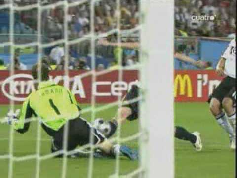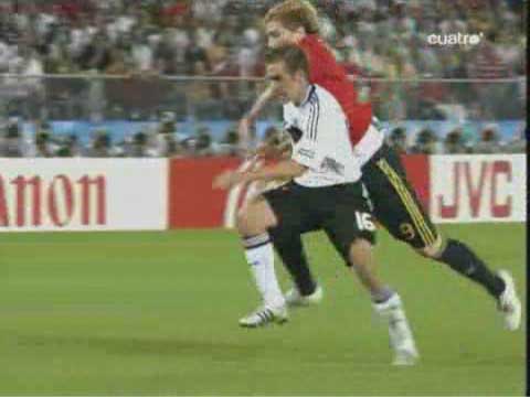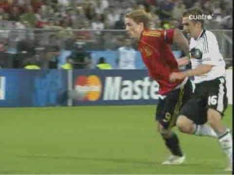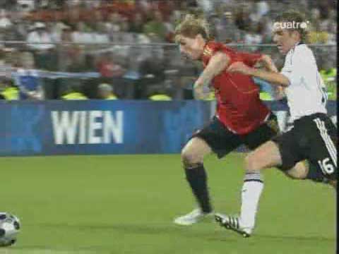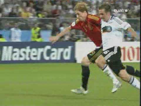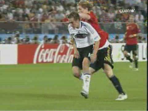 「じつに44年ぶりらしい」 「トーレスのゴールを守りきっての勝利」 「実は、プレビューにもある通り、スペインがドイツに勝つこと自体は意外なことではない」 「遅れてきたプレビューというやつやな」 「日曜の昼からネット障害でアップすることができずに申し訳ない」 「いいわけはあかんな」 「ほんまのことやから仕方がない」 「さよか」 「それはそれとして、ドイツに勝つことは意外でないとして、スペインがこの大会に優勝したのは実に意外だった」 「始まる前は、とても勝てるとは思えなかったしな」 「決勝が終わった直後から、”なぜスペインは勝ったのか?その鍵となったのはなにか?”という疑問が頭から離れなかった」 「ぜひとも答えておかなかればいけない問題やな」 「それについては追々議論していこうかと」 「ええで」 「とりあえず試合やな」 「先発はこう」 「双方ほぼ予想通りではある」 「ドイツでは、クローゼとバラックが横並びであること、スペインではファブレガスの位置が前にずれていることが特徴といえば特徴やな」 「これまでのドイツを見ていると、攻め筋は二つしかない」 「ラームが上がってのクロスと、ポドルスキーを使ったカウンター」 「要するに、左サイドからしか攻めることができない」 「まず、第一の興味は、スペインがこれをいかに食い止めるか、というものだったわけだが」 「別に、なにもしなかった」 「例えば、ドイツの左サイドにボールが流れるのを防ごうと思えば、トーレスがメッツェルダーを押さえるとよい」 「しかし、距離を空けていたため、自由にパスを出された」 「ドイツのパスの出所になるラームに対しても甘かった」 「シルバが詰めればいいのだが、これまた距離を空けすぎていた」 「ラームにファブレガスが行くかシルバが行くか、中途半端な場面も目立った」 「スペインの守備のゆるさが出て、立ち上がりはドイツが攻める展開になった」 「意外というかなんというか」 「なんで、アラゴネスはドイツの左を自由にさせたんやろな」 「攻め合って勝てる自信があった、と見るのが妥当やろな」 「それで、どうなったのかというと」 「33分にトーレスがゴールを決めた」 「下の形やな」 「右から縦に走り込んで、出てくるレーマンの上を抜いた」 「ここで、以前、コメントで教えていただいたトーレスの言葉が思い浮かぶ」 「プレミアのキーパーは倒れるのが早いから楽だ、というやつやな」 「レーマンもドイツ人ながらプレミアに長い」 「さて、その辺はどうかというと」 「やはり早い」 「トーレスのかかとがつく前に倒れる体勢に入っている」 「ここで一つ不思議なことがある」 「なんや」 「トーレスは、この形で、倒れるキーパーの上を抜くのが得意やろ」 「そうやな」 「昔、カシージャスの上を抜こうとしたら、実は相手が倒れていなくて胸にナイスパスをしてしまい、もの凄いブーイングを喰らったこともあった」 「あったな、そんなことも」 「そういう情報はレーマンも当然持っているはずなのに、お約束のように抜かれているのが不思議じゃないかね」 「レーマンは、左に飛び出すと寝る癖があるのと、トーレスのスピードが予想以上だったということちゃうか」 「そうなんかね」 「なんにしても、前半は0-1で終わる」 「そして後半」 「ラームがヤンセンに代わる」 「なんと」 「まあ」 「これはいかん」 「ドイツとしては、唯一の選手がいなくなってしまった」 「ボールを運ぶことのできるのは左で、そこでゲームメーカーのような役を果たすのがラーム」 「その彼がいなくなってしまったら、どこからも攻めることができなくなってしまう」 「この交代の理由は、怪我か監督との喧嘩意外に考えられない」 「スウェーデン戦でのイブラヒモビッチと同じやな」 「攻めに精彩を欠くドイツ」 「58分、ヒツルスペルガーを下げてクラニイを入れる」 「バラックが下がったわけやな」 「ここでも不思議なことがある」 「なんや」 「ドイツのフォワードへのロングボールが極端に少なかった」 「ゴメスの時もそうだが、背の高い選手を使うわりに、放り込まない」 「これは、このユーロを通してそうで、データにも残っている」 「プレビューにもデータの一部がある」 「それにしても、スペインは放り込まれるのが一番困るのだから、ドイツの側としては、体格をいかしてがんがん放り込んだらええと思わんか。それでゴール前の混戦が増えれば、体の付け合いで負けへんやろ」 「そういうチームを作っていない、ということかね」 「彼我の特徴を考えた時に、ラームがいない状態でもたもたつなぐより、放り込んだ方が遥かに効率的やと思うけどな」 「ドイツも、最後はメルテザッカーを上げて放り込んだけどな」 「もっと早くやってもええという話や」 「なんにしても、スペインが逃げ切って優勝」 「じつにめでたい」 「めでたいのはめでたいのだが、その理由はなにか、優勝できた原因はなに
