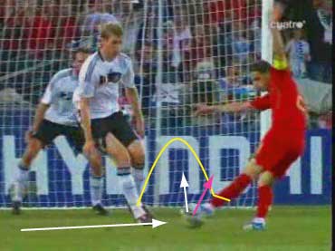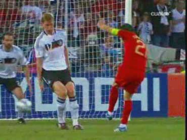 「ヌーノ・ゴメスのシュートに関してやな」 「この得点は、クリスティアーノ・ロナウドが左からボールを持ちこみ、そのシュートをキーパが弾いて、中央に跳ね返ったことから始まった」 「こぼれ球を、メルテザッカーが追いかける」 「ヌーノ・ゴメスがダイレクトでシュート」 「この時、メルテザッカーは、なぜか気をつけをしている」 「これはいかなる理由によるものかというと、下のようになる」 「横から来たボールを、逆サイドネットにシュートするというのはシュートを決める基本的な技術の一つである」 「そこで、ディフェンスは黄色い線のように足を出していきたいのだが、あわてて出すと、その下を通して決められる」 「これまた基本的な手筋の一つやな」 「メルテザッカーは、それを嫌って足を揃えた」 「ところが、ヌーノ・ゴメスは、その軸足の内側を抜かず、外側を通した」 「裏側から見た図はこちら」 「一番右に、ちらりと顔が見えるのがキーパーやな」 「一瞬の読み合いに勝つところが素晴らしい」 「この状態でニア側にシュートを打つと、戻ってくるキーパーが気になるところやけど、目の前のディフェンスの足のすぐ外を通せば、キーパーに対して一番遠い位置に打つことができる」 「よいシュートであったと」 「ちなみに、股と軸足については、こちらにもありますので」 「ご一読いただければと」 「これで、スコアは1-2」 「ポルトガル追い上げムード」 「ではあったが」 「60分にまたもセットプレーから失点する」 「チェコ戦で、ポルトガルの弱点として、セットプレーに弱いこと、テクニックに溺れること、ペペの裏がハイボールに弱いこと、以上の3点があったわけだが、見事に1番目でやられてしまった」 「次はその辺りを見てみようかと」 「こちらにてどうぞ」