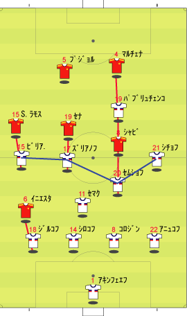 「今回もスペインが勝利した」 「先発はこう」 「ちなみに、前回はこう」 「システムも違えば選手も違う」 「当然といえば当然やな」 「しかし、ロシアにいたっては、先発11人全部違うで」 「それはちょっと凄いかもわからんな」 「スペインは、ユーロ前のペルー戦とほぼ同じ布陣やな」 「ちなみに、ペルー戦はこう」 「シャビ・アロンソをセナに代えたわけやな」 「中盤をカバーするための自然な選択かと」 「前の形だと、みんな行きっぱなしになりかねない」 「その辺りはペルー戦を参照していただくとして」 「システムの眼目はその時と変わらず、右のイニエスタを中に入れて、そこから崩していこうというものだった」 「しかし、それは封じられた」 「封じられた理由は後から見るとしてだ」 「うむ」 「19分にスペインが先制する」 「ビジャのゴールだった」 「その後の布陣が面白くて、次のようになった」 「完全に自陣に引いた1-4-4-1-1やな」 「1点リードしただけで完全に引く、というのはこれまでのスペイン代表にはない姿やな」 「カウンターから逃げ込みを狙う、まことに正しい姿ではある」 「それは、試合終了まで変わらなかった」 「その証拠に、この試合のボール保持率は、スペインが46%、ロシアが54%」 「UEFAの調べによると、スペインが8%負けている」 「これは驚きのデータやな」 「普通にやれば、スペインがボールを持ってロシアが守るはずやから、逆になるはずやな」 「その理由は簡単で、スペインがしっかりと引いたもんだから、ロシアはハーフラインの前方のスペースでいつまでもボールを回すことができた」 「その最中にミスが出るのが困りものやったんやけどな」 「スペインは、そのミスに乗じてカウンターからチャンスを作り出す」 「リードしたまま試合は進み、62分までに下のようになる」 「トーレスとイニエスタが外れて、セスクとカソルラが入る」 「これも、ペルー戦で見られた配置やな」 「今のスペインは、イニエスタを右に置いてそこを起点にするパターンと、トップ下にセスク、右にカソルラを置いて、一般的な1-4-4-1-1で戦うパターンが存在する」 「この試合では、相手の左サイドバック、ジルコフが攻撃で非常にいいプレーを見せていたので、それを押さえるためにもカソルラの方がいい」 「ジルコフは、イニエスタを後ろに引っ張るというスペイン対策としてもいい働きだった」 「おまけにセルヒオ・ラモスでも止めるのに苦労していた」 「あれだけ苦労するセルヒオ・ラモスというのもあまり見たことがない」 「それはそれとして、先制した後、引いてからのカウンターという手が見事に決まって、4-1で快勝した」 「まずはめでたいと」 「うむ」 「次に、ロシアの方を見てみる」 「ペルー戦で大活躍をしていた、スペインの右サイドを非常に警戒した布陣だった」 「右は、イニエスタを左サイドバックのジルコフが、セルヒオ・ラモスを左中盤のビリアレトジノフがマークする」 「中央では、シャビをセムショフとパブリュチェンコが、セナをズリアノフがマークする」 「パブリュチェンコは、マルチェナもケアする」 「そのようになっていた」 「ここで一つ不思議なのは、ロシアの中盤のラインで、20番のセムショフが少し凹んでいた」 「システムを1-4-1-4-1だと見ると、確かにセムショフの位置が他の選手より低い」 「1-4-2-3-1だと見ても変で、明らかにセマクよりも高い位置にセムショフがいる」 「これはどういう意図なんやろな」 「天地は逆になるけど、スペイン対策で1-4-1-4-1に組んで、中に入るイニエスタをケアする方法があったやろ」 「中に一枚置いて対応するやり方やな」 「ロシアのように組めば、その一枚が左サイドに寄るのでイニエスタに対処しやすい。これともう一つは、シャビのところにパスを集めさせて、セムショフとパブリュチェンコで挟む狙いがあったのではないかと思う」 「思うだけか」 「本当のところは、監督のヒディングに聞かないとわからないので、どなたか聞いていただきたいと思う次第やな」 「イニエスタに対する守備としては、まず、彼が単純に中へ入った場合には下のように対処する」 「ジルコフがついていき、中でセマクと挟む。そこへ17番のズリアノフが下がってきて、ボールを奪ったらカウンター」 「その時、上がってくるセルヒオ・ラモスには、ビリアレトジノフがつく」 「ビリアレトジノフの名前がどうにも覚えられなくて困る」 「歳やな」 「なんにしても、先制を許す前は、いいカウンターがでていた」 「イニエスタが本当に中央に行った場合の守備はこうなる」 「普通に中盤がボールに寄せて、ジルコフがサイドに残ってセルヒオ・ラモスをケアする」 「これにより、スペインの右サイドを抑えた、という点ではロシアの作戦は成功だった」 「しかし、17分に失点して話が変わる」 「その失点は、センターバックのパスミスからだった」 「14番のシロコフがほぼフリーの状態で前方へパ