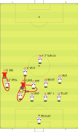 「下の流れから、どのようなパスが出たか、というのが問題であったわけだが」 「正解はこう」 「ピンクのパスをフェイントにして、ディフェンスを右につって、白い方向にパスを出す」 「その結果、キーパーとの1対1が生まれた」 「一対一をいっても、チェクの飛び出しが良く、そのまま点が決まったわけではないけどな」 「それにしても、今回のパスと、トルコ戦のパスは、まったく同じ手筋やな」 「おまけに、パスを出した選手は、同じヌーノ・ゴメス」 「そこが鍵やな」 「どこや」 「上手い選手の上手いプレーといっても、実は状況とそれを打開するアイディアは同じというところや」 「そこか」 「インサイドで出すか、スパイクの横で出すかといった技術の違いはあれ、それの根底にあるものは同じで、見方によっては、同じことを繰り返しているだけのことが多い」 「それを盗めば、我々もビューティフルなプレーができるということか」 「そうありたいところやな」 「見るのも楽しくなるしな」 「それは必ず楽しくなるな」 「見るといえば、パスが出るひとつ前のこのシーンは大切やな」 「なんでや」 「鑑賞のポイントとしては、ヌーノ・ゴメスにボールが入る前のディフェンダーの動き、つまり下の図のオレンジ丸でかこまれた赤い選手の動きが大切やろ」 「彼が、この状態で右につられているから縦に通るわけやな」 「もし彼がヌーノに詰めていたら、右に返すのが正解になる」 「そりゃそうやな」 「そのディフェンスの動きが、次のプレーを決定付けるわけだから、鑑賞側としては、ヌーノがボールに触る前にそれを見ておくと正しくプレーを味わえるわけや」 「さよか」 「ちなみに、スペインのあるマスコミで、”ヌーノ・ゴメスは、パスを半分ミスしたから上手くいった”と言っていた」 「とんでもない話やな」 「右に返そうと思ったボールを蹴り損ねて縦に出たから偶然上手くいった、ということをいいたいのだと思うが、トルコ戦から考えても、足の動きを見ても、明らかに意図的なプレーやで」 「その辺りは、こちらの動画でご確認いただければと」 「要するに、上の発言をした人は、正しくプレーを鑑賞できていない」 「ご不満のご様子やな」 「あんな発言をしては、ヌーノ・ゴメスに失礼というものやで」 「不満といえばだな」 「なんや」 「この試合でもちょっと不満なことがあってだな」 「愚痴か」 「多少そうやな」 「よろしくないな」 「分けて書くか」 「その方がええな」 「では、愚痴編はこちらというところで」 「また次回」 「ご機嫌よう」