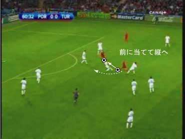 「毎日サッカーが見られる至福の期間であるな」 「サッカーファンにとっては、寝不足で体調がおかしくなる期間であるとも言われている」 「最初にとりあげる試合は、ポルトガル対トルコ」 「先発はこう」 「ポルトガルは、1-4-1-4-1」 「この試合の要点をまとめると次のようになる」 「なんだこれは」 「ポルトガルは守備的にエムレを押さえることに腐心していて、モウティーニョが主にマークしていた」 「トルコはエムレのキープとパスから穴を空けてくるチームやからな」 「トルコの側としては、トウンジャイが鍵で、彼のところにシュートチャンスやシュートチャンスになる一つ前のボールが回ってくるものの、高確率でミスをしていた」 「それが赤い線の意味か」 「そうやな」 「わかりにくいで」 「そうかもわからん」 「ポルトガルの方の問題といえば、下の感じか」 「なんや、これは」 「まず、シモン、クリスティーアノ・ロナウドが両方左好きで悩ましい」 「二人とも左の方が明らかに破壊力があるのは確かやな」 「この試合でも、いいプレーはほとんど左からやしな」 「試合中よくサイドを変えるが、右に行った選手が余る傾向がある」 「あとは、守備面で、中盤から前の選手にボジングワまでどんどん上がるから、最初のプレッシャーを抜けられると中盤が薄い」 「まあ、戻りが早いからそれほどもろくはならんけどな」 「おまけにセンターバックが抜群にいいから、多少薄くなっても耐えられる」 「カルバーリョとペペはええな」 「全世界垂涎ものやな」 「さらに、この試合では、ペペが先制点を決めた」 「それもセットプレーではなく、往年のリベロのように最後尾からするすると上がっていき、最後はスルーパスを受けて決めた」 「やりすぎやな」 「そのプレーで、興味深いテクニックがあったので、それを以下にご紹介しようかと」 「うむ」 「まず、下の状態から、ペペが中央へドリブルでしかける」 「赤い方がポルトガルで、中央のボールを持った選手がペペ」 「この時、前で引いているフォワードはヌーノ・ゴメスやな」 「ヌーノ・ゴメスは、ディフェンスに隠れて見えにくいが、頭がちょっと出ている」 「次に、ペペはフォワードにパスを送って前に出る」 「その結果、下のようになる」 「ボールを持っている赤い選手がヌーノ・ゴメス、ペペその手前に走りこんでいる」 「この形から、一番考えられるプレーはなにかというと」 「下のワンツーやな」 「ペペがヌーノに渡し、それを再びペペに返す」 「これをこれ、ワンツーという」 「ところが、この場面では、ワンツーはワンツーでも、そうはならなかった」 「果たしてどのようなパスが出たのか」 「下の写真をヒントに考えていただきたい」 「正解はこちら」