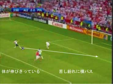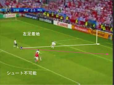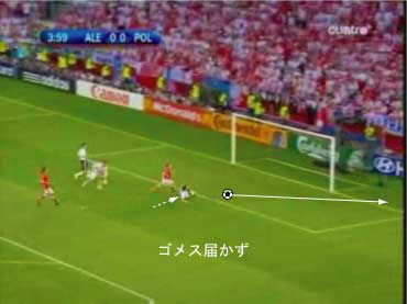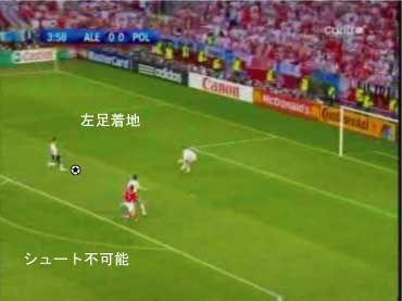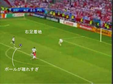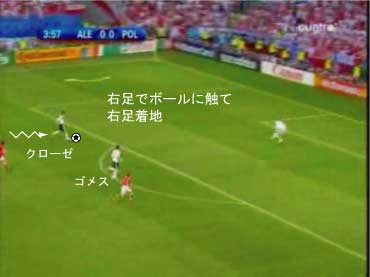 PKエリアに入る直前で、右足でボールに触り、右足で着地する。 以下、着地一歩ごとに見る。 次に右足を着地した時点で、ボールとの距離が空きすぎている。 本来は、この次がシュートのための踏み込みになるべきである。 しかし、ボールが離れすぎているためにそれができない。 これ以上前に進むと、キーパーとの距離が縮まり過ぎる。 よって、苦し紛れに横パスを選択した。 この時、ボールまでの距離があるため、体を大きく伸ばしてパスを出すことになった。 体が伸びた状態では、ボールに与える力をコントロールするのが難しい。 このため、パスが強すぎた。 ゴメスが届かなかったのは、それが原因である。 要するに、下の図においてボールを前に出しすぎたため、このプレーは失敗した。 下の状態からシュートを打てれば、クローゼは確実に決める自信があるはずであり、本人もそのつもりだった。 赤いシュートをフェイクにして、白いコースでもいいし、この場合はキーパーがニアに寄りすぎているので逆もよい。 このプレーは、ラン・ウィズ・ザ・ボールにおけるボールタッチの重要性をあらわしている。 このようなミスは、プロでも非常に多い。