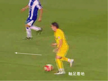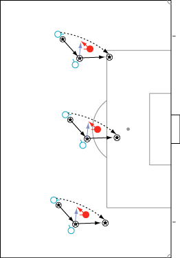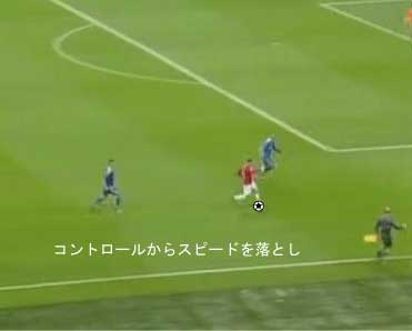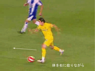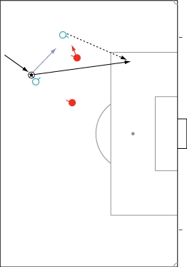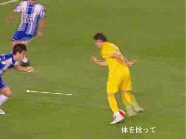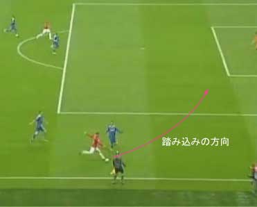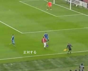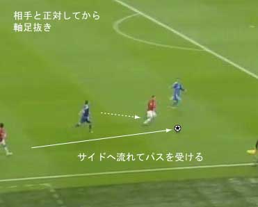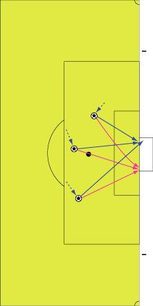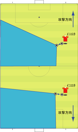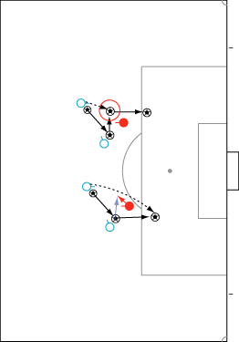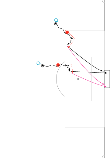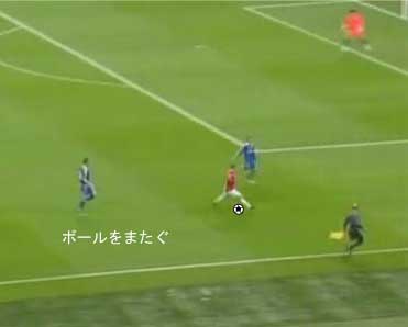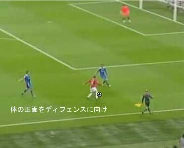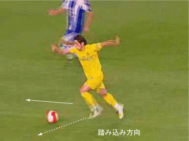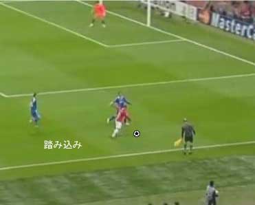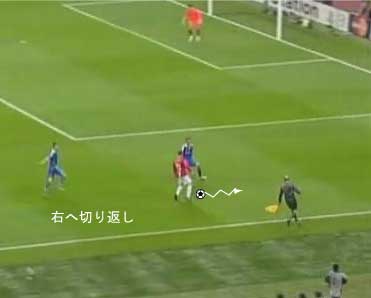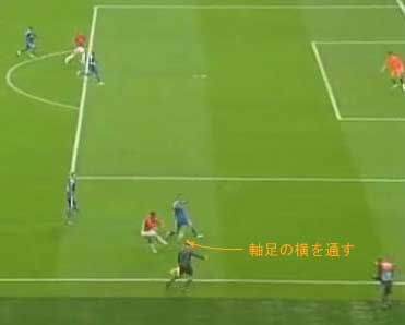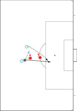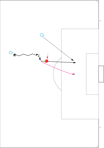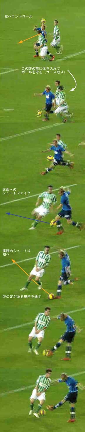 シュートやパスで相手の足元を抜く場合、一度ディフェンスに正対すると良い。 正対とは、体の正面を相手の正面に向けることを意味する。 これは、相手の足を揃え、利き足方向にスペースを作る効果を持つ。 以下に具体例を見る。 0708シーズンチャンピオンズリーグ決勝、マンチェスター・ユナイテッド対チェルシー戦の42分におけるルーニーのプレーである。 ここでは、シュートではなくクロスが目的となっているが、フェイントなどのメカニズムは同じである。 ここで、ディフェンダーの重心が後ろにのっているのがわかる。 正対して前進する構えを見せることで、ディフェンスにこの体勢を取らせることができる。 一度相手を押し込むことにより、横へのドリブルが楽になる。 以上のように、一度相手と正対し、押し込む姿勢を見せられると、ディフェンスは横の動きに対する反応が遅れる。 この遅れを取り戻すために大きく足を出すため、その下を抜きやすくなる。 このようなパスは、俗に「股抜き」と言われる。 しかし、股を抜くよりも相手の軸足を意識し、その横を通す感覚を持つほうが良い。 片足で立つ人間は、軸足を動かすことができない。 このため、足元を抜いてシュートやパスを送る場合、その横を通せばカットされる心配はない。 よって、動きの中でマーカーの軸足を意識することは非常に大切である。 相手と正対する。一度正面へ押し込む。利き足方向へ切り返す。相手の軸足を意識しながらキックモーションに入る。足を返して軸足の横を抜く。 具体的には、以上の手順でこのプレーは行われる。 右足でシュートを行う時、角度の変更は下の図のようになる。 ピンクがフェイントのシュートコース、青が実際のシュートコースである。 一般的に、15度前後ずらせばよい。 インフロントからインステップ、インステップからインステップ、インステップからインサイドにサーフェスを変えて角度を変えることが多い。 基本的な状況において、このテクニック自体は難しくない。 踏み込んだ後、体の中心、肋骨のやや下側を後ろに引くようにすると蹴りやすい。 ラウールや、フォルランのシュートでもそれは見られる。 ラウールのシュートは、いわゆる股抜きであり、フォルランは違う。 しかし、軸足の点からみれば、ラウールは相手の軸足の内を通しており、フォルランは外を通している。 上の二つのシュートは、内側、外側の差があるのみで、軸足の横を抜くという点において原理的に同じである。 練習法 以下の点が大切である。 ・相手と正対する ・一度正面へ押し込む ・利き足方向へ切り返す ・相手の軸足を意識しながらキックモーションに入る ・足を返して軸足の横を抜く 以上の手順を習得する最も単純な方法は、1対1からのシュートである。 この場合、キーパーを必要としない。 タイミングは、ファーに打つシュートがブロックされるタイミングで足を返すのが最もよい。 フェイントをかけるためには、先手を取る必要がある。この練習では、ドリブルで一度相手を押し込むことがそれにあたる。 パスを出す選手を用いる場合、下の練習も有効である。 この場合、一度正面を向いて押し込む必要はない。 また、軸足の内側だけでなく、外側を抜くシュートも重要になる。 下のような状況では、後ろからシュートブロックに来るディフェンスの足元を抜くプレーが有効である。 裏を取られた守備者は、あわてて足を伸ばすケースが多い。 シュートブロックに来た場合、ニア方向に踏み込んだ後、一瞬待ってから足を返せばちょうど逆サイドに抜ける。 この技術は、シュートやクロスにおいて、敵をあざむく最も簡単な方法の一つである。 下のような形では、スルーパスに使うこともできる。 応用範囲が広く、ぜひ身につけたい技術の一つである。