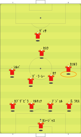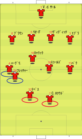 ゲームプラン チェルシーの先発は、非常に高い確率で次のようになる。 左にカルーを置けばカウンターの威力が増し、マルダを置けば守備的に安定する。 チェルシーは、下のように引いて守る。 ボールを奪った後、ドログバへ、もしくは、サイドへのロングボールからカウンターを行う。 この目的のため、押し込まれた側と逆の選手は前に残る。 左サイドを攻められた場合、右のジョー・コールが高い位置を保つ。 チェルシーとしては、マンチェスターが短いパスをつないで攻めてくる方が望ましい。 これは、1-4-1-4-1は、相手ボランチへのプレッシャーをかけやすいシステムであり、1-4-4-2のパス回しを寸断するのに適しているからである。 中盤でボールをひっかけてカウンター。 これがチェルシーのパターンである。 ユナイテッドが、あえてそれに立ち向かうなら、下のような先発が考えられる。 1-4-1-4-1に対抗するためには、プレッシャーのかかりにくいディフェンスラインからの組み立てが鍵になる。 ここのため、サイドはブラウンよりもハーグリーブスの方が良い。 しかし、このように組まれる可能性は低い。 プレッシャーのかかる試合ではミスがでやすいことを考えても、相手の得意な土俵で戦う必要はない。 チェルシーのように、中盤の守備が堅いチームに対しては、そこを飛ばすのが最も簡便な対策である。 ディフェンスや、中盤のラインも無理に上げず、相手にボールを持たせる形にすればよい。 その方が、チェルシーにとっては苦手な形である。 この場合、マンチェスターの先発は以下のようになる。 チェルシーのドログバと比較して、クリスティアーノ・ロナウド、テベスはロングボールを受けるのに適しているとは言い難い。 その不利をおしてでも、中盤を飛ばす方が良い。 前半は、相手の固い部分を避け、スペースの生じる後半に勝負をかけるのが妥当である。 交代:チェルシーが不利な場合 左にマルダを置いた場合、チェルシーの先発は次のようになる。 チェルシー不利の場合、つまり、得点が必要な場合の交代は次のようになる。 さらに時間が進んだ場合、中盤の選手を外してシェフチェンコを入れる。 これに対し、マンチェスターは、サイドの選手を代えて対抗する可能性が高い。 最終的に、テリーを上げたパワープレーも考えられる。 その場合、5バックで対抗するのが妥当である。 交代:マンチェスター・ユナイテッドが不利な場合 先発を次のように仮定する。 ここからマンチェスターが攻める場合、その変化は多岐に渡る。 例えば、サイドを代えるならば、下のような交代が考えられる。 疲れやすいサイドを、攻撃に有効な選手に代えている。 しかし、同じメンバーで、下のような配置も可能である。 相手のチェルシーは、守備において変化の少ないチームである。 ジョー・コールをカルーかマルダに代えた後は、80分過ぎまで交代を遅らせる可能性が高い。 これは、先発の状態で十分に守備を重視していることと、控えに先発以上の力を持つ選手が少ないためである。 その意味において、チェルシーの対応は読みやすい。 しかし、それに対して、上記のどちらが有効か、断言することは難しい。 ユナイテッドの攻撃における変化が多い理由は二つある。 一つは、前線で複数のポジションをこなす選手が多いためである。 もう一つは、ベンチに先発と同等かそれ以上の攻撃的才能を持った選手がいるためである。 このため、可能な組み合わせの数が非常に多い。 例えば、サハを使う場合、次のような形も考えられる。 選択肢が多い、というのは、一般的によいことである。 しかし、あまりにも多すぎる場合、迷いを生じさせる原因となる。 無数の可能性の中から、最適なものを選び出すのは常に難しい。 この試合において、戦術的に最も興味深いのは、マンチェスター・ユナイテッドがリードされた場面での交代と配置の変化である。 |