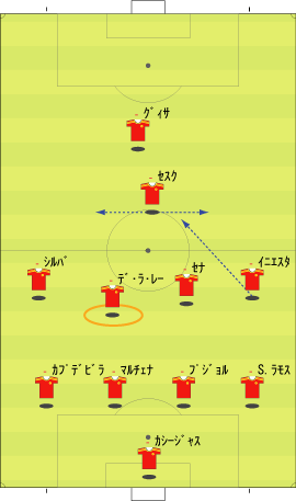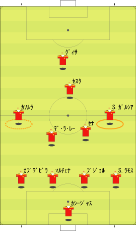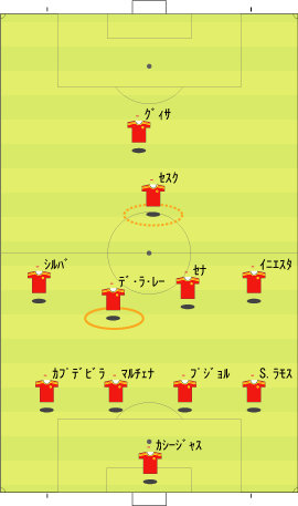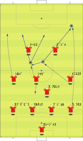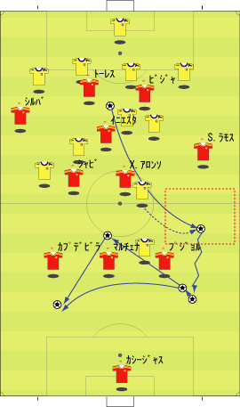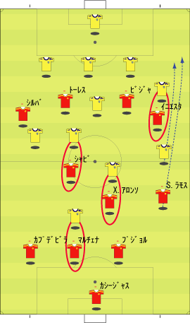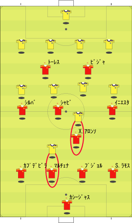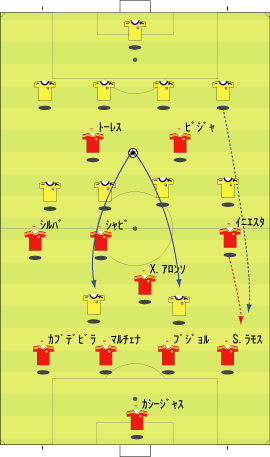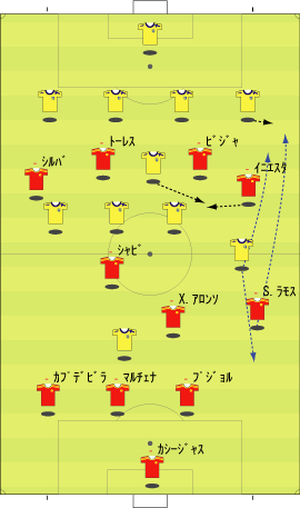 「スペイン代表はペルーと親善試合を行った」 「親善試合と言うには激しかったけどな」 「確かに」 「ペルーのファールに、あのイニエスタが切れる場面も見られた」 「普段は、いくら倒されてものれんに腕押しみたいな顔でプレーするのにな」 「珍しく相手にくってかかっていた」 「まあ、ペルーの方にもそれだけやる理由はある」 「スペインには、多くのペルー移民がいる」 「移民というのは、なにかと肩身が狭い」 「代表がまずいプレーをしたり、大差で敗れたりすると、それがますます狭くなる」 「勝てばそれが逆になる」 「そうなると、ペルー代表としては、気合を入れてやらざるをえない」 「もう一つは、ヨーロッパ市場へのアピールというのもある」 「活躍してスカウトの目に止まってスペイン移籍、という流れを狙うわけやな」 「特に今の時期なら、来シーズンのメンバーに滑り込むことも可能だから、張り切らざるをえない」 「そんな事情もあって、ユーロの準備試合とはいえ、かなり本気の試合になった」 「テストとしては本気のテストやな」 「そして、結果はどうだったかというと」 「2-1でスペインの勝ち」 「順当のように見えるが」 「決勝点が後半ロスタイムだったことを考えるとそうでもない」 「スペインの先発はというと」 「ふむ」 「なるほど、という感じやな」 「イニエスタが右に来ている」 「ここから選手がどう動くかというと、こうなる」 「イニエスタが中央に入ることで、クッションになり、そこから展開していく」 「彼が中に入る分、右サイドはセルヒオ・ラモスが大きく上がる」 「サイドの前が中、その外をサイドバックが上がるパターンやな」 「前半、この配置でわりと良くボールが動いていた」 「そして、後半からは下のようになる」 「ボランチとトップが交代した」 「シャビとシャビ・アロンソが下がり、セスクとセナ」 「トーレスが下がってグィサが出た」 「57分には、ビジャが下がり、デ・ラ・レーが入る」 「これは、どうやろな」 「セスクが中盤の前に入ると、下のようにイニエスタが入るスペースと重なる」 「上手くいかない気配が満載やな」 「それもあってか、その5分後にはこうなる」 「イニエスタに代えて、右にカソルラ」 「これならば、いわゆる普通の1-4-4-1-1の構造になる」 「さばくトップ下に、縦に動くサイドというやつやな」 「カソルラのクロスに対して、シウバ、セスクでは空中に弱い、というのはあるけどな」 「そして、最後にはセルヒオ・ガルシアが右に入る」 「代表デビューおめでとうというやつやな」 「この試合のスペインを見ると、二つのパターンを試したことがわかる」 「一つは、右にイニエスタを置き、彼を中に入れてそこから展開するパターン」 「もう一つは、セスクをトップ下に置き、サイドを縦に動かすパターン」 「ここでは、イニエスタの方を詳しく見たいと思う」 「うむ」 「その問題点をラインごとに見るとして、まず、キーパーとディフェンスについては下のようになる」 「セルヒオ・ラモスが頻繁に上がるので、右サイドにスペースが残りやすい」 「そして、センターバックの二人、マルチェナとプジョルは、ユーロレベルにおいて、ハイボールに強いとはいえない」 「さらに、プジョルは組み立てが上手いとはとてもいえない」 「次に中盤のラインを見る」 「一見、守備向きの選手が少ない」 「二見してもそうやで」 「まあな」 「守備向き云々というのは、所属チームでの役割を考えるとわかりやすい」 「例えば、シャビ・アロンソは、横にマスチェラーノという潰しを得意とする選手がいる」 「シャビ、イニエスタの後ろには、トゥレ・ヤヤが控えている」 「トゥレが守備向きかどうかは別にして、構成としては、彼がシャビとイニエスタをカバーするようになっている」 「シウバも、後ろをバラハ、マルチェナ、アルベルダといった選手にカバーしてもらっていた」 「つまり、この4人は、カバーされる側ばかりが集まっている、ということやな」 「こういう構成だと、ボールを持ってパスが調子よくつながっているうちはいいが、一度劣勢になると、とめどなく劣勢になりがちやな」 「最後に、フォワードのラインだが」 「まず、トーレスにボールがほとんど入らない。そして、フォワード二人の間のコンビネーションもほとんどない」 「ビジャとトーレスは相性が悪いのかね」 「良かった記憶がないな」 「まあ、そのようなスペインの弱点を考えた上で、相手の対策などを思い悩んでみる」 「一番最初に思い浮かぶのはこれやな」 「ツートップ系のチームなら、一人を下げてシャビ・アロンソをマークさせ、もう一人をマルチェナにつける」 「これで、なるべくプジョルにボールを持たせる」 「そうすれば、スペインの組み立てがうまくいかなくなる」 「ペルーも、後半からこの方法を採用していた」 「この作戦は、バルセロナ対策としても有名やな」 「これをもっと推し進