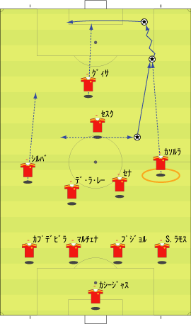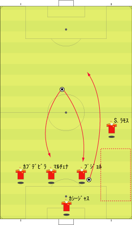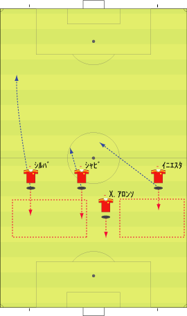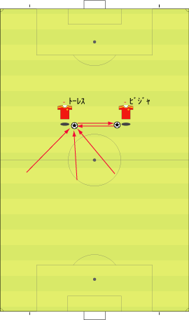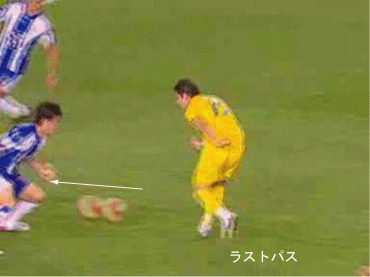 「前の文まで、”ワンツーで、横に出せるなら、そこを囮にして、もう一つか二つ裏を狙う”というアイディアについて詳しく見てきた」 「これを図で表すと、下のようになる」 「走りこむ選手と、ボールを返す選手の間にディフェンスが挟まれている状況なら、この技をしかけることができる」 「ゾーンはどこでもいい」 「応用としては、二人抜く場合にも使うことができる」 「ニハットのプレーやな」 「この系統のプレーのメリットは、下のようにあらわされる」 「上が普通のワンツーで、下が今回のワンツーやな」 「実は、受ける側としては、下の方が技術的に易しい」 「上の場合、赤い場所でのコントロールが難しい」 「前にスピードを上げながら横からのボールを受ける場合、プロでもミスが多い」 「その点、下のパスならボールとプレーヤーが同じ方向に走るのでコントロールは容易になる」 「そして、実は、サイドの崩しでこれと同じアイディアが非常によく見られる」 「これはよく見るな」 「サイドバックの裏を取る一つの手筋やしな」 「アイディア一つで応用色々というやつか」 「サッカーで一番大切なのは、結局そのアイディアの部分やしな」 「そうなんかね」 「例えば、ニハットがパスを出した場面で、変なテクニックを使っているんや」 「どんなんや」 「下のやつやけどな、一回軸足を着地したあと、そのまま飛び上がって、まるでケンケンをしながらボールを蹴っている」 「これは珍しい技やな」 「こんなんどこでも教えてへんやろ」 「ニハットの発明やろな」 「そこが問題なわけよ」 「発明がか」 「どこからその技が飛び出してきたかというと、最初にワンツーを返すフェイクから縦を抜こうというのがあるわけや」 「そらそうやろな」 「アイディアはあるけど、一回の踏み込みでは実現できない。ならば二回飛べばいけるではないか、というところにこの技の起源はあって、それが発想の源になっている」 「アイディアと現実のギャップを埋める橋渡しとして新技が生まれたわけか」 「必要は発明の母というわけで、必要というのはなにかを行いたいというアイディアが作り出すものだから、アイディアが技術を生む元になるわけや」 「あたりまえと言えばあたりまえの話やな」 「サッカーで技術高い、技術が低い、上手い、下手だとよくいわれるけど、じゃあそれを突き詰めていくと、どこにたどり着くかというと、アイディアが足りないから技術が高まらないというのも大きい」 「それは、あるかもわからんな」 「あと、このアイディアというのは、サッカーの文化成熟度とも関係する」 「またわけのわからんことを」 「例えば、チェスの話になるが、ポーランドかどこだかの国は、国民の60%くらいが妙手を妙手として鑑賞できるそうな」 「それがどうした」 「妙手を味わうためには、その時の状況や、何が問題になっているのかということを確実に把握していないと無理やろ」 「そりゃ、駒の動かし方もしらんようではわからんわな」 「つまり、より深くチェスを理解していればしている程、素晴らしい一手をより深く味わえるわけで、そういう人が多ければ多いほど、その国にチェスが浸透している、ひいては、その国にチェス文化があるということができるわけや」 「そういう基準か」 「そうなると、サッカーにも同じことが言えるやろ」 「いいプレーをより深く味わえる観客が多いほど、その国にサッカーが浸透している証ということか」 「プレー人口が多いといった基準の他に、そういうのも大切ちゃうかということや」 「どうやろな」 「だから、こういう技術を分析する文章はわりと大切やと思うわけやな」 「だから最近、ゴールの決め方や、キーパーとの1対1、ラウールの小汚い技や、グティのパスなんかに関する話が多かったのか」 「多分そうやな」 「しかしまあ、そんな大業なことを言わんでも、色々わかった方がおもろいし、やる時に楽しいでええやろ」 「もちろんそうやけどな」 「あんまりサッカー文化とか言い出すと、うそ臭いインテリゲンチャ気取りみたいでようないで」 「そうかね」 「大体そういう人は信用したらあかんことになってんねん」 「そんなこんなで」 「サッカーの技術は色々と面白いというところで」 「また明日」 「明日もやるんかいな」 「たぶんな」 「そんなこんなで」 「ご機嫌よう」 この記事の先頭へ