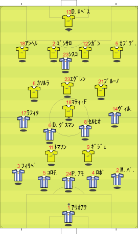 ポジション別に図示すると次のようになる。 特徴は、サイドが薄く、ボランチ系の選手が多いことである。 また、中盤に守備を得意とする選手が少ない。 監督のアラゴネスは、予選においてイニエスタをサイドで起用することが多かった。 彼を左に置くとして、下のような配置が考えられる。 しかし、シルバの右サイドがやや無理である。 セルヒオ・ガルシアが右のバックアップであるとすると、下のようになる。 ここからの動きは以下のようになる。 1-4-4-2で、左の中盤が中に入り、その外をサイドバックがフォローするパターンである。 このようなシステムでは、左からの崩しが鍵になる。 左の中盤にジダン、リケルメなどを配して成功した例がある。 イニエスタ、セスクのパフォーマンスが注目される。 左サイドバックのカプデビラは、クロスに優れる。しかし、1対1でのドリブル勝負は苦手としている。ダビー・ナバーロはなおさらである。 その点、攻撃に不安が残る。 得点を取るための変化は下のようになる。 アラゴネスは、点が欲しくなるとサイドからの突破を重視する傾向がある。 このため、1-4-3-3や1-4-2-4が勝負手となる。 左にシウバかビジャ、右でカソルラ、セルヒオ・ガルシアが予想される。 守備の変化は下のようになる。 中盤の守備は、センターバックのマルチェナとアルビオルを上げて補う。 後半の放り込み対策などで有効である。 また、1-4-1-4-1なども考えられる。 アラゴネスの好みと召集メンバーからして、キックオフからの3バック系は考えにくい。 後半、最後の勝負をかける1-3-4-3か、10人になっても攻める1-3-4-2などの状況でしか使用されないだろう。 システムについては、フランス戦のように、中盤にシウバ、セスク、シャビ、イニエスタと並べる可能性もある。 アルベルダをマルチェナなどに代えてこれが試される可能性もあるが、上手くいかないであろう。 これまで、フェルナンド・トレースは代表において満足な活躍ができなかった。 主な問題点は、体のバランスが悪さから、簡単なシュートで体勢が崩れて外していたこと、及び、相手に引かれた狭いゾーンでボールを受けることができなかったことであった。(参考:スペイン対ウクライナ、トーレスのバランスについて) 体のバランスについては改善が見られ、プレミアにおいて、以前なら外していたキーパーとの一対一を決めている。 この点については、どのようなトレーニングで修整されたのか、非常に興味が持たれる。 狭いゾーンでのプレーについては、体のバランスが改善されたにも関わらず、それほど良くなっていない。 スペースを潰してくる相手に対するプレーが注目される。 |