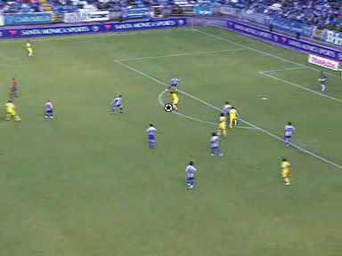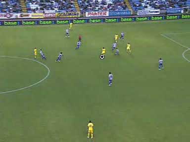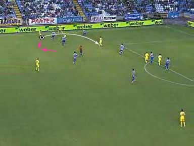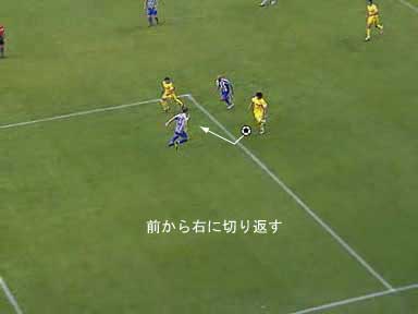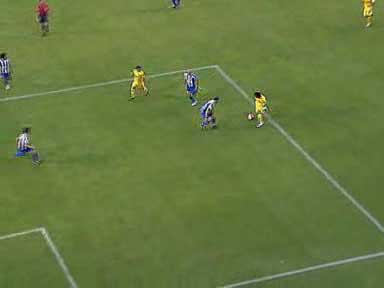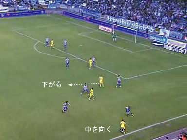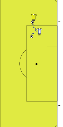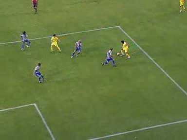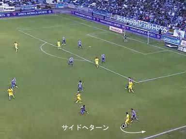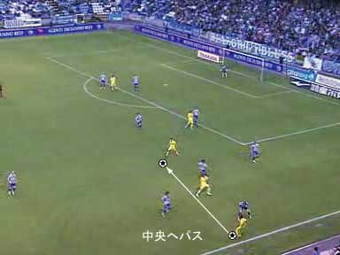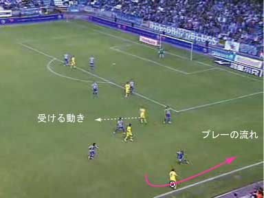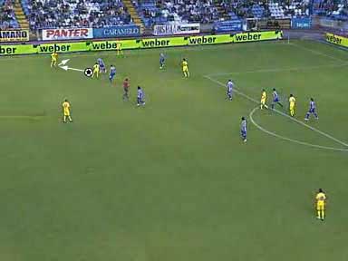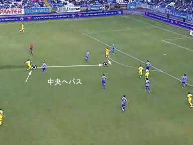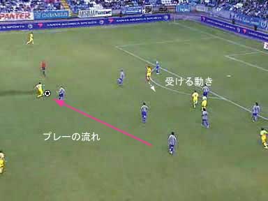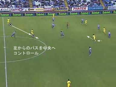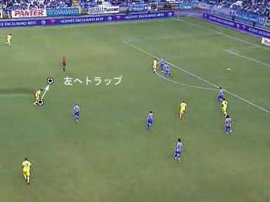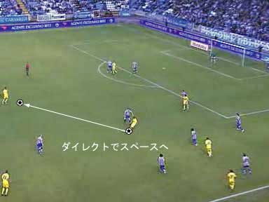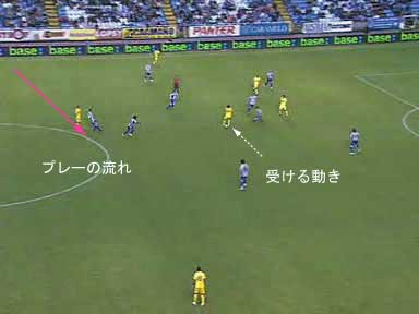 「いわゆる最終節を迎えた」 「長かったような短かったような」 「短かったような長かったような」 「そんな最後の試合はデポル対ビジャレアル」 「終わってみればビジャレアルの完封勝ちだった」 「先発はこう」 「デポルはいつもの1-5-4-1」 「ビジャレアルは1-4-3-1-2やな」 「珍しいといえば珍しい」 「メンバー的にも珍しいな」 「ベンチに、いわゆるレギュラークラスが控えていて、普段あまり先発しない、トマソン、ギジェ、マティアス・フェルナンデス、アンヘル、ブルーノなどが出ている」 「これは、2位確定が確定して、この試合に勝っても負けても順位変動がないことが関係している」 「控え選手をなるべく多く出して、慰労と来シーズンへの布石のためやな」 「今シーズンのビジャレアルは、苦しみながらも2位の座を手に入れた」 「おまけにバルサに10ポイントもの差をつけた」 「それはバルサがひどすぎただけやけどな」 「まあな」 「ただ、ビジャレアルは楽に勝ってきたかというと、そんなことはない」 「最終的に勝ちを収めた、レクレアティーボ戦、ヘタッフェ戦を見ても、前半は非常に苦しい試合だった」 「それを戦術と個人の能力、集団でのパスワークでカバーして順位を上げてきた」 「リケルメ、フォルランがいたころの爆発的な強さはないけれども、チームとしての勝利という意味では以前にも増して素晴らしいシーズンだった」 「確かに」 「しかし、今シーズンも、びっくりするくらいよくボールをつないでいた」 「今のスペインリーグであれだけ大切に回すのはビジャレアルとバジャドリーくらいなもんやな」 「そのパスを受けるにおいて、ビジャレアルには一つの特徴がある」 「ほう」 「例えば下のような場面やな」 「まず、ボールを持った選手がサイドへターンする」 「ターンした後、縦パスを送るフェイントをかける」 「そう見せかけて中央へ向きなおる」 「この時、中央の選手が後ろに下がる」 「そこへ横パス」 「ダイレクトで逆のスペースへ展開する」 「このような次第か」 「そうやな」 「これがどうした」 「その前に、この後の展開を見ていただきたい」 「後というと、下の図の後か」 「パスを受けた選手は、左へトラップする」 「そこから中央へパス」 「受ける選手は左サイド側から右サイド側に動く」 「結果、こうなる」 「上の二つの流れには、下のような共通点がある」 「ほうほう」 「最初のプレーでは、プレーが前に流れているのに対して、ボールを受ける選手は後ろに動いている」 「二番目のプレーでは、プレーが左に流れているのに対して、ボールを受ける選手は右に動いている」 「なるほどな」 「これは、パスを回すとか、ボールをつないで攻める時に非常に重要で、プレーの流れと逆に動く選手の存在によってボールを停滞させずに動かすことができる」 「みんなが同じ方向に動いたらどこかで詰まるからな」 「これはビジャレアルのオフ・ザ・ボール、つまり、ボールを持っていない場所での動きに置いてよく出てくるパターンなんやな」 「下もそうか」 「まず、左サイドからのパスを中央で受けて、右方向へコントロール」 「これに対して、中央前側の選手は、左に動いてボールを受ける」 「結果、こうなる」 「流れ図としては下の形か」 「原理はさっきの二つと一緒やろ」 「そうやな」 「これは、いわゆる”反航系”と呼ばれるパターンになる」 「プレーのベクトルと受ける選手の動きのベクトルが反対向きだから反航ということか」 「そういうことやな」 「安直やな」 「ほっとけ」 「そうもいかん」 「なんにせよ、これを行う時には、一般的に、パスを出す選手が、出したい方向と逆側にボールをコントロールすると上手くいく」 「どういうことや」 「例えば、下の最初の例では、右からくるボールを左にコントロールしてから右に出しているし、次の例では、左から来るボールを右にコントロールしてから左に出している」 「コントロールした方向にディフェンスの注意は集中するから、その逆に出せば通りやすい、ということか」 「それに、こうしておけば、自然と90度方向にパスがでるので、死角に入りやすい」 「90度については、こちらやこちらをご覧いただくとして」 「この、コントロールのすぐ後に逆へパスを出す、という技は、反航系だけでなく普通の場面でも使用可能で、下のようになる」 「下か」 「まず、中から左サイドへのパスを左へコントロール」 「左にコントロールしたボールを、右方向、つまり中央側へと戻す」 「前の二つと同じパターンではあるな」 「ようするに、最後のパスを出す直前のボールのコントロールそのものがフェイントになっているという話や」 「そうか」 「ちなみに、ここからビジャレアルの1点目が入る」 「その1点目なんやけどな」 「なんや」 「それに関する、簡単な個人技問題を作ってみたので、興味のある方は解いていただければと」 「こちらからご覧になれ