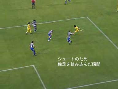 マティアス・フェルナンデスは、上の状況からファーサイドには打たなかった。 どのようなシュートを打ったか、下のインパクトの瞬間の写真を参考に考えよ。 問2解答: シュートブロックに来るディフェンスの足の下を通し、ニアに打った。 シュート軌道を見ると、ディフェンスを突き抜けているように見える。 このシュートは、3つの死角を利用している。 一つ目は、この形から一般的にはファーサイドに打つという心理の死角である。 二つ目は、キーパーはディフェンスがニアへのシュートコースを切ると思う、信頼の死角である。 三つ目は、ディフェンスの体により、ボールが見えにくいという意味での死角である。 これらは、下図のようにあらわされる。 一般的に赤い矢印のようなシュートが予想され、黄色いゾーンについては、ディフェンスが切るものと期待される。 ディフェンスの足がインパクトの瞬間を隠すため、キーパーは反応が遅れる。 また、この場合は、下を通すディフェンスの足を意図的に上げさせている。 一枚目の写真では、赤いコースにシュートを打つモーションで入り、二枚目の写真で足を反して下を抜いている。 ディフェンスがフェイントにつれられ足を高く上げているのがわかる。 キーパーは、一般的に下図のような状況において、黒い影の部分をディフェンスが切ると信じる。 このため、足の下や間を抜くシュートは非常に入りやすい。 このようなシュートは、昔はスーケル、現在はディエゴ・ミリートやフォルランが得意としている。 彼らは、わざとシュートモーションを遅らせることでディフェンスを引き付け、足を開かせてからそこを抜くことも多い。 そこまでできれば、確実に一流である。 参考:フォルランのシュート 第1問 補足:練習方法など