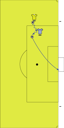 左サイドから、中央にボールを持ち込んだ選手がマイナス方向へ切り返した。 図示すると次のようになる。 問1: この後、シュートを打つ。 どのようなコースへ打つか、最も一般的なものを答えよ。 問1解答