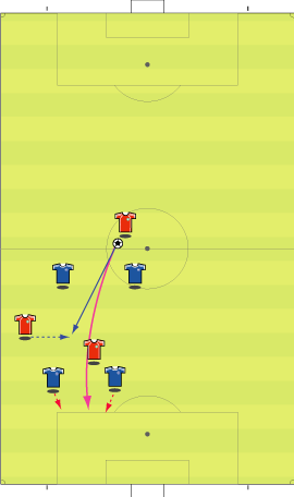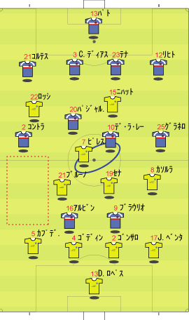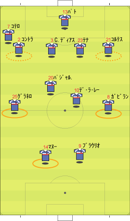 該当試合において、次のような両チームが対戦した。 下図のように、ヘタッフェのデ・ラ・レーのパスさばきが非常によく、前半はヘタッフェのペースだった。 これは、エリア内へのセンタリングの数において、4対14とヘタッフェが大きく上回ったことでうかがうことができる。 ビジャレアルは、非常に苦しい時間が続いたが、カウンターが良く機能し、2-0とリードしてハーフタイムを迎えた。 この状況において、ビジャレアルの監督の立場から以下の問いに答えよ。 問1: 後半に向けての変更を考えよ。ただし選手の交代は行わないものとする。 問1解答