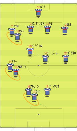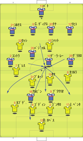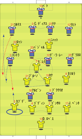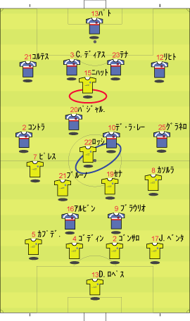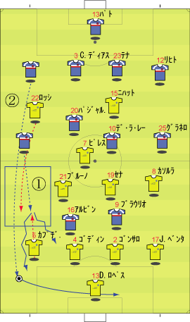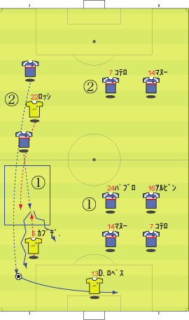 下図のように、デ・ラ・レーを押さえられたことで、攻撃に支障が生じた。 この解決策を述べよ。 交代を行うものとし、ベンチにはこの状況を打開するために理想的な選手がいるものと仮定する。 解答 相手が残したスペースを活用することが、最も直接的な方法である。 まず、一対一でカプデビラに勝つことのできる選手を右サイドの前方に置く。 次に、同じサイドのサイドバックにロッシを振り切ることができ、クロスの正確な選手を置く。 相手の守備は、カプデビラが一対一で勝つこと、ロッシがサイドバックをマークすることを前提として成り立っている。 これを崩すことが鍵となる。 交代の順番としては、上図の①を先に行い、②を先に行うことが基本である。 サイドバックを上げる場合、ロッシからのカウンターで失点する可能性が高まるためである。 ヘタッフェにおいて、①、②それぞれについて現実的な選択肢を考える。 右サイドの前方には、パブロ・エルナンデスが最も適任である。 スピードがあり、ドリブル突破に長け、クロスも正確だからである。 しかし、彼はこの試合に召集されていない。 代案としては、アルビン、マヌー・デ・モラル、コテロが考えられる。 スピードとドリブル突破を考えると、前二者が適任である。 右サイドバックは、コテロとマヌーが候補に上がる。 持久力が高く、クロスの的確なコテロが適任である。 守備を捨ててかかる場合、マヌーという選択肢もある。 まとめると下図のようになる。 実際には、左サイドにガビランを入れ、グラネロを右に配した。 これは、前述の交代と比べて以下の不利がある。 一つは、グラネロはスピードに優れる選手ではなく、スペースを縦に行く力が弱いことである。 二つ目は、後半から出る選手をカプデビラに当てる方が体力的に優位であることである。 グラネロは、ボールキープからのパスを得意としている。 その特徴をいかすならば、同時にコテロを右サイドバックに入れフォローさせることが理にかなっている。 最終的に、以下のような配置になった。 ビジャレアルは、中央を押さえるという主題を貫いた。 これに対し、ビジャレアルは、デ・ラ・レーを下げグラネロを中央に配したが、ゴール前に迫りきることができなかった。 作戦的には、ペレグリーノの圧勝であった。 疑問、感想、修整などありましたらコメントにてお寄せ下さい。 問題集トップ 次問