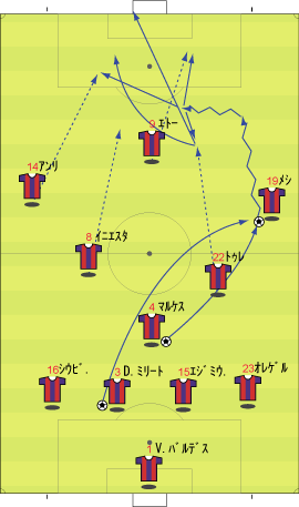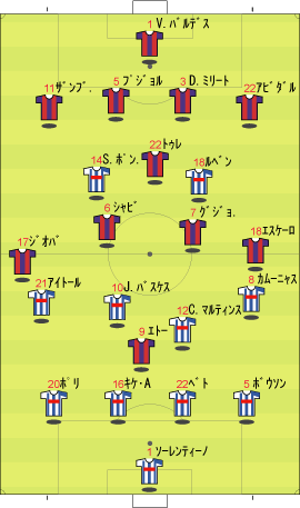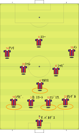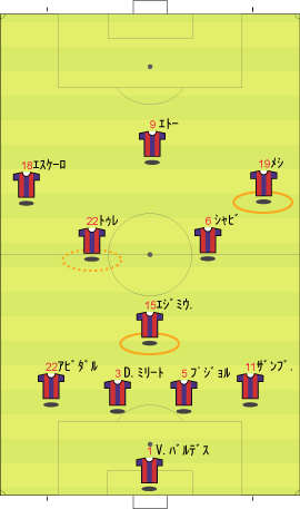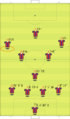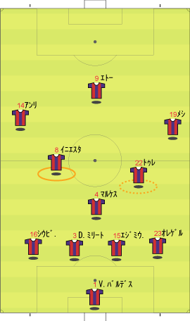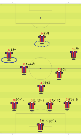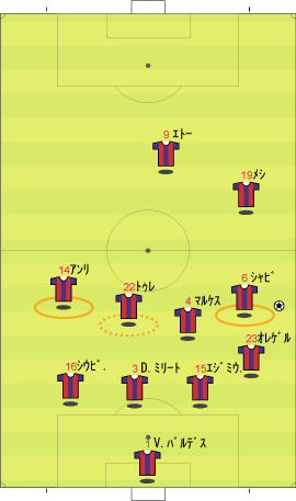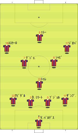 「絶望的やな」 「何が」 「マドリーにまた2ポイント差をつけられて、残り6試合で9ポイント差。ほぼ絶望的な数字になっている」 「そっちか」 「他に何がある」 「プレー内容のことかと思ったんやけどな」 「内容的には、今後に向けて転換点になりそうな試合やったから、絶望的ではないと思うで」 「さよか」 「まずは先発やな」 「この図から、バルセロナだけを抜き出して上下を逆にすると、次のようになる」 「まあいつものバルサというかなんというか」 「メシ、アンリ、イニエスタがいない時の形やな」 「その代わりに、ジオバンニ、エスケーロ、グジョンセンが入っている」 「ところが、65分に交代が行われて、下の形になる」 「ほう」 「これはこれは」 「ついにトゥレが前に出たのか」 「これは、バルサのバランスを回復させるのはこれしかないから、4ヶ月前から見てみたいと思っていた布陣なわけや」 「まあ、トゥレは技術的にも性格的にも前の方が向いてるしな」 「その結果は上々だった」 「上々だったといっても、この交代の後に同点に追いつかれたわけだが」 「あれはハイボールに対する目測を誤ったバルデスの個人的なミスで、中盤のバランスとしては明らかに良くなっていた」 「そうかね」 「トゥレがこのポジションに入ると、特に攻めた後の守備が格段に安定する」 「まあ、ボールに体を寄せていけるからカウンターの出所を潰す能力は高いな」 「おまけにハイボールに対しても抜群に強いから、これまでバルサが苦手としていたロングボールによる飛ばし攻めにも強くなる」 「グジョンセンやイニエスタ、シャビよりも強いのは間違いないわな」 「この形からアンリが帰ってきたとなると、次のようになる可能性が高い」 「順当な配置やな」 「ところが、このままでは、下の場所に問題が出る」 「守備か攻撃かで言えば、攻撃に問題が出るな」 「いわゆる組み立てに難がある」 「その辺を思い切れば次の形がええかね」 「これはまた思いっきりやな」 「とにかくボールをさばけたらええという配置や」 「他のバランスは考えへんのかいな」 「3トップ系のシステムというのは、両ウィングにいい形でボールを渡さないと意味がないから、その意味ではこれが最高やな」 「矛盾はないといえばないけどな」 「もう一つの形としては、下の図も考えられる」 「イニエスタを左、トゥレを右に置くのか」 「この時の攻め筋は、次のようになる」 「左からか」 「左のアンリを引き金にする場合、マルケス、エジミウソンでそこにボールを送り、ドリブルを開始、エリアの角辺りで仕掛けて、縦に出た場合はエトー、メシ、トゥレがつめる。中に切り返したら、シュートもしくはイニエスタに渡して斜め奥にパス」 「パターンやな」 「いいパターンをいかに多く出すかというのは大切やからな」 「右から行くとしたら下の感じか」 「ガビ・ミリートとマルケスがメシに送って、中へドリブル。スルーパスにエトー、逆サイドへのパスをアンリ、後ろに戻してトゥレやな」 「それにワンツーを加えたり色々やな」 「これはこれでメシを十分に活用できる」 「この試合では、その点がいまいちやったしな」 「トゥレがエトーの後ろに入ってたな」 「普通のチームなら、サイドに開いて空いた中央に後ろから入るというのは非常にいいプレーなのだが、バルサの場合は違う」 「それをやってしまうと、メシがドリブルで入るスペースを味方が潰してしまうんやな」 「彼の一番得意なプレーを自分たちで消してしまってはつまらない」 「守備では下の形がええな」 「メシはなるべく下げずに、左サイドを下げた方がいい」 「メシは前に残ってこそ価値がある」 「ただ、それをやるとアンリの体力が持たないことは証明されている」 「3節がそうやな」 「そうなると、エトーに頼るしかない」 「左サイドを交代しつつ試合を進めるわけやな」 「これは、ロナウジーニョが左にいた時代も良く行っていた」 「負けたくない試合では、先発からこうなることも多かった」 「ただ、ここで問題になるのは、左サイドを下げて守るなら、下の形の方が良さそうなことやな」 「シャビを右にして、トゥレをマルケスの左に引くのか」 「この方が明らかに中央が固い」 「となると、この形か」 「中盤をシャビ+トゥレで組むか、トゥレ+イニエスタで組んだ方がいいかは実際にやってみないとわからない」 「理屈はあくまでも理屈やからな」 「ただ、理屈は大切で、これまでのバルサは理屈的にもダメで、やっぱりダメだった」 「マドリーもそうやな」 「なんにしても、チャンピオンズリーグの4強に残ったことが奇跡というか、驚愕すべき事実に近いバルセロナにとって、これから先に進むには、トゥレを上げるしかないやろな」 「今までの方法では、いつまでたっても前後がバラバラやしな」 「上の形をベースにして調整していくしかないと思うんやけどな」 「はたして、今後どうなっていくのか」 