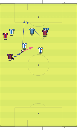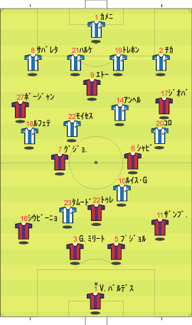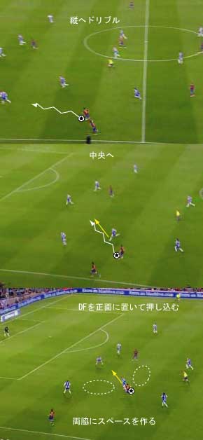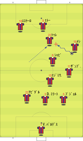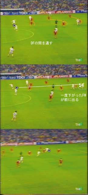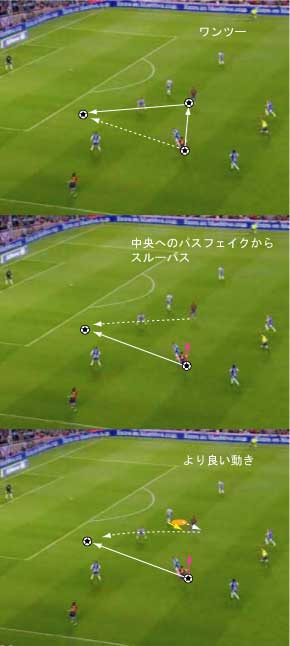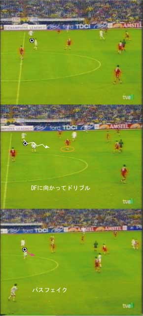 「バルサは今節も勝てなかった」 「先発はこうやな」 「バルサはイニエスタやメシを温存か」 「水曜日にマンチェスター・ユナイテッド戦があるからな」 「おまけに、前回に見たトゥレを前に上げるバリエーションはまたもおあずけやな」 「残念ながらそうやな」 「もしかしたらマンチェスター戦に温存しているのかもわからんぞ」 「それやったら嬉しいけどな」 「エスパニョールは、リエーラが出ていない」 「ベンチスタートで後半には出てきた」 「スペイン代表に選ばれた頃の彼は実に自信に満ち溢れていて、一つ一つのプレーが確信に満ちていた」 「最近は、今ひとつ攻めていけないというか、無難なプレーに流れがちやな」 「何があったんやろな」 「タムードも怪我以降いまひとつで、3人の内2人が思わしくない」 「監督も頭の痛いところや」 「それはさて置き、この試合では一つ面白いプレーがあった」 「なんや」 「下のプレーやねんけどな」 「絵が小さいな」 「見にくい場合は、写真を押すと拡大されます」 「イニエスタが、ディフェンスに向かってドリブルをして、中央を押しこんだ場面やな」 「その通り」 「これがどうした」 「この、相手に向かってドリブルをする、という行動は、上手い選手と下手な選手の分かれ目であるわけや」 「前にもそんな話があったな」 「相手に向かう効能というのは、進行方向の両脇にスペースを残すことで、このスペースを自分の都合のいい場所に作れば、次のプレーが楽になる」 「それが上の最後の写真やな」 「実際のプレーは、次の写真の一番上のように進む」 「中にはたいてワンツーか」 「これは良くある形なわけや」 「この場合の常道と言ってもいいくらいやな」 「ところが、実は、2番目の写真のパターンも非常に有効なんやな」 「スルーパスか」 「このプレーを行うには、パスを受ける選手の動きが重要で、写真のように最初から浮いておくよりも、わざとディフェンスにマークをされやすい位置から少し下がる振りをして、縦に抜けた方がいい」 「要するに、下がることでマークを釣り出し、その裏を取るわけやな」 「模式的に書くと、下の形やな」 「ふむ」 「実は、相手がゾーンディフェンスの場合、このような形で、中盤の守備者を中央に向かって押し込んでいくと、縦にスルーパスが出る状況になりやすい」 「この手のスルーパスは、ジダンやデ・ラ・ペーニャの得意技やな」 「それが次の図やな」 「ジダンか」 「ジダンで、試合は、チャンピオンズリーグに勝った年のホームでのバイエルン戦や」 「ちょっと古いな」 「まず、一番上の写真ではサイドラインに近い位置でボールをもらう」 「次に中央を向いて、一番近いディフェンダーに向かってドリブルを開始するわけやな」 「これは、実はあまり普通の行動ではない」 「周囲に十分スペースがあるのに、わざわざ相手との距離を縮める必要はないな」 「実は、その狙いというのは、次の図でわかる」 「デフェンスの間を通すパス狙いか」 「この場合、一番上に示された3つの間を一発のパスで通すことを狙っている」 「いわゆる門狙いというやつやな」 「これが、”中盤の守備者を中央に向かって押し込んでいくと、縦にスルーパスが出る状況になりやすい”という文章の具体例なわけや」 「最初からゾーンの間を狙わず、そこを狭める選手に向かってドリブルすることで動けないようにして、おもむろに間を通すわけやな」 「おまけに、後ろの選手はカバーリングのために中央に動くから、縦にパスが通りやすい状況が生まれる」 「パスを出す方はそれでいいとして、受ける方もその意図をわかっていないとあかんな」 「それが2枚目の写真で、一度戻る動きをしたフォワードが、縦に出ることでこれを受けようとしている」 「ラウールやな」 「この場合、ラウールは、ジダンが中央へドリブルをした時点で、このパスを予想していたと思っていい」 「ほんまかいな」 「そうじゃないと、こうもいい場所に、こうもいい動きで入り込むのは難しいで」 「以心伝心か」 「出すも出したり、受けるも受けたり。両者ともに、匠の技というわけやな」 「でも、これは手筋として使えるな」 「ボールを持った選手が、中央の守備者に向かってドリブルをして、中へのパスフェイクから縦にスルーパス。この時、フォワードは一度下がってから縦に抜ける」 「これさえ知っておけば、タイミングを合わせるのはわりと簡単やな」 「皆様も一度試してみられてはいかがかと」 「ただし、最初の部分、つまり、相手に向かってドリブルを仕掛ける、ということができないと絵に描いた餅になるで」 「そこは、普段のミニゲームやらなにやらで、ボールを持ったら必ず一番近いディフェンダーに体を向けて相手を止める。といった行動を繰り返して度胸と技術を身につけて行くしかない」 「その辺りも試していただければというところで」 「また次回」 「ごきげんよう」