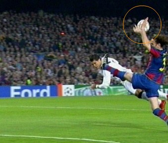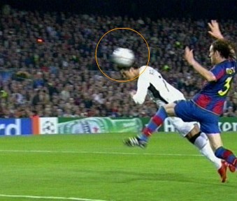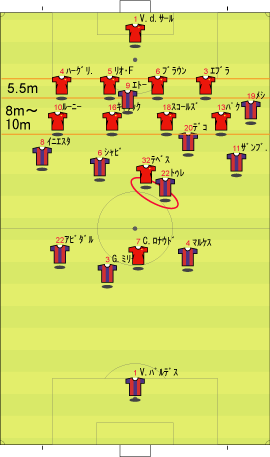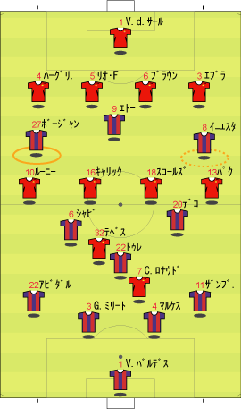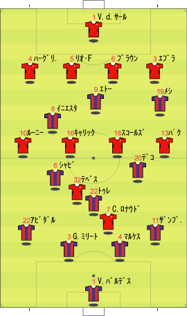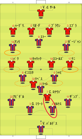 「向こうは1-1、こちらは0-0か」 「残念ながらバルサはホームで得点することができなかった」 「そのかわりといってはなんだが、アウェーゴールを失ったわけでもない」 「それは心強い点ではある」 「とりあえず先発はこうやな」 「この形から、マンチェスターはとにかく守りを固めてきた」 「ディフェンスライン非常に低かったな」 「下の感じか」 「バルセロナがボールを持つと、全体を下げて最終ラインはペナルティーエリアの前、5.5m付近に形成されていた」 「いわゆる半月マークの少し上辺りやな」 「そして、中盤の4人のラインはその8mほど前」 「これは、守備を敷くゾーンとしては、一番下がった形になる」 「これ以上下げると、ペナルティーエリアにかかってしまうからな」 「例えば、普段のリバプールだと、相手にプレッシャーをかけていくのがハーフライン付近で、最終ラインはピッチの広さにもよるけれども、ペナルティーエリアから15m以上離れた場所にある」 「マンチェスターとしては、バルサのフォワード陣、エトーとメシが裏に出るスペースを与えたくなかったんやろな」 「うまいことラインの裏にパスを落とす選手も多いしな」 「そして、引いて4-4のラインを作った前でテベスがトゥレをマークする」 「半分マンツーマンのような形で、まずトゥレに張り付いてパスレシーブを邪魔した後、パスコースを切りながらボールに詰める形やな」 「そして、その前ではクリスティアーノ・ロナウドが一人ぼっち」 「基本10人で守って、カウンターからロナウドの一撃を狙う、実にわかりやすい作戦やな」 「しかし、最近の傾向からして、ここまでべったり引くチームは珍しいで」 「確かにな」 「それを崩す立場のバルサは、今シーズンで一番ボールが回っていた」 「下の形か」 「まず、点線で囲まれたゾーンで実によくボールが動いた」 「ユナイテッドが引いていたから、そこにスペースが空くのは当たり前といえば当たり前やな」 「かつ、左サイドにいたイニエスタが、しばしば中央に入ることで、守備のバランスを崩していた」 「相手の方は、ゾーンをまたいで動くイニエスタを捕まえきれてなかった」 「そして、マルケスからゾーンの間を突くパスもよく決まっていた」 「プレッシャーもかけられてなかったしな」 「それにしても、彼はもともと組み立ての上手い選手なのに、今シーズンは変なミスが多かったやろ」 「それはそうやな」 「久しぶりにさばくマルケスが戻ってきて、非常にいい具合だった」 「ただし、彼を使うと、クリスティアーノ・ロナウドに対してスピードのミスマッチが生じるのが問題ではある」 「とはいっても、バルサは後ろからのパスが安定しないと力が半減するから彼は大切やな」 「そういえば、後ろからのパスといえば、ミリートがマルケスに頼りっきりだったのが気になるところではある」 「彼は緊張しいやからな」 「緊張しいというか、プレッシャーのかかる状況になればなるほど絶対にミスを犯さないようにプレーするから、パスがどんどん縮こまっていく傾向にある」 「一般的に組み立てが上手いという評価を受けているけど、その点が不安なところやな」 「サラゴサでも隣にセルヒオがいると任せっぱなしの場面が多かったしな」 「この試合でも開始早々ものすごいハンドでPKを取られた」 「あれは緊張と関係あるのかね」 「ないのか」 「ちょっと意味のわからんプレーではあったけどな」 「ちょっとどころじゃないやろ」 「下の感じやな」 「写真は前回に引き続き、エル・ムンド紙のものだが」 「ほんまに、ものすごいハンドやな」 「これが開始1分という恐ろしさ」 「しかし、退場にならんでよかったと思うで」 「ボールが枠に飛んでたら、確実に退場やな」 「なんにせよ、マンチェスターにPKが与えられてキッカーはクリスティアーノ・ロナウド」 「絶体絶命の大ピンチ」 「守るはバルデス」 「コースを読んで右に飛ぶ」 「ところがボールは無常にも左へ」 「これはいかんと思いきや」 「枠を外れてあらぬ方向へ」 「バルサは九死に一生を得た」 「これは大きかった」 「正に大きかった」 「点数が入らなかったこともそうだが、クリスティアーノ・ロナウドをのせなかったという点でも大きい」 「今の彼に気分良くプレーされたのでは止めようがないしな」 「結局、0-0で進み、61分にバルサが先に動く」 「メシを代えてボージャンか」 「ボージャンが左、イニエスタが右に入る」 「これはどうだったかという話やな」 「相手を崩す最初のとっかかりを作っていたのは、左からのイニエスタだっただけに、それを移動させたのはどうかということやな」 「ボージャンを右、イニエスタを左でよかったはずや」 「その15分後には下のようになる」 「デコが外れてアンリが入り、左にアンリ、右にボージャン、イニエスタは中盤に下がる」 「デコは久しぶりの実戦にもかかわらず十分な働きだった」 「ただ、ここで注目なのは、